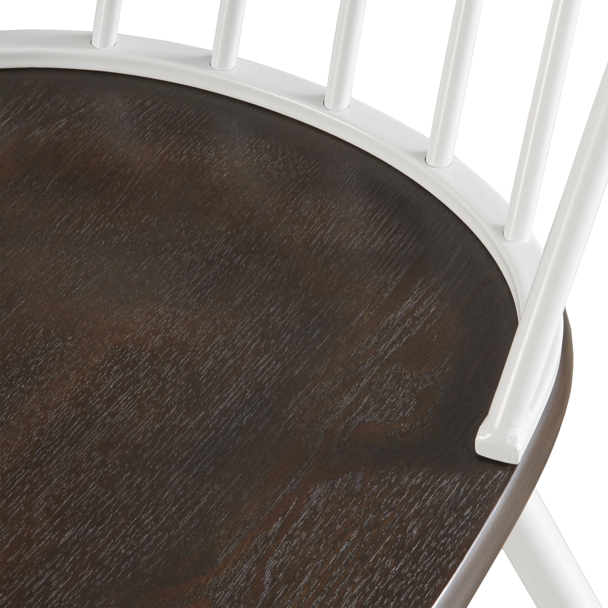 Set includes four (4) chairs Crafted of MDF, Ashwood, oak veneer Frame Finish options: Black, white Brown oak finish molded seats Subtly tapered legs Windsor back chairs with a modern twist Seat dimensions: 17 inches high x 19.5 inches wide x 18.1 inches deep Overall Chair Dimensions: 38.75 inches high x 19.5 inches wide x 23.25 inches deep Assembly required