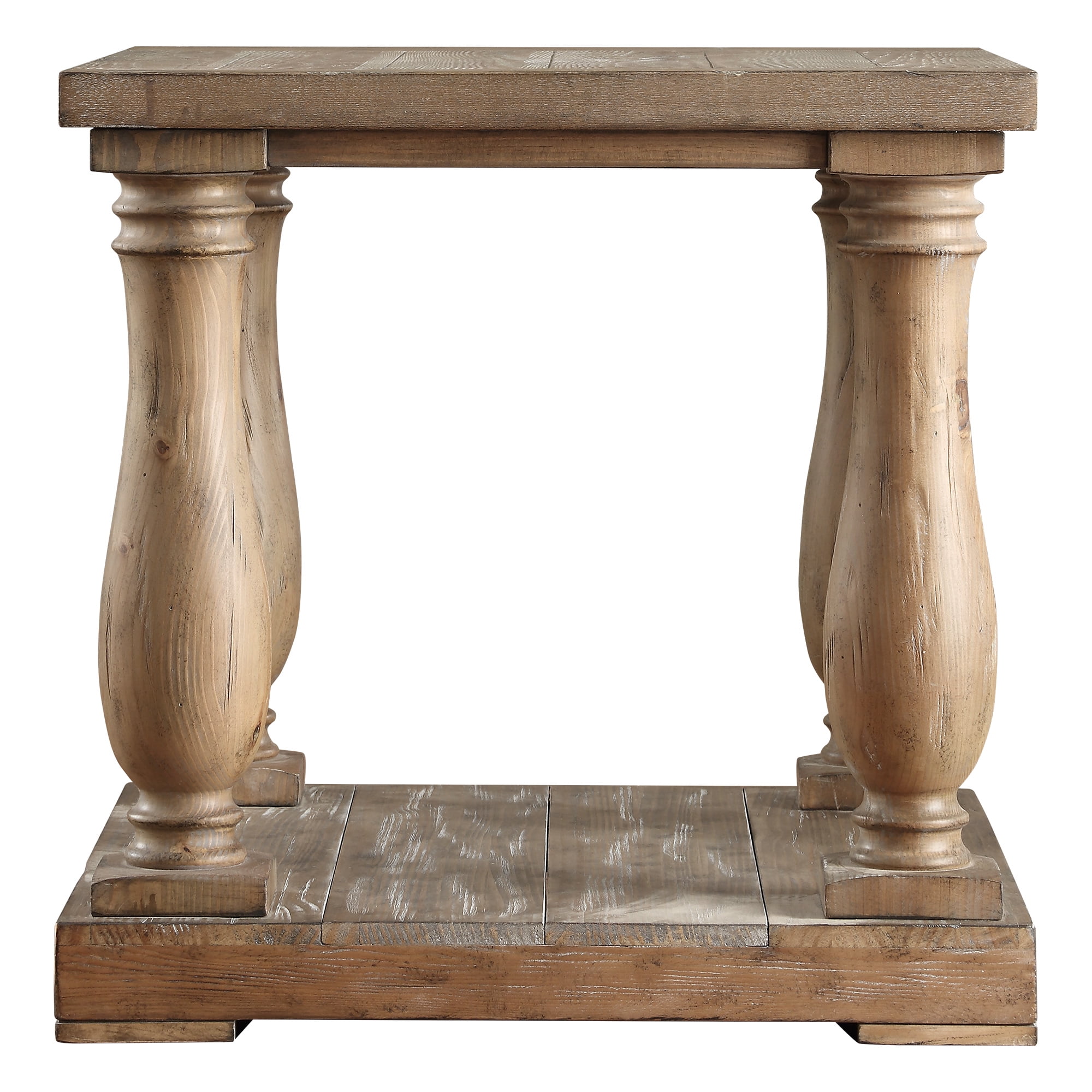 This end table is not only rustic and fashionable but functional. The veneered surface gives this end table a stunning unique look. The baluster table legs add a rustic design element to the end table. This Dunbar collection is a must-have addition to your living room, dining room, or even bedroom. The table features a lower shelf that can be used for additional storage or for a place to show off your favorite decor. The assembled table dimensions are 26 inches high by 26 inches wide and 28 inches deep.