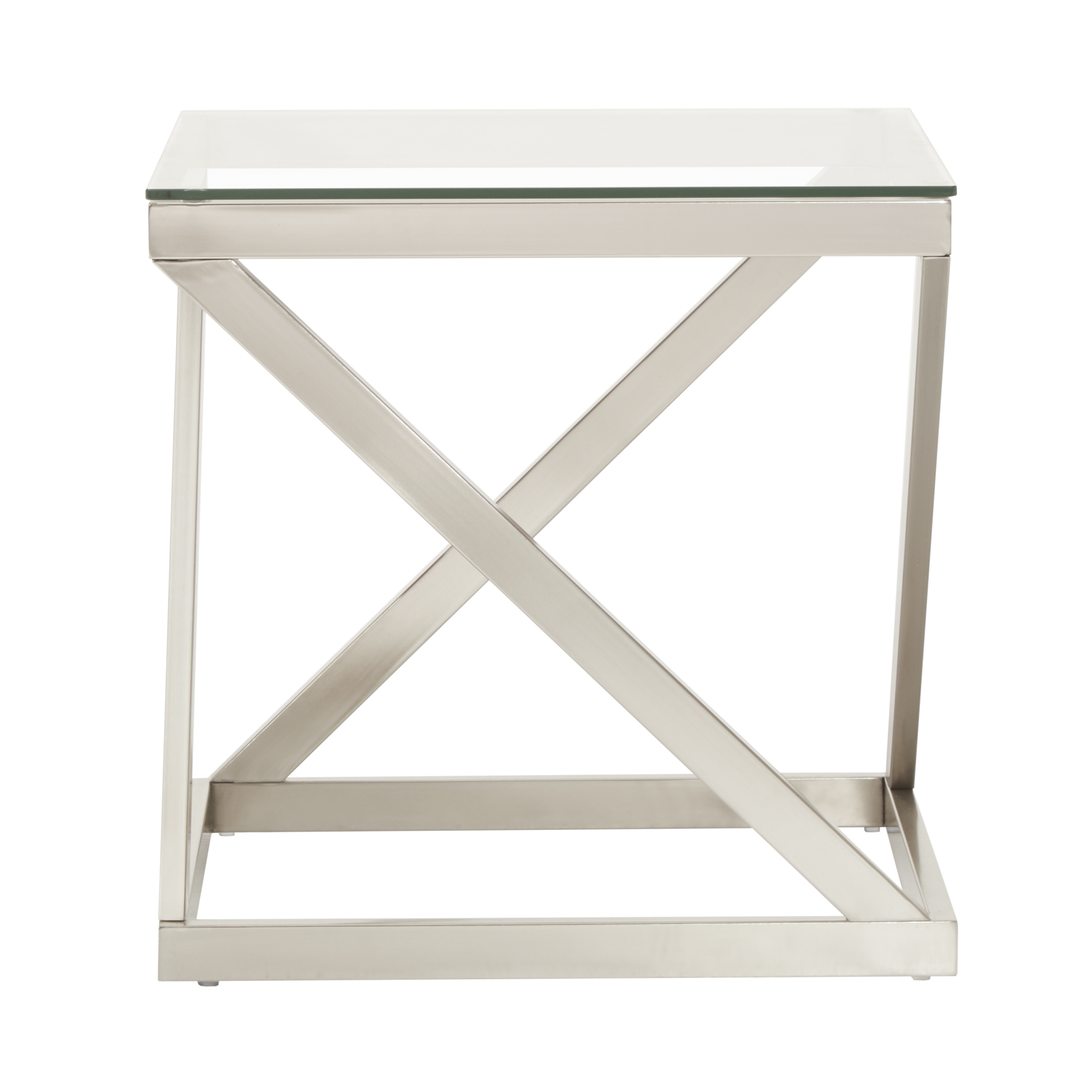 8mm tempered glass top Brushed nickel x-cross base Dimensions: 22L x 22W x 22H x in. Ships in 1 box Assembly required Includes one (1) End Table