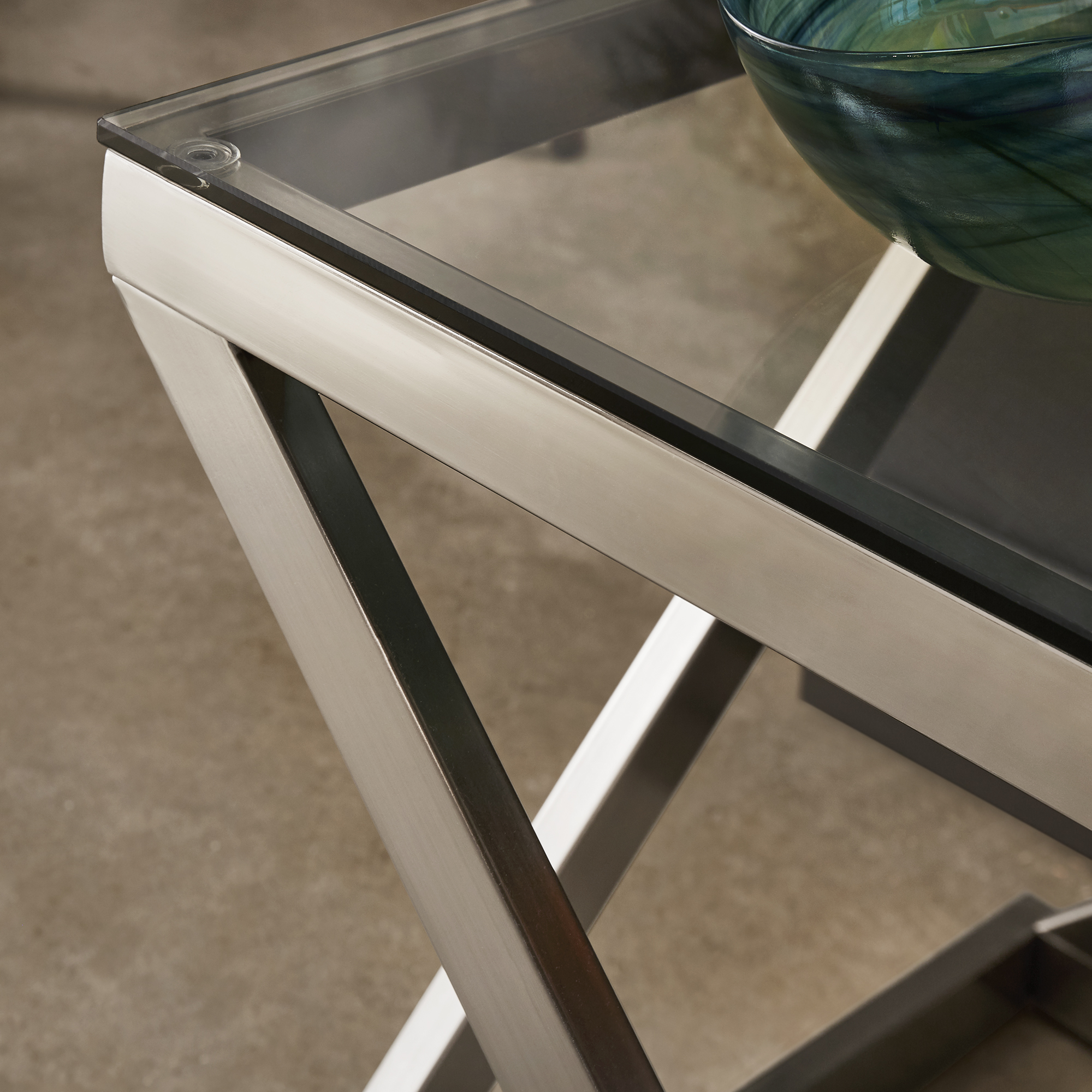 Beautiful and modern, the Erika brushed nickel end table adds unique style to your living space. Prominently display your home décor and accessories on top of the glass table top that adds simple, luxurious detail to the piece. An open style base features a visually attractive brushed nickel base that adds major style points and stability to the piece.