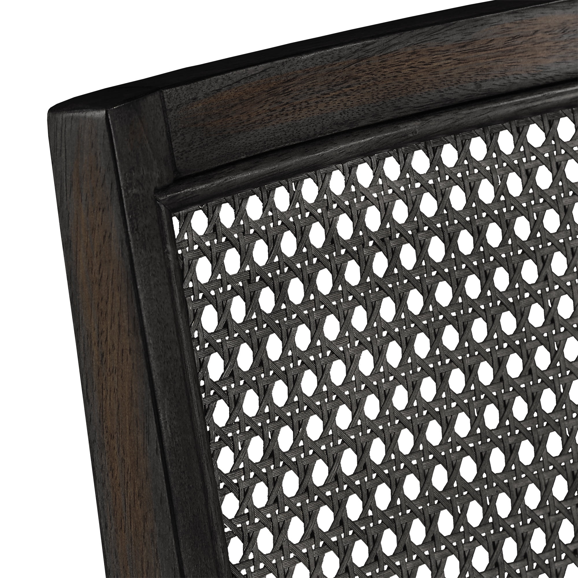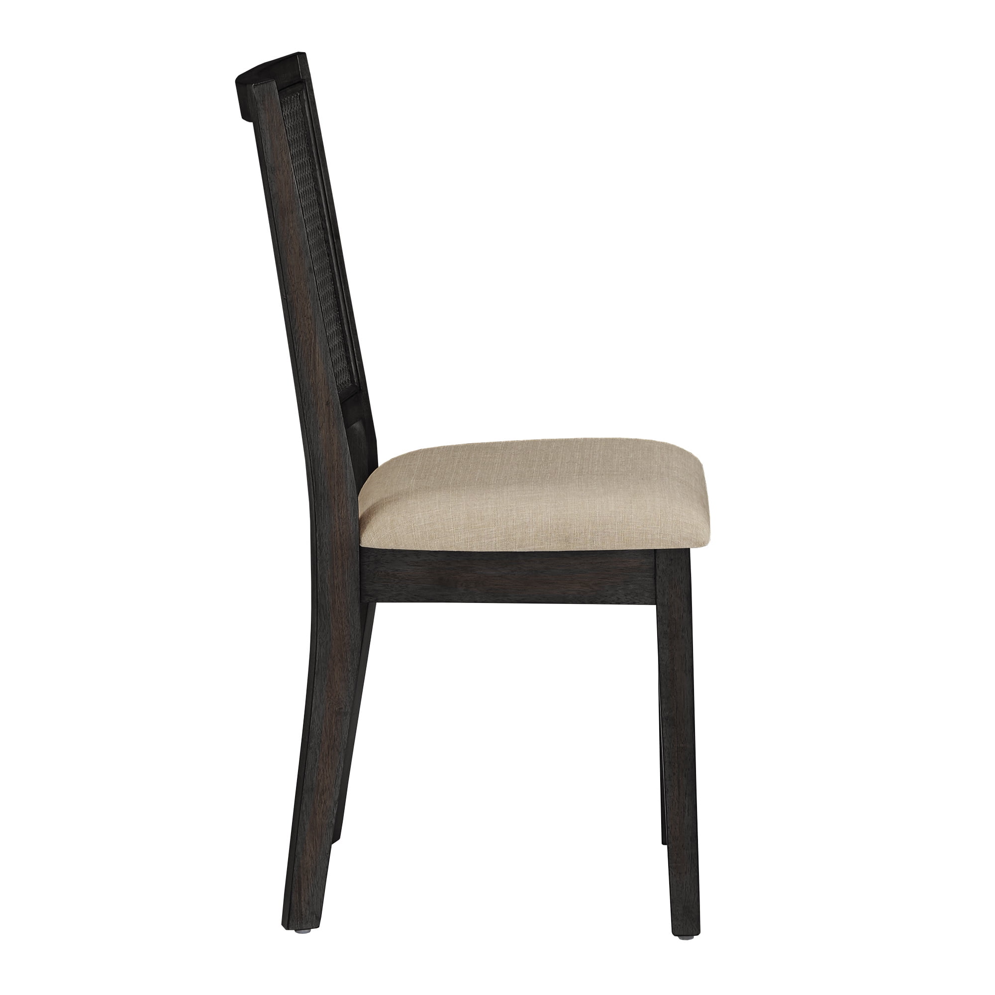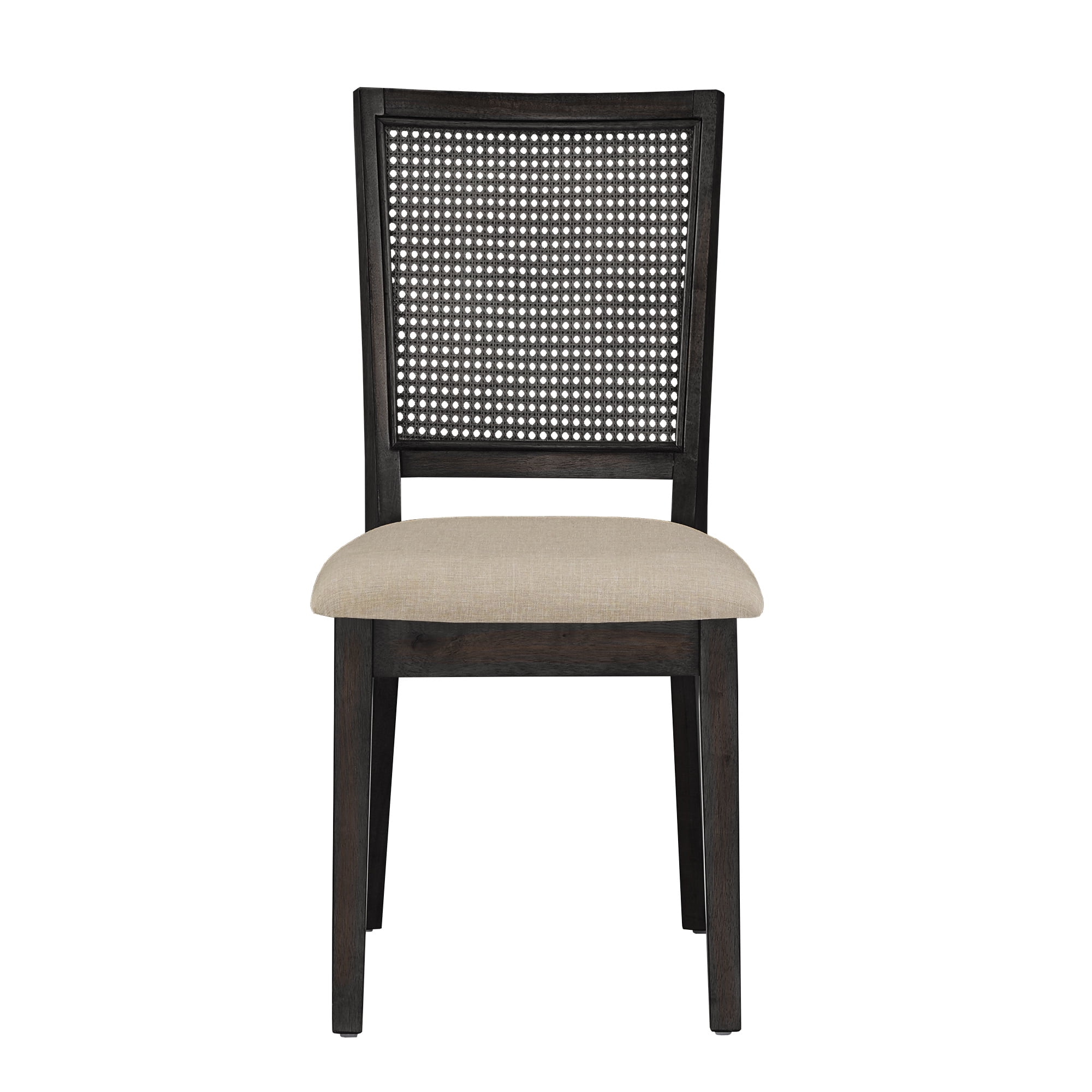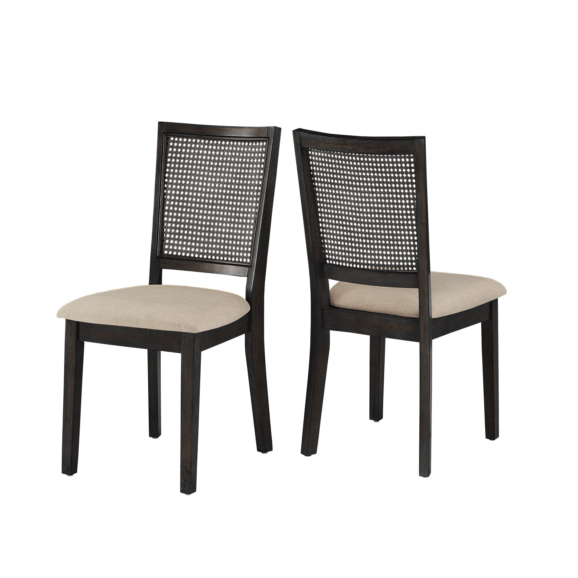 Set includes two (2) dining chairs Overall dimensions: 18 in. width x 22 in. depth x 36.5 in. height Beige linen-upholstered seats Synthetic rattan chair backs Distressed wood finish Multiple antique finishes for the frame Assembly required Ships in one (1) box