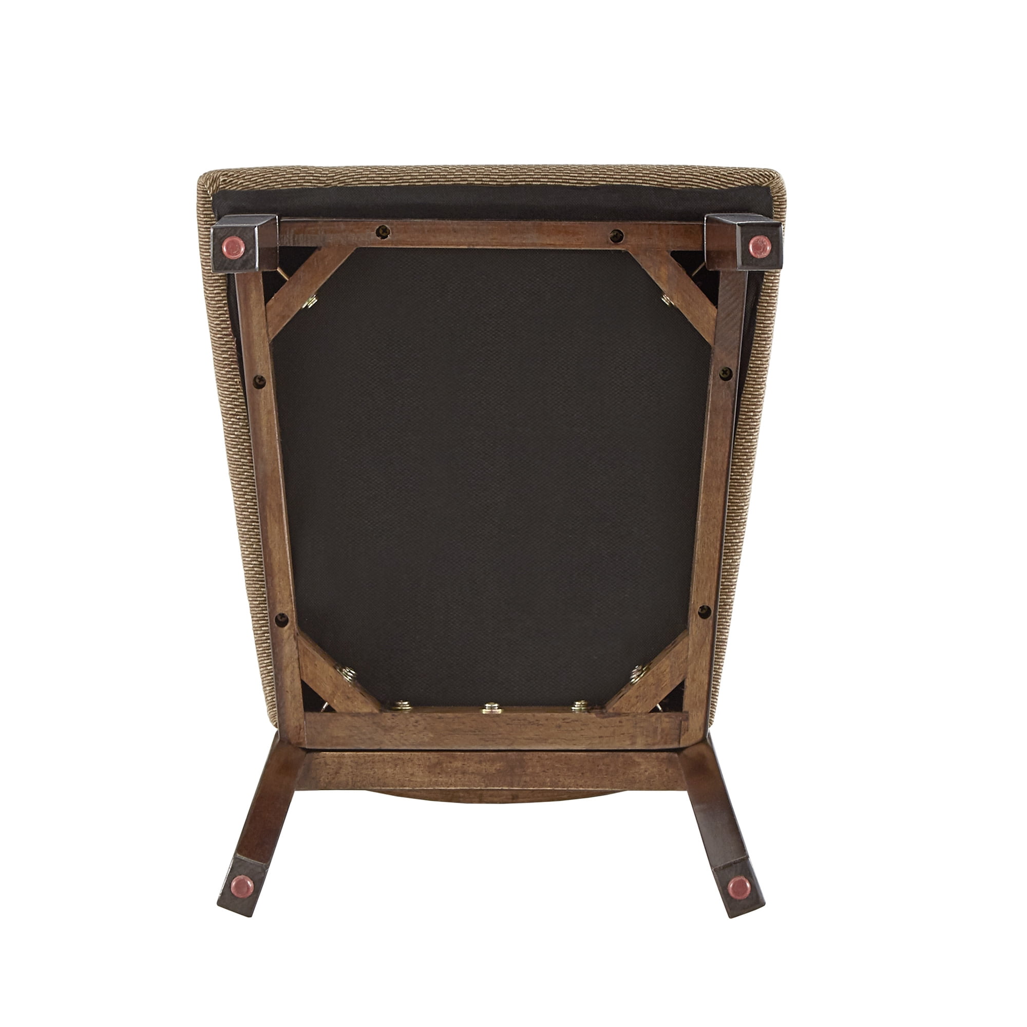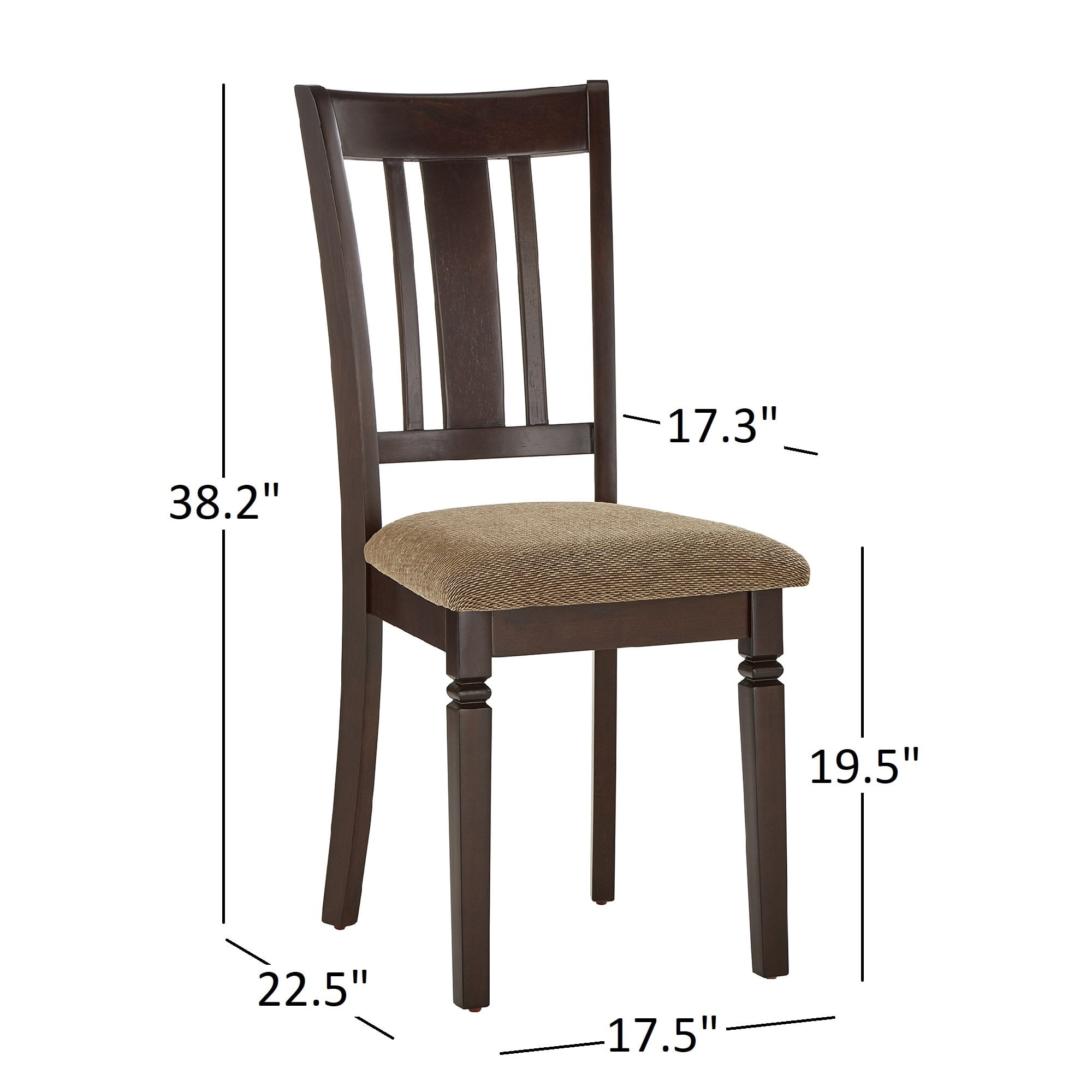 Overall dimensions: 17.5 in. width x 22.5 in. depth x 38.2 in. height Seat dimensions: 17.5 in. width x 17.3 in. depth x 19.5 in. height Set includes two (2) chairs Textured, tan fabric seats Espresso wood finish Slat-styled chair back Built with rubberwood, particle board, p2nt, foam, and fabric