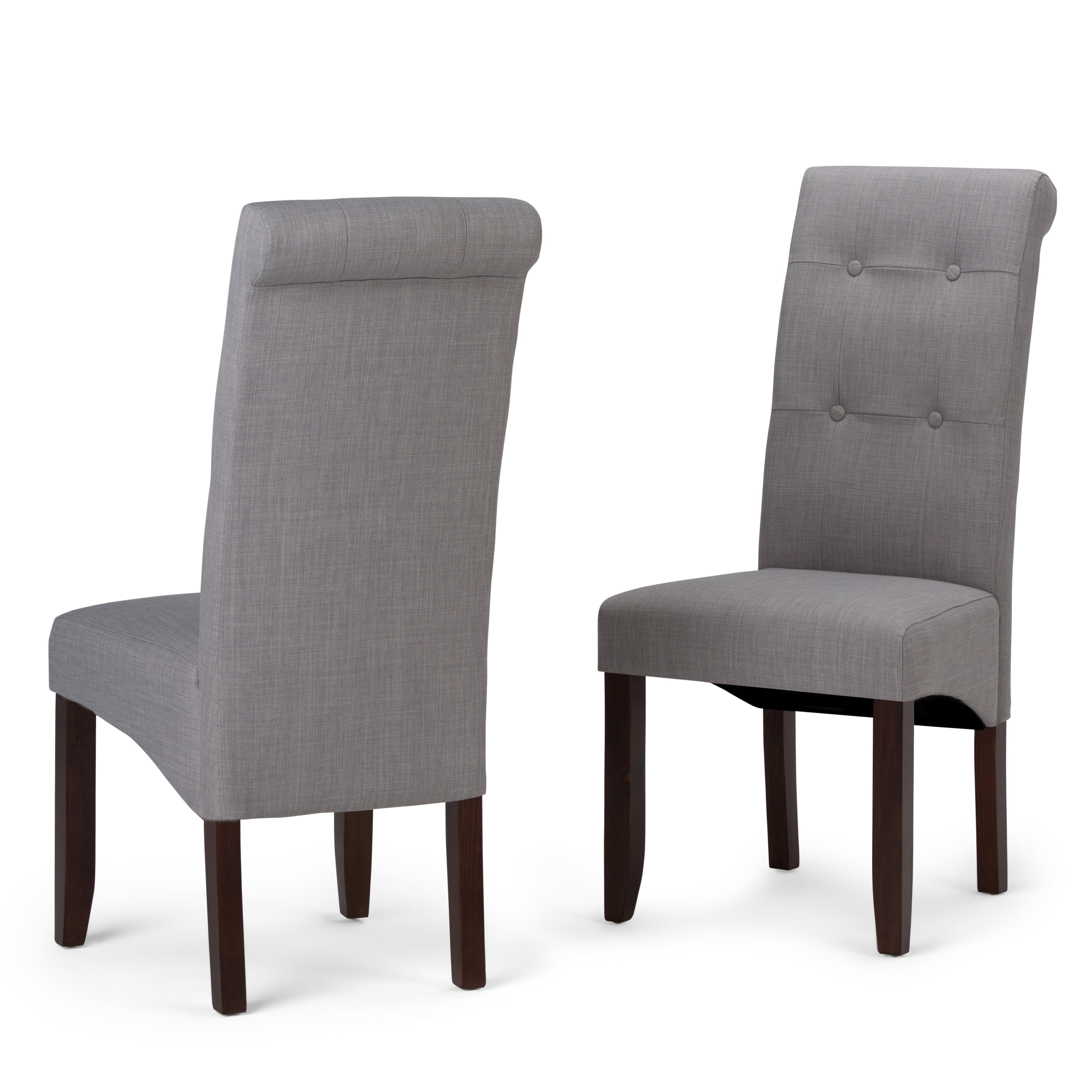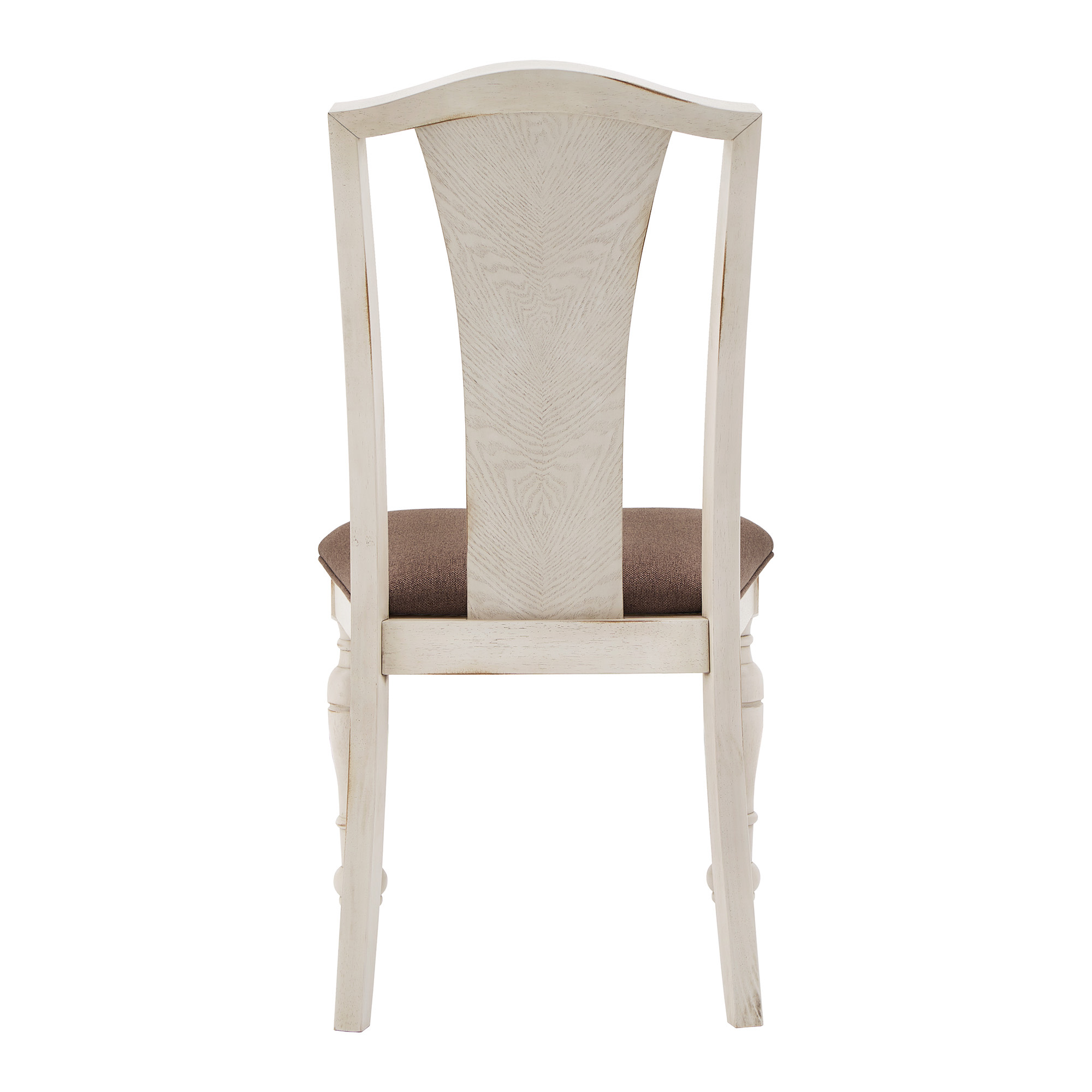 Seat cushion thickness: 2.75 in. Seat dimensions: 20.28 in. width x 17.64 in. depth x 20.09 in. height Overall dimensions: 20.28 in. width x 24 in. depth x 39.57 in. height Set includes two (2) dining chairs Crafted with rubberwood, mdf, and polyurethane foam pad construction Antique white finish frame Dark brown fabric upholstery