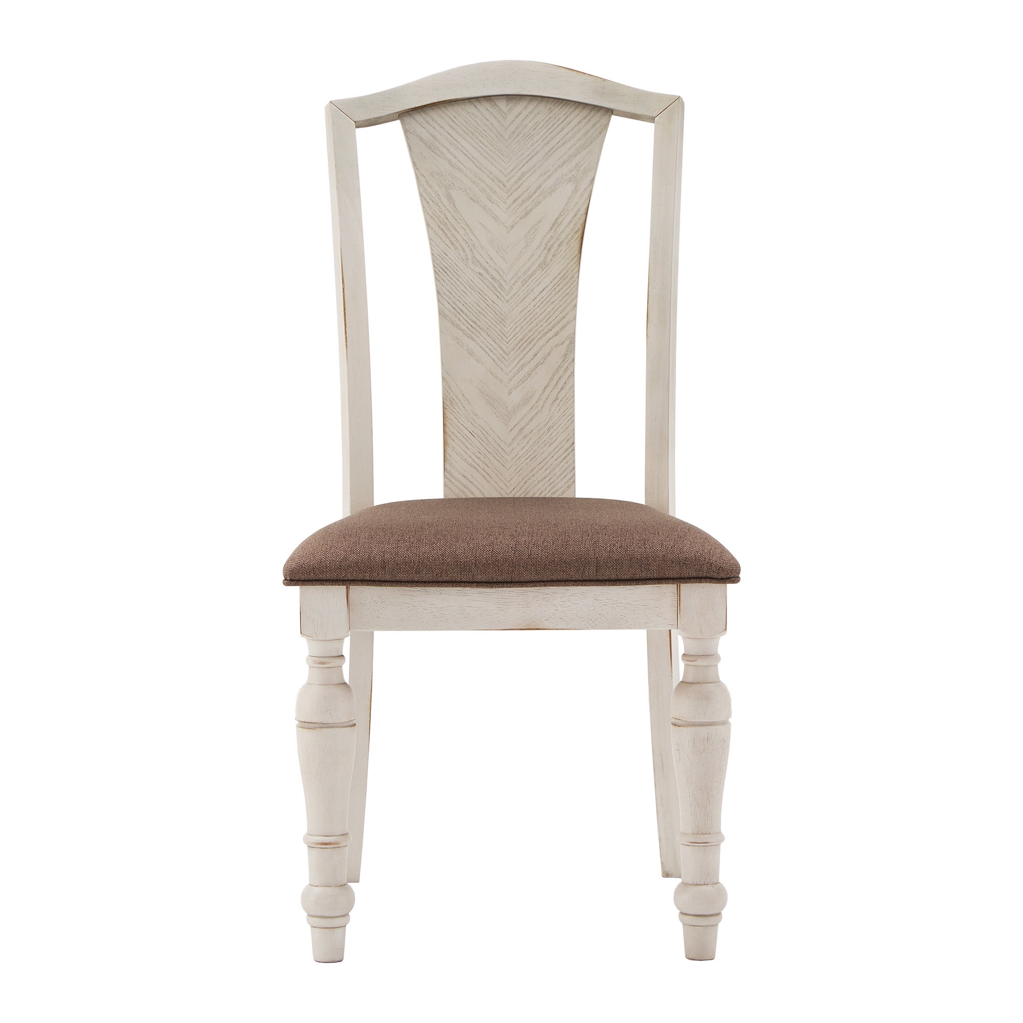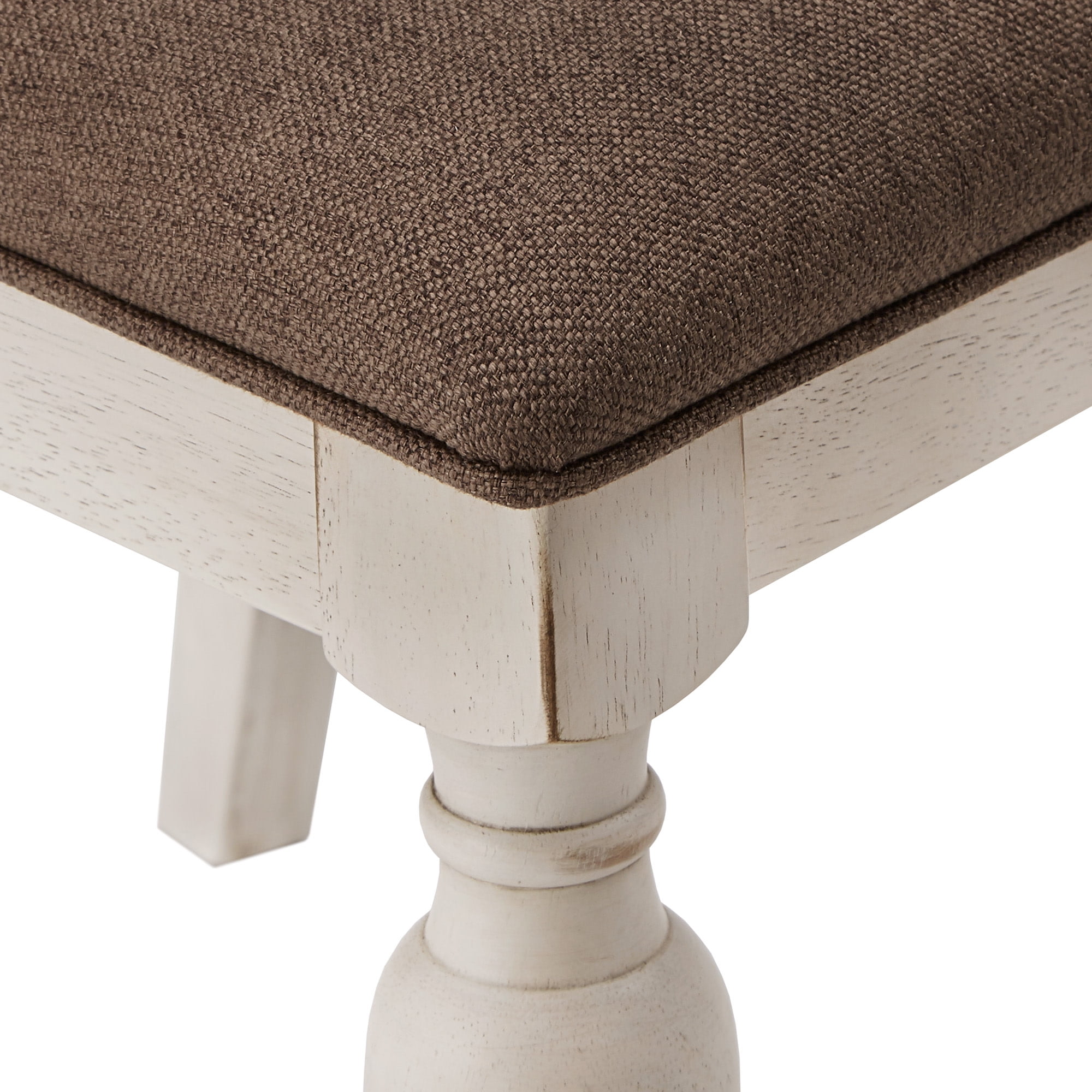 Weston Home | Bring a touch of rustic elegance to your home with this dual-tone Slat Back Solid Rubberwood Dining Chairs. The matching wood grain veneer slat back provides necessary back support. The antique-white finish frame paired with traditional turned legs adds a timeless touch to your decor. The padded seat with foam and upholstered in the dark brown fabric ensures lasting comfort at every meal. Whether you’re entertaining family and friends or cooking up a storm in your own home, these chairs will be both practical and chic.
