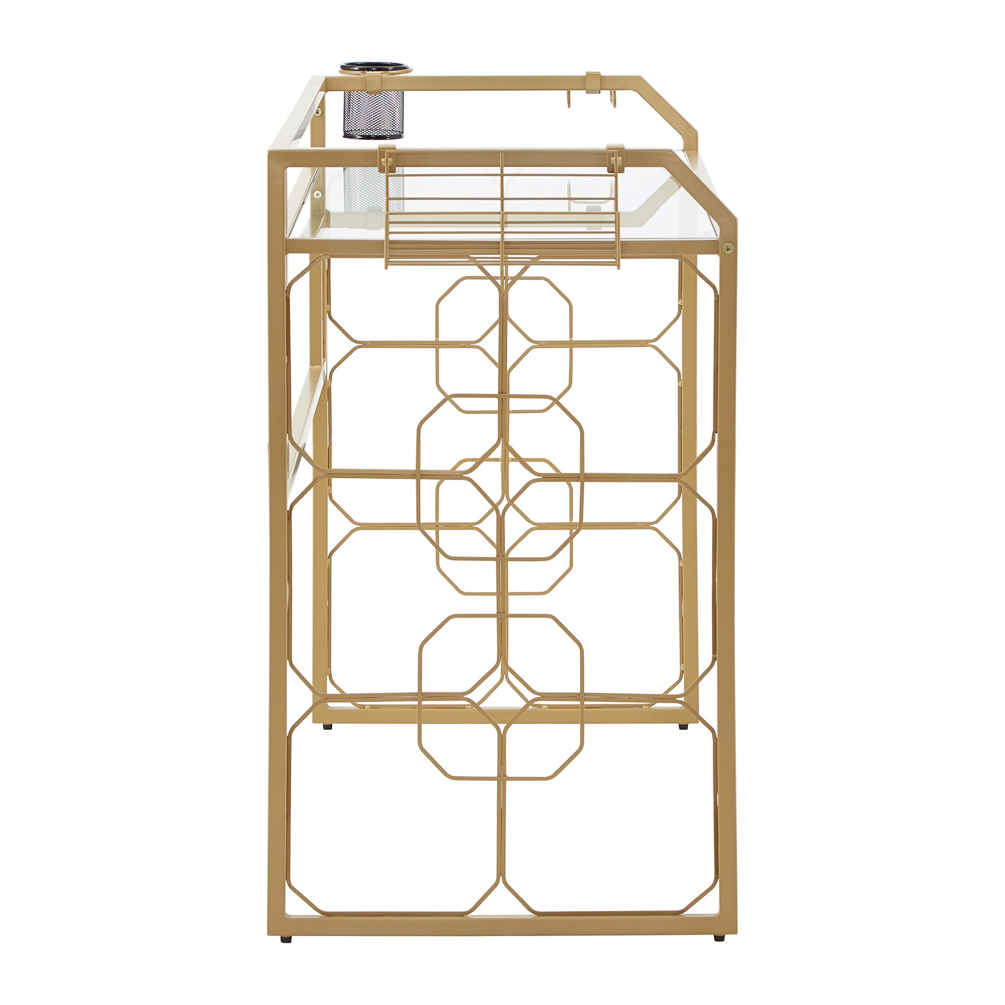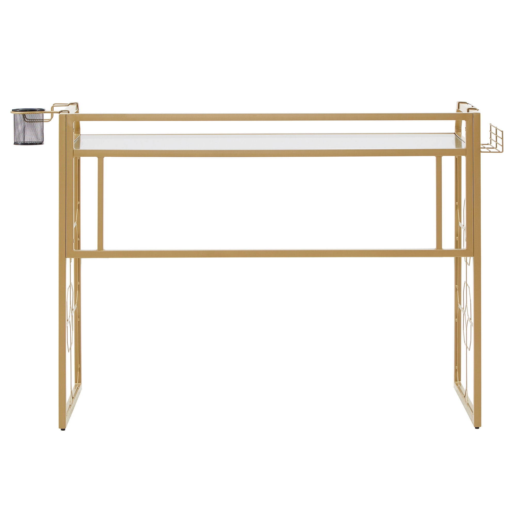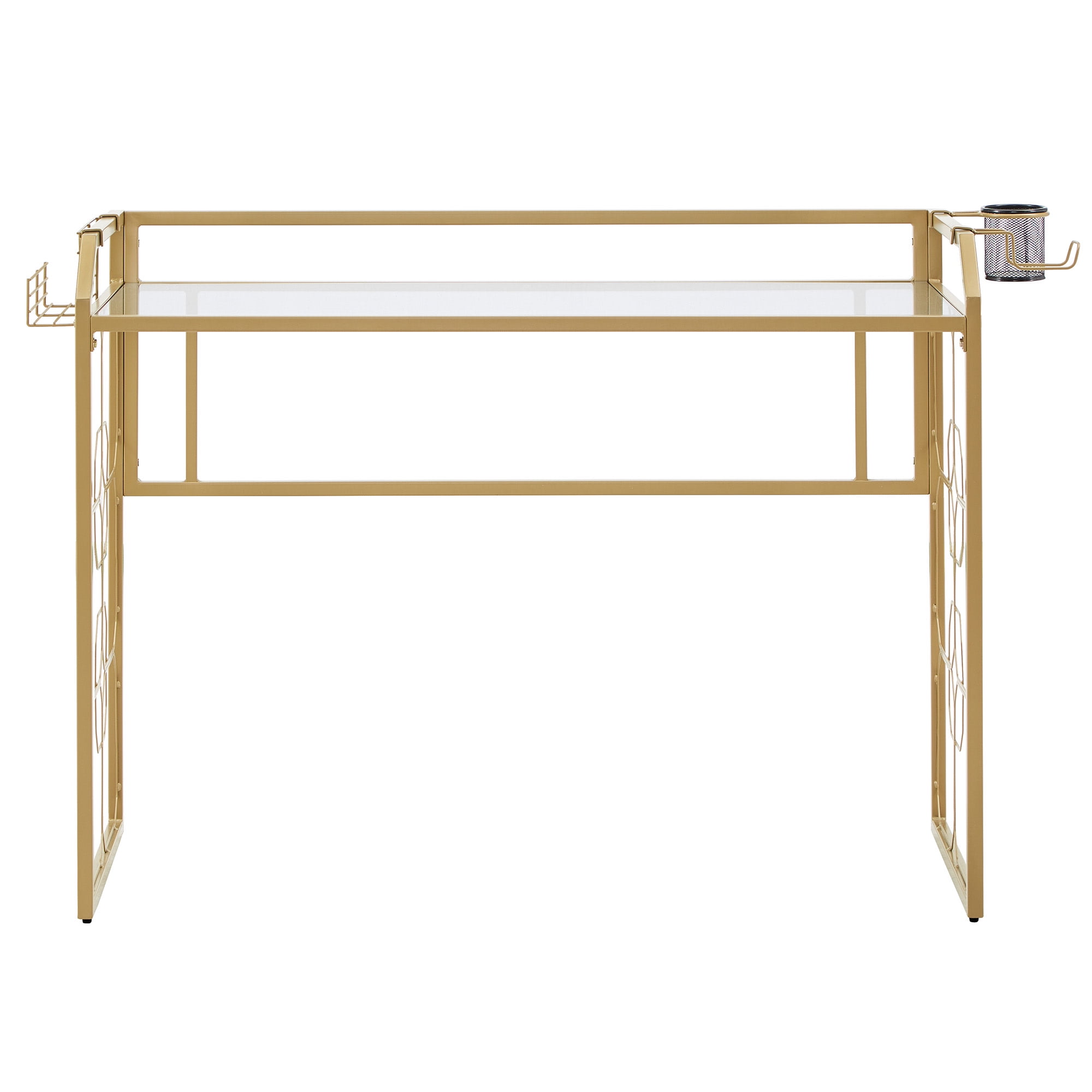 Includes one (1) computer desk Overall dimensions: 55.8 in. width x 22.66 in. depth x 33.9 in. height Comes with one (1) pencil/drink cup holder Accessories tray on the side for headphones and other small items Gold, powder-coated finish on a metal frame Clear, tempered glass table top Ornamental, octagonal design on the sides Built with 8mm clear tempered glass and iron Ships in one (1) box Assembly required