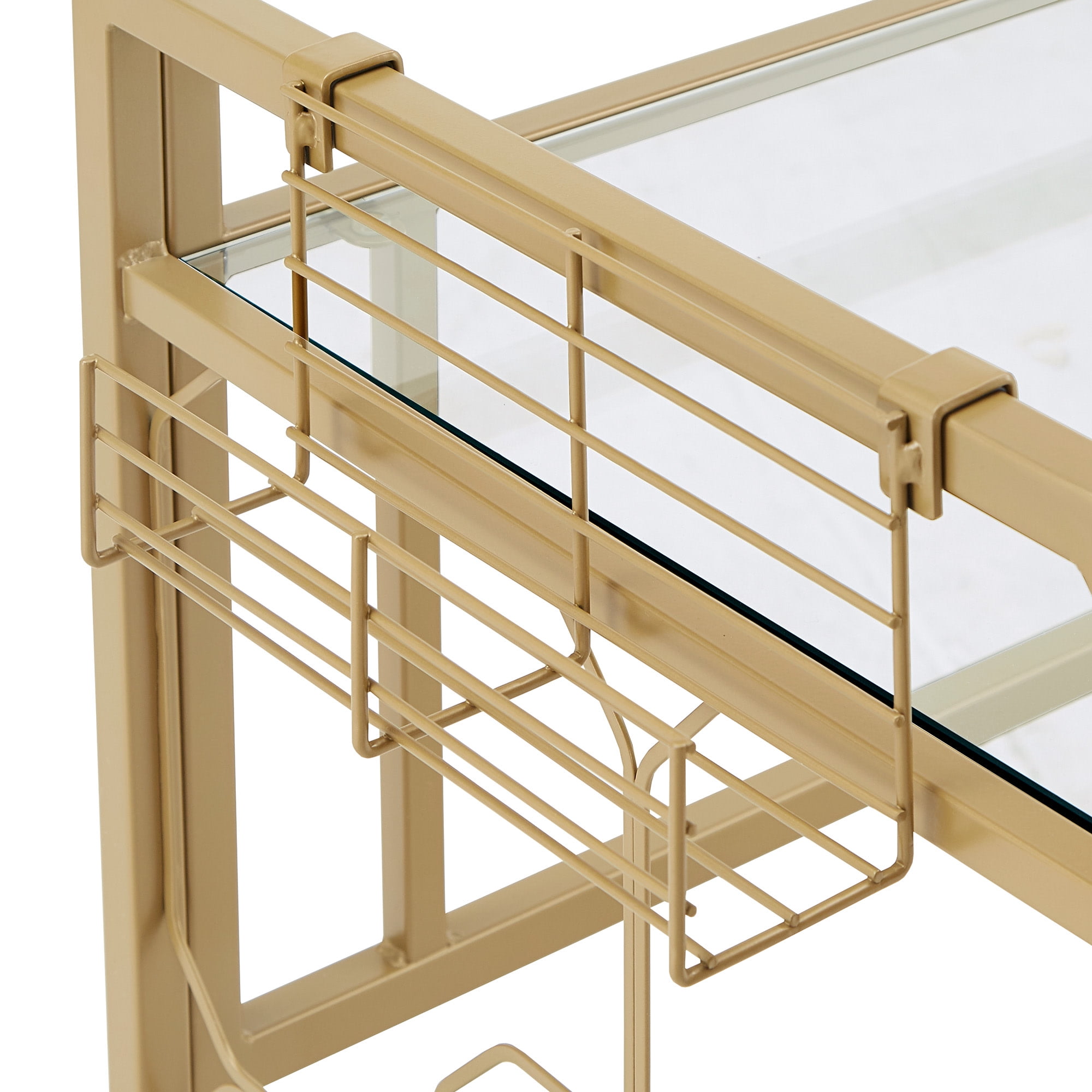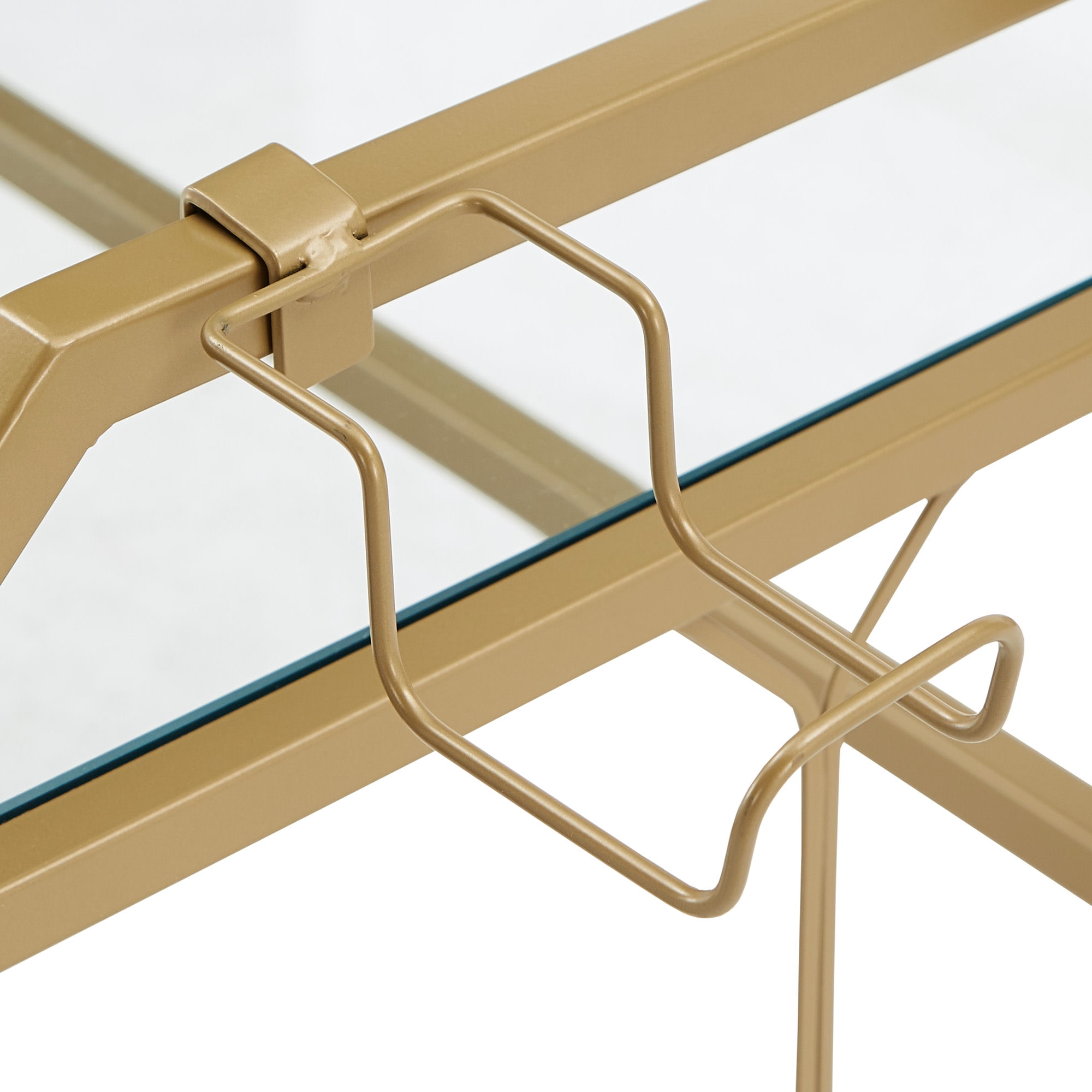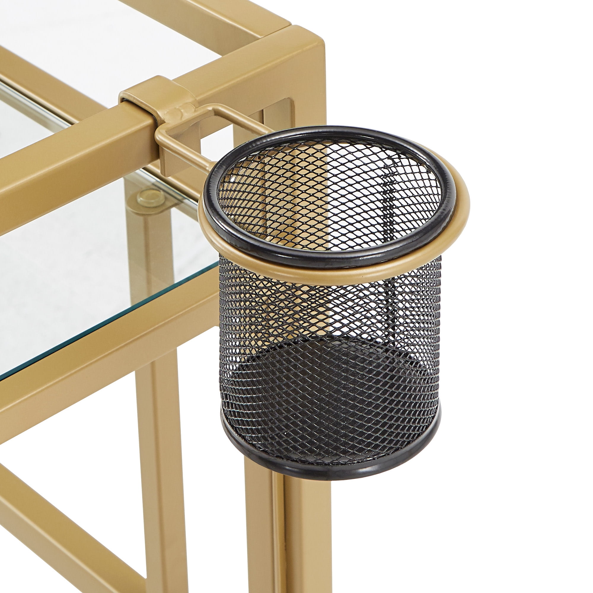 Includes one (1) computer desk Overall dimensions: 55.8 in. width x 22.66 in. depth x 33.9 in. height Comes with one (1) pencil/drink cup holder Accessories tray on the side for headphones and other small items Gold, powder-coated finish on a metal frame Clear, tempered glass table top Ornamental, octagonal design on the sides Built with 8mm clear tempered glass and iron Ships in one (1) box Assembly required