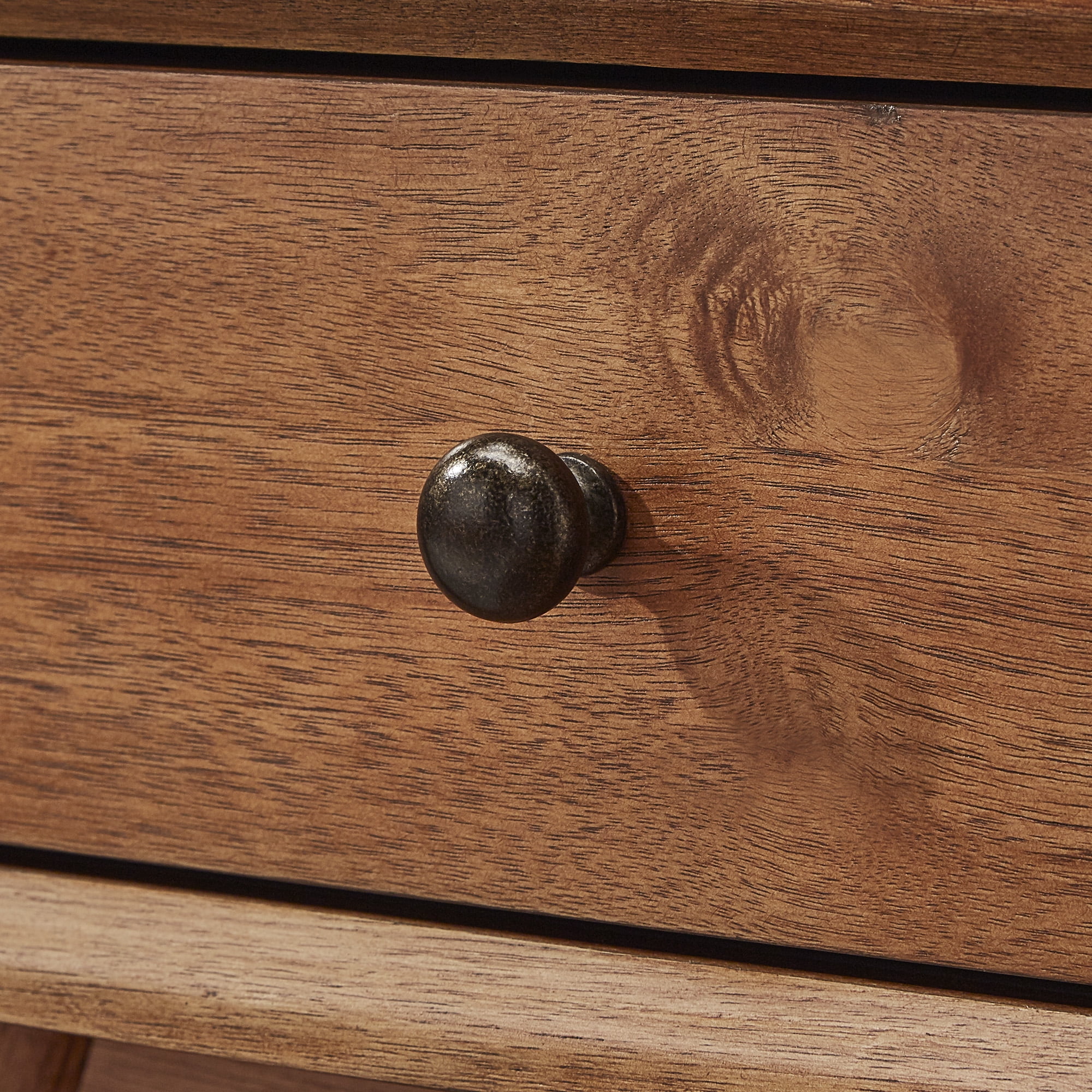 Dimensions: 18.5W x 15.5D x 24H in. Rubberwood, veneers, and metal construction Natural brown wood and dark metal finish 1 box drawer on side-mount metal glides Flared wood dowel legs with metal stretchers