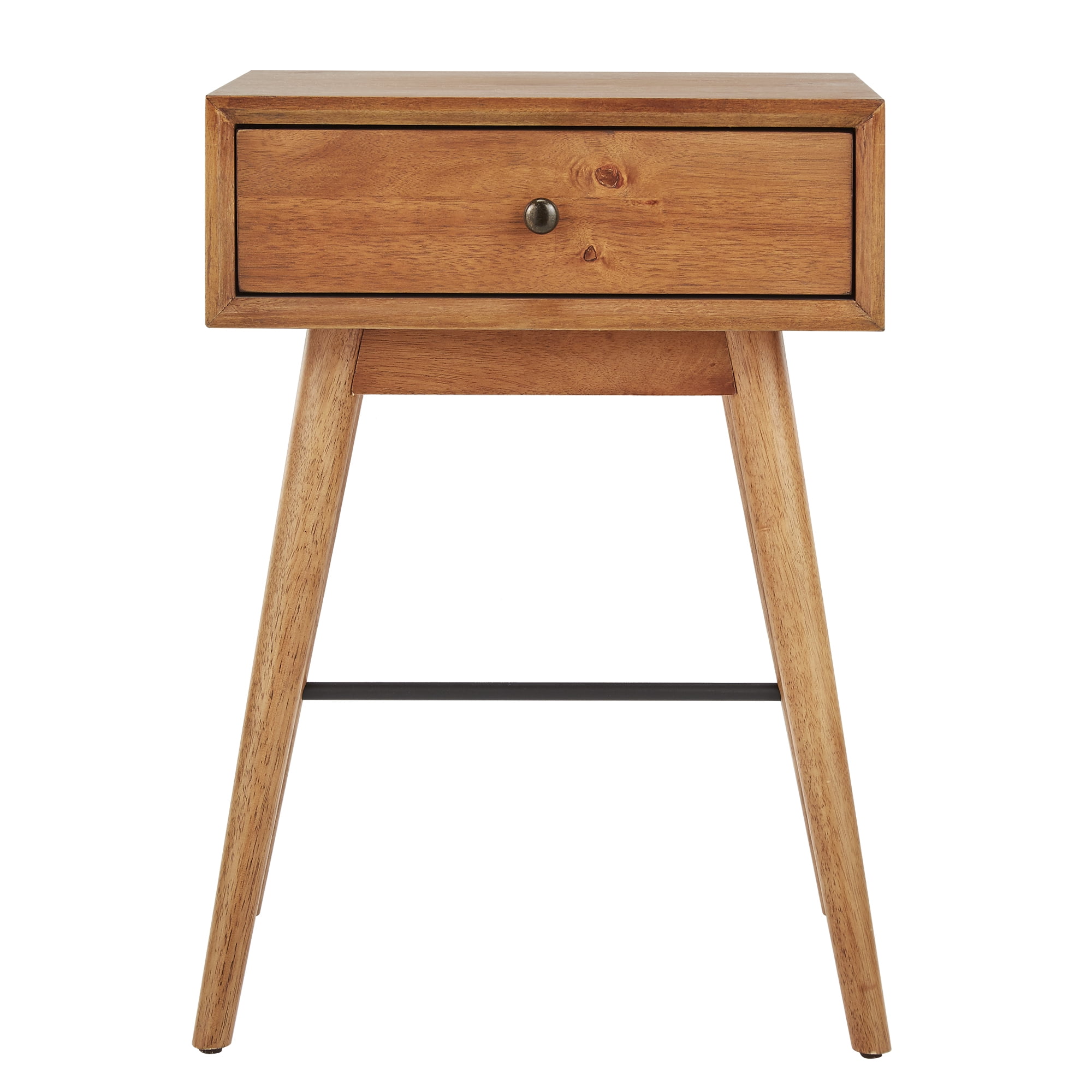 With its smart storage and mid-century flair, the HN Home Krisel Mid-Century Modern End Table makes a great bedside or chairside companion. This end table boast a spacious top and single box drawer on side-mount metal glides for smooth, dependable operation. It’s built of rubberwood and veneers in a natural brown finish and stands on long, lean, and flared wood dowel legs with black metal stretchers.