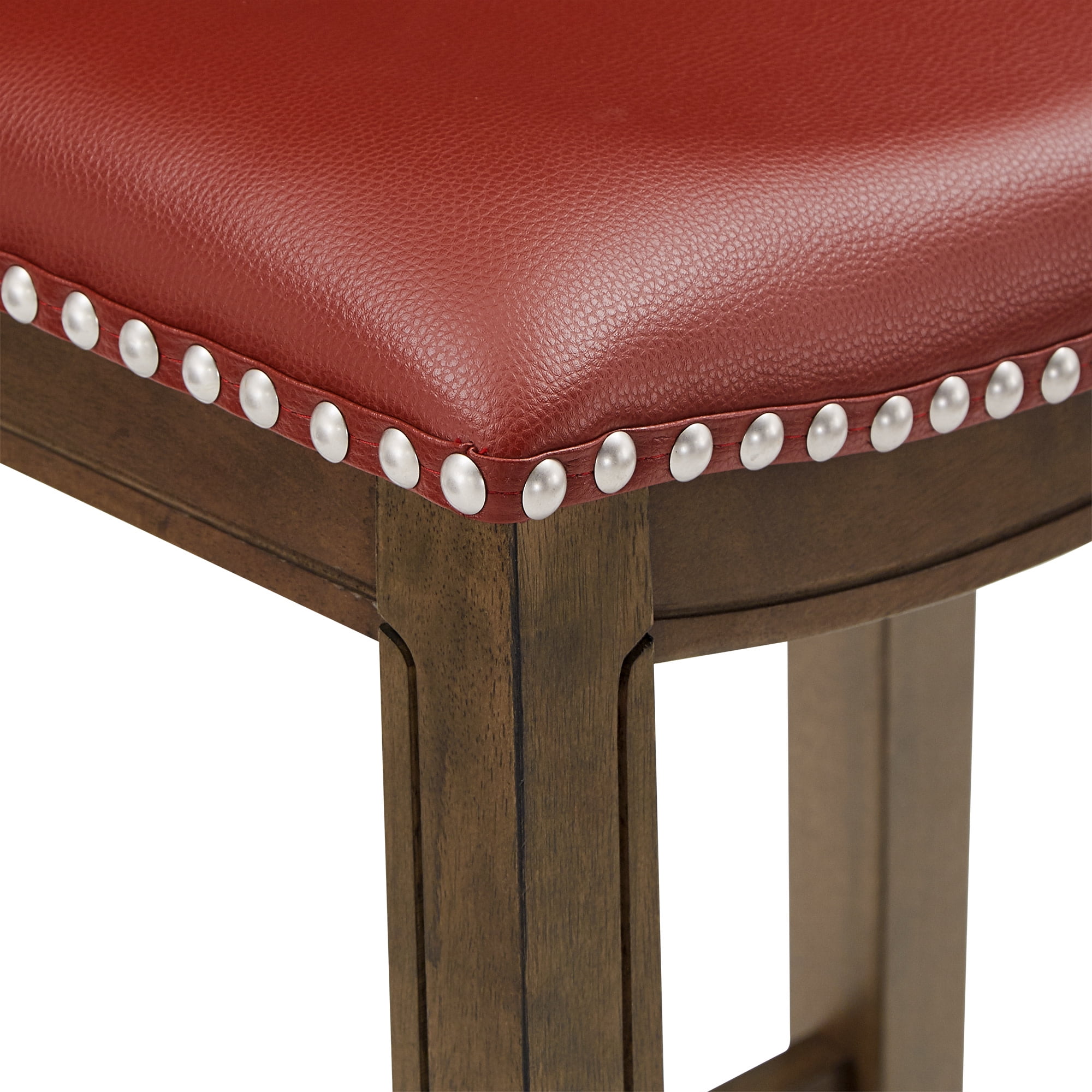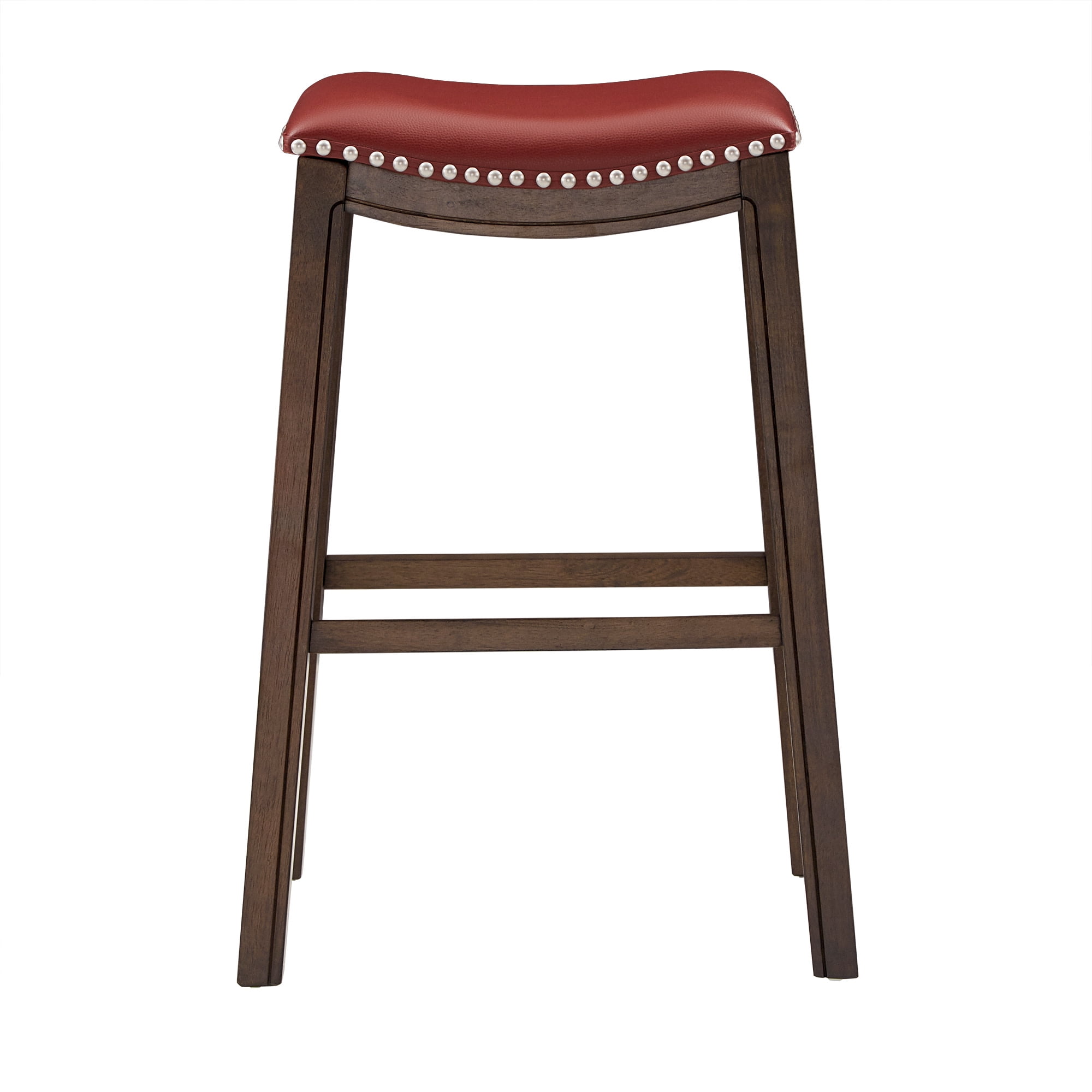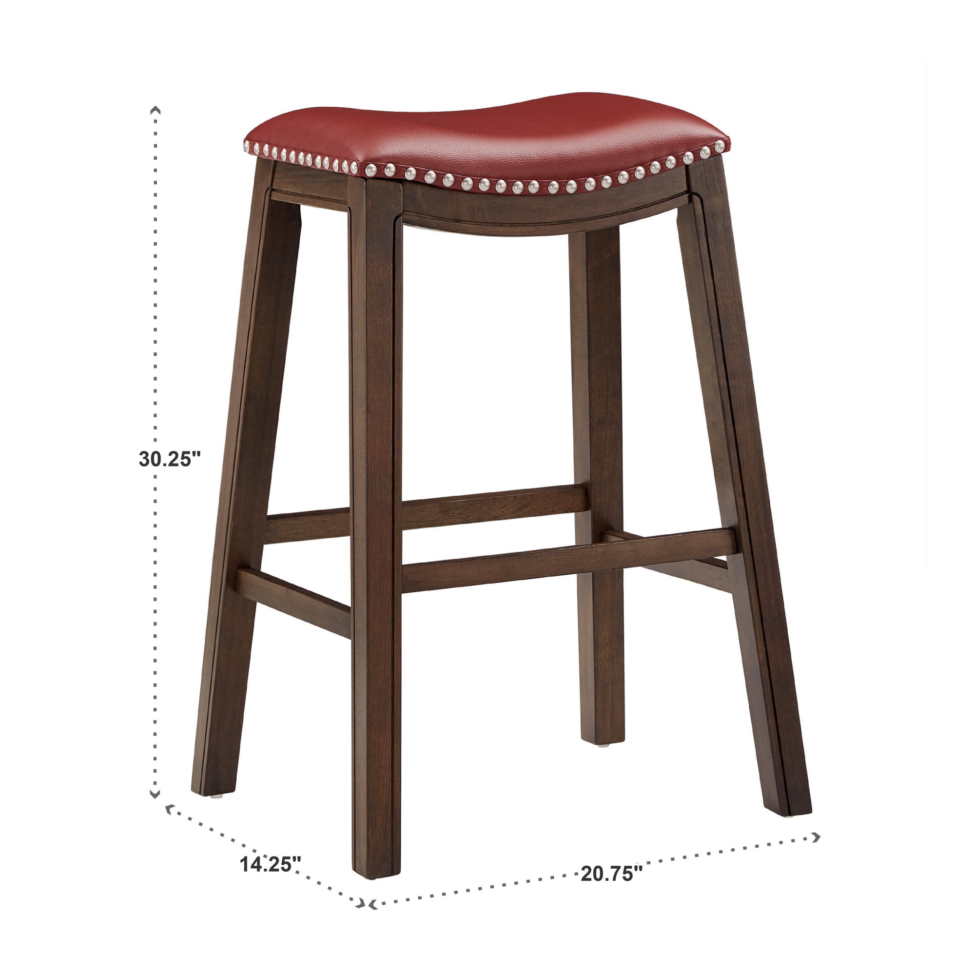 Includes one (1) backless bar height stool Silver nail head trim along seat base Brown, wood grain-finished frame Faux leather-upholstered saddle seat Built-in footrest for added comfort Crafted with solid wood and faux leather Overall dimensions: 20.75 in W x 14.25 in D x 30.25 in H Assembly Required Ships in one (1) box