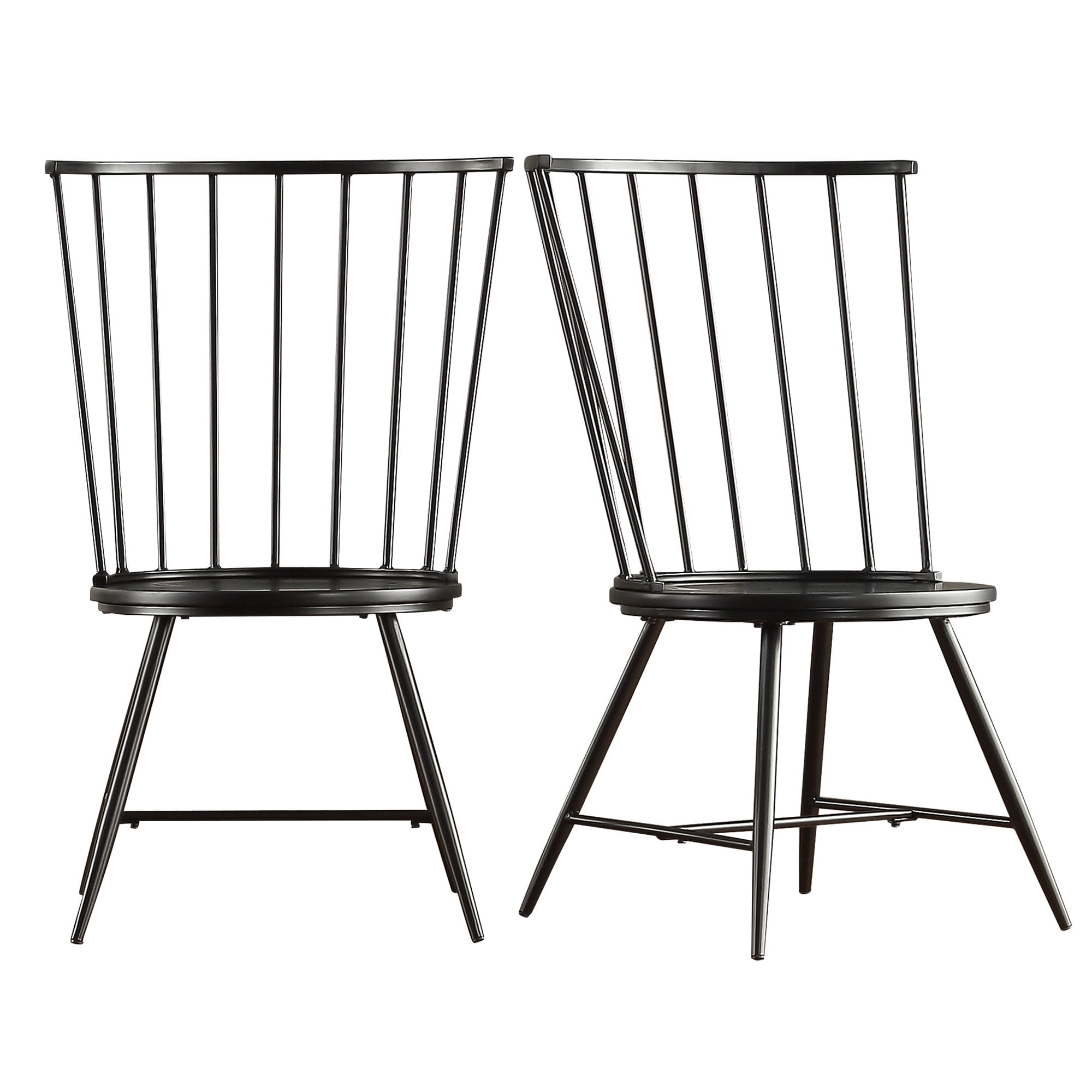 The set includes two (2) indoor chairs Overall dimensions: 21.5 in. width x 22.5 in. depth x 39 in. height Seat dimensions: 18 in. depth x 17 in. height Back height: 22 in. Windsor seat back style Mid-back MDF seat Metal back and legs High gloss black finish Built with MDF and metal Ships in one (1) box Assembly required