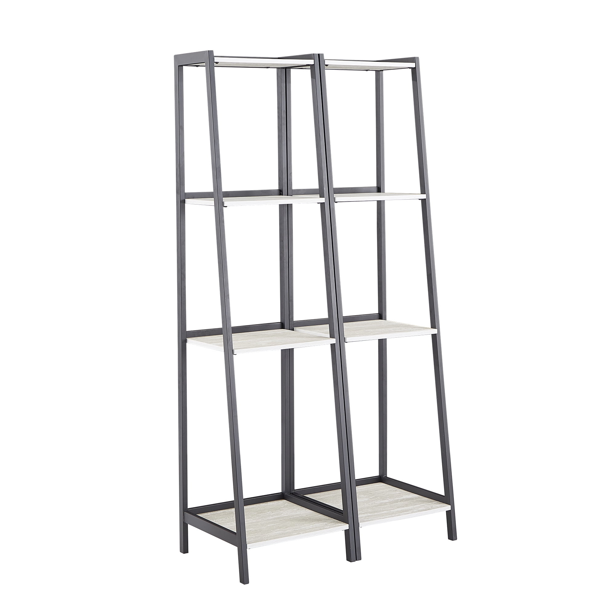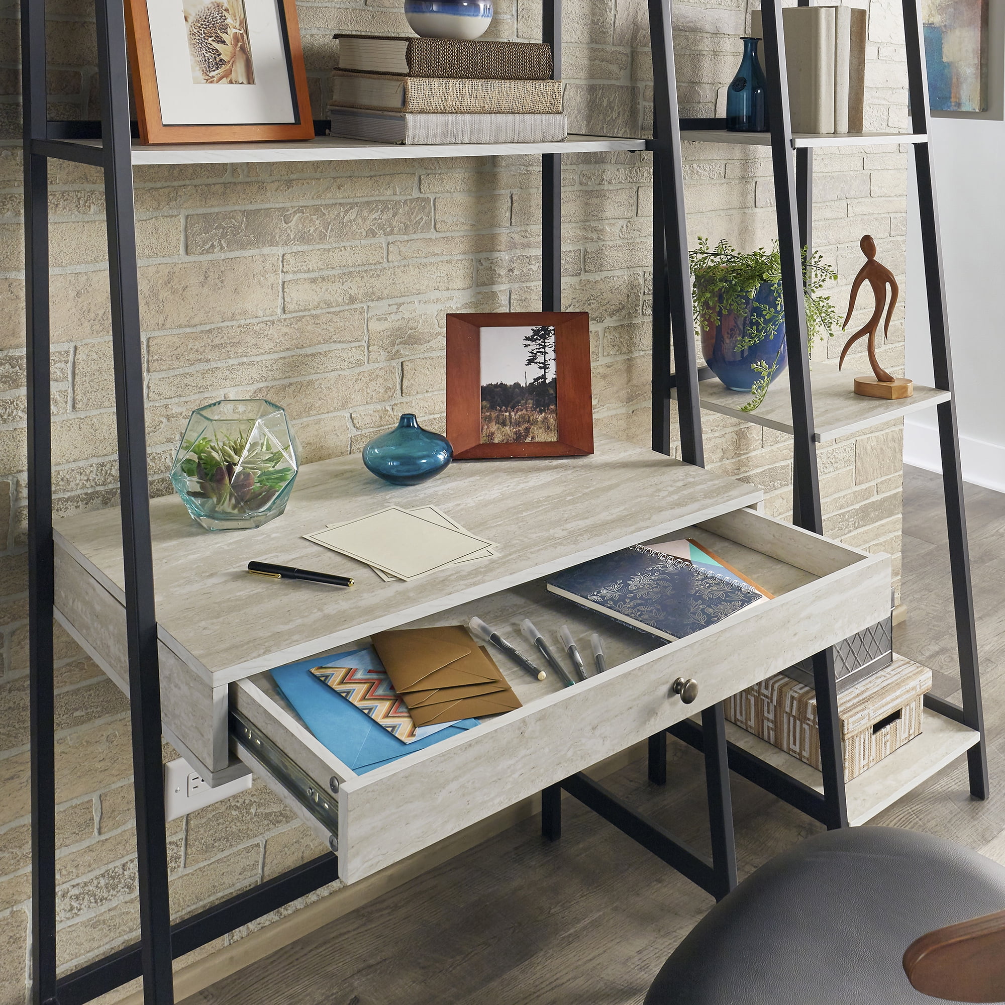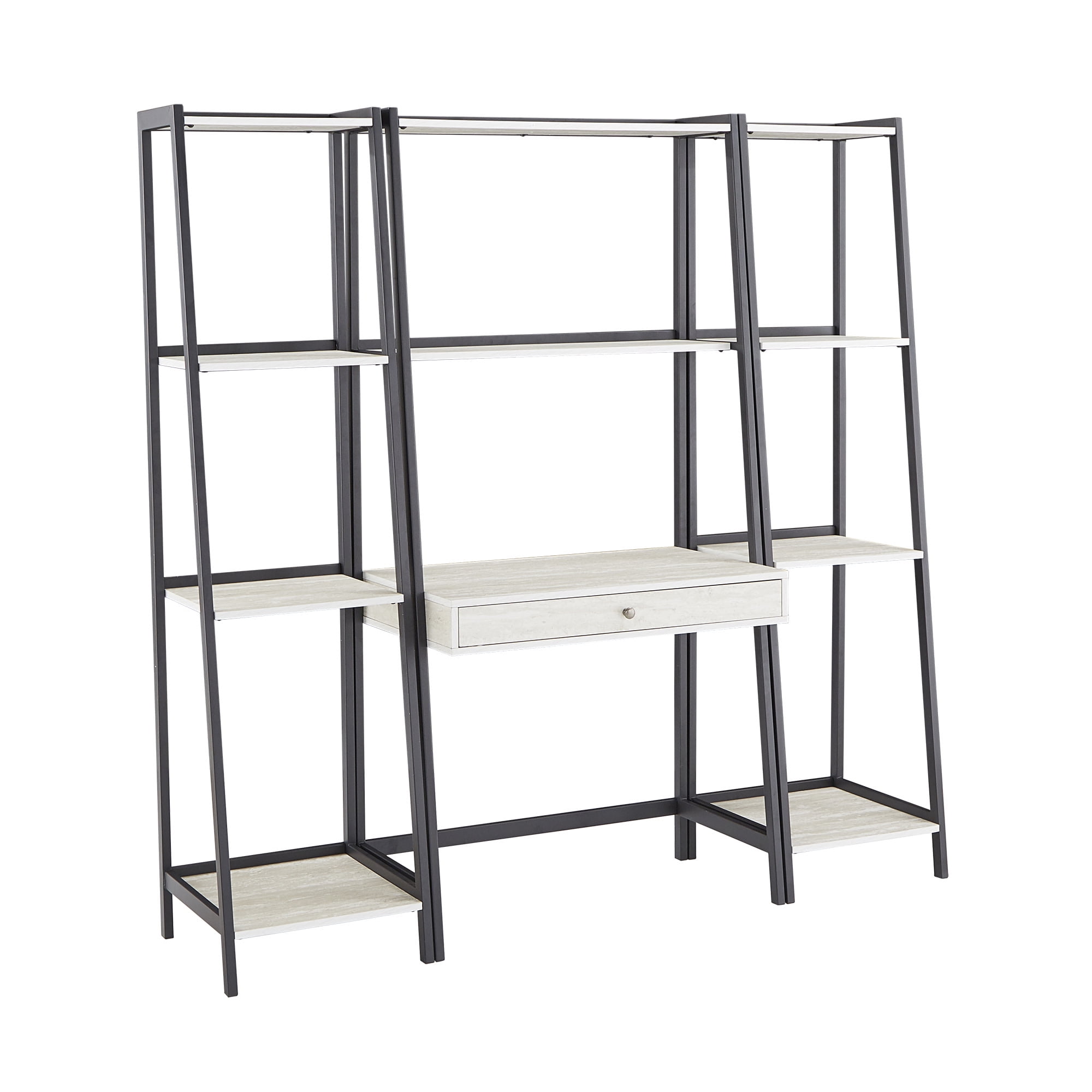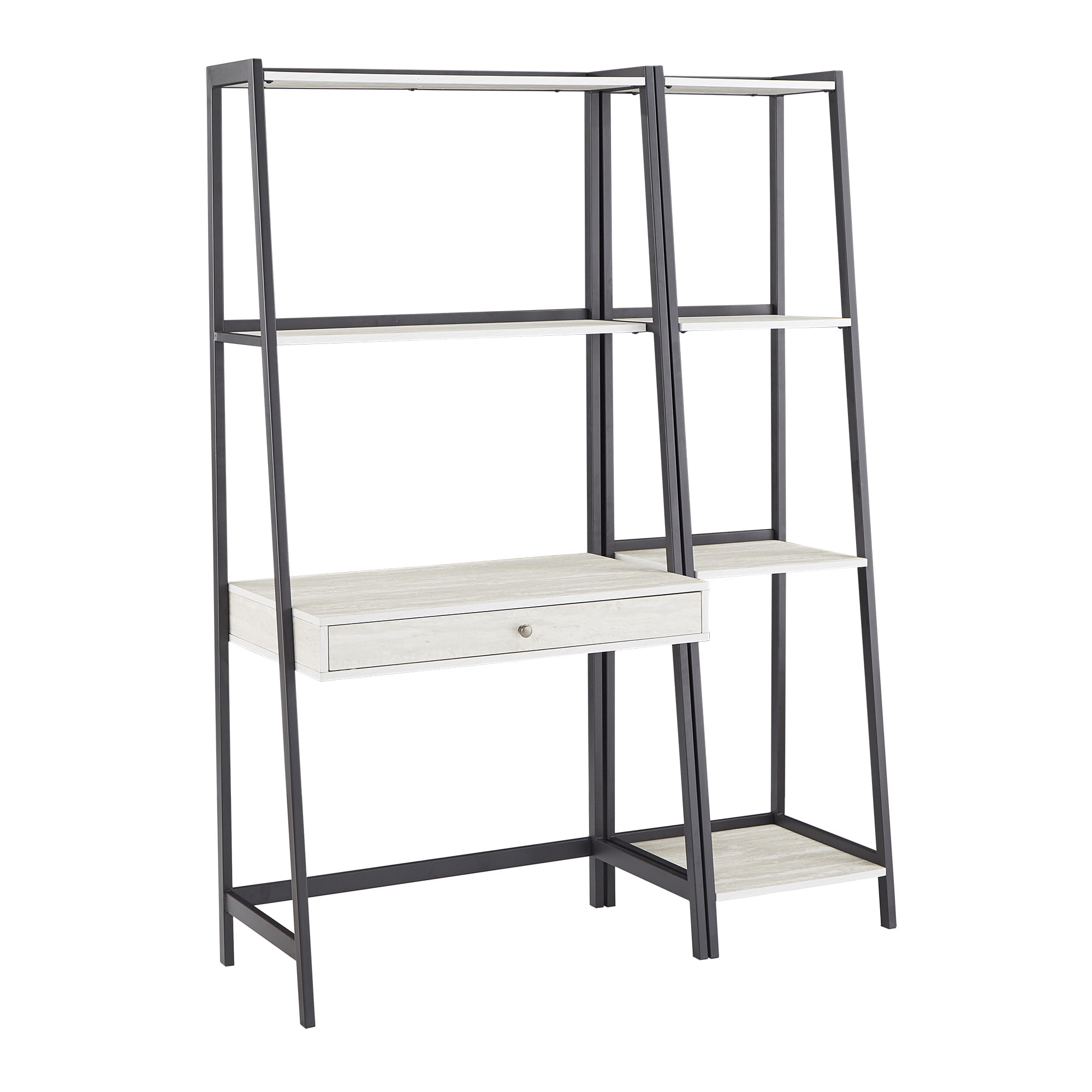 Overall set dimensions: 67.7 in. width x 19.7 in. depth x 68.9 in. height Desk overall dimensions: 31.5 in. width x 19.7 in. depth x 68.9 in. height Desk shelf dimensions: 31.5 in. width x 9.73 in. depth x 18.6 in. height Desk drawer interior: 29.4 in. width x 12.7 in. depth x 2.76 in. height Under desk clearance: 29.5 in. height Bookcase overall dimensions: 17.3 in. width x 16.97 in. depth x 68.9 in. height Top shelf dimensions: 9.73 in. depth Second shelf dimensions: 11.84 in. depth x 18.6 in. height Third shelf dimensions: 14.1 in. depth x 18.6 in. height Bottom shelf dimensions: 15.75 in. width x 16.97 in. depth x 24.1 in. height Set includes one (1) ladder desk and two (2) ladder bookcases Desk comes with two (2) shelves and one (1) box drawer on metal drawer glides Each bookcase comes with four (4) shelves White faux marble shelves and desk Matte black finish frames Constructed with metal, particle board with paper, and MDF Ships in one (1) box Assembly required