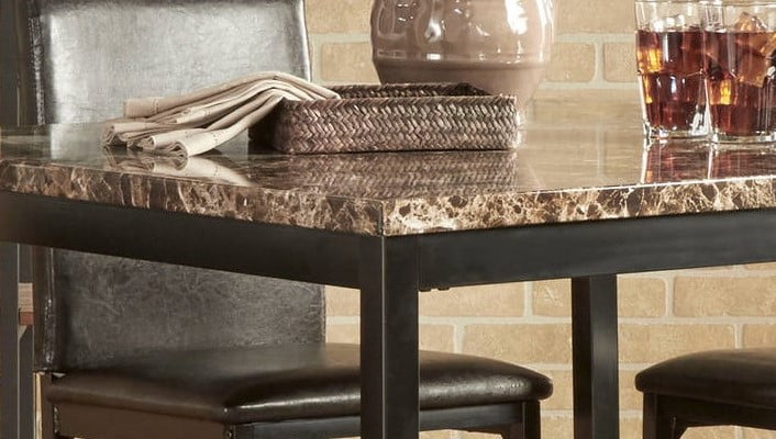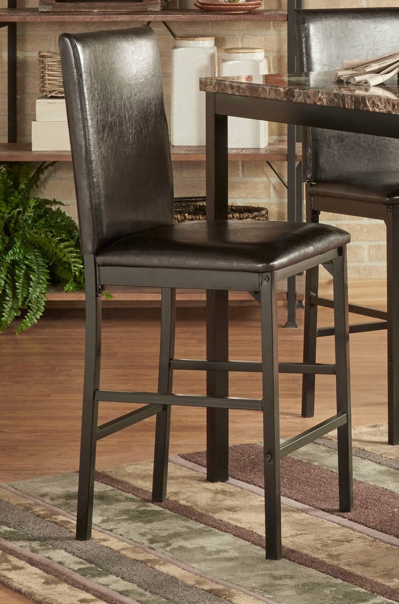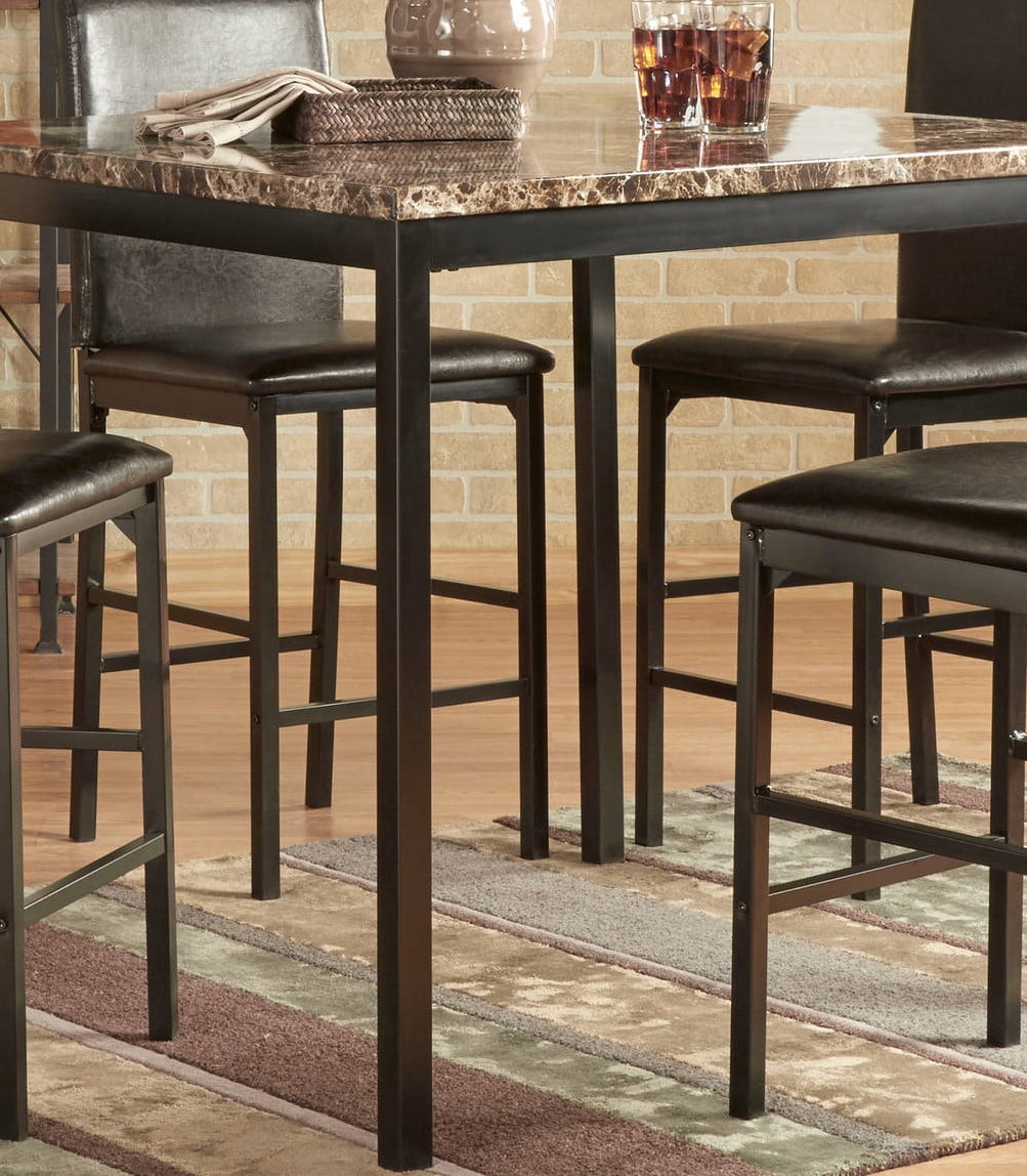 Modern Indoor Dining Set includes: One (1) counter height table, four (4) counter height chairs Neutral colors and a simple design to match your dining area Materials: Metal, faux marble, vinyl Upholstery color: Black Upholstery fill: Polyurethane foam Seat dimensions: 24 inches high x 15.7 inches deep x 1.5 inches thick Table dimensions: 36 inches high x 40 inches wide x 40 inches deep Chair dimensions: 40 inches high x 17.5 inches wide x 19.5 inches deep This item ships in 2 large boxes Weight: 131.7 lbs Assembly Required Table decor not included