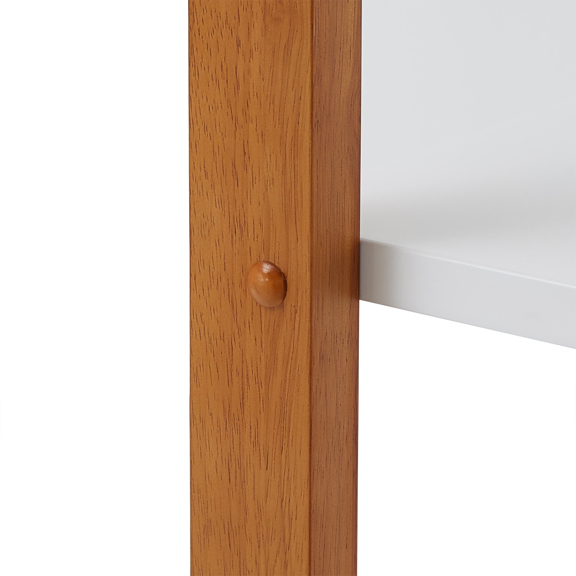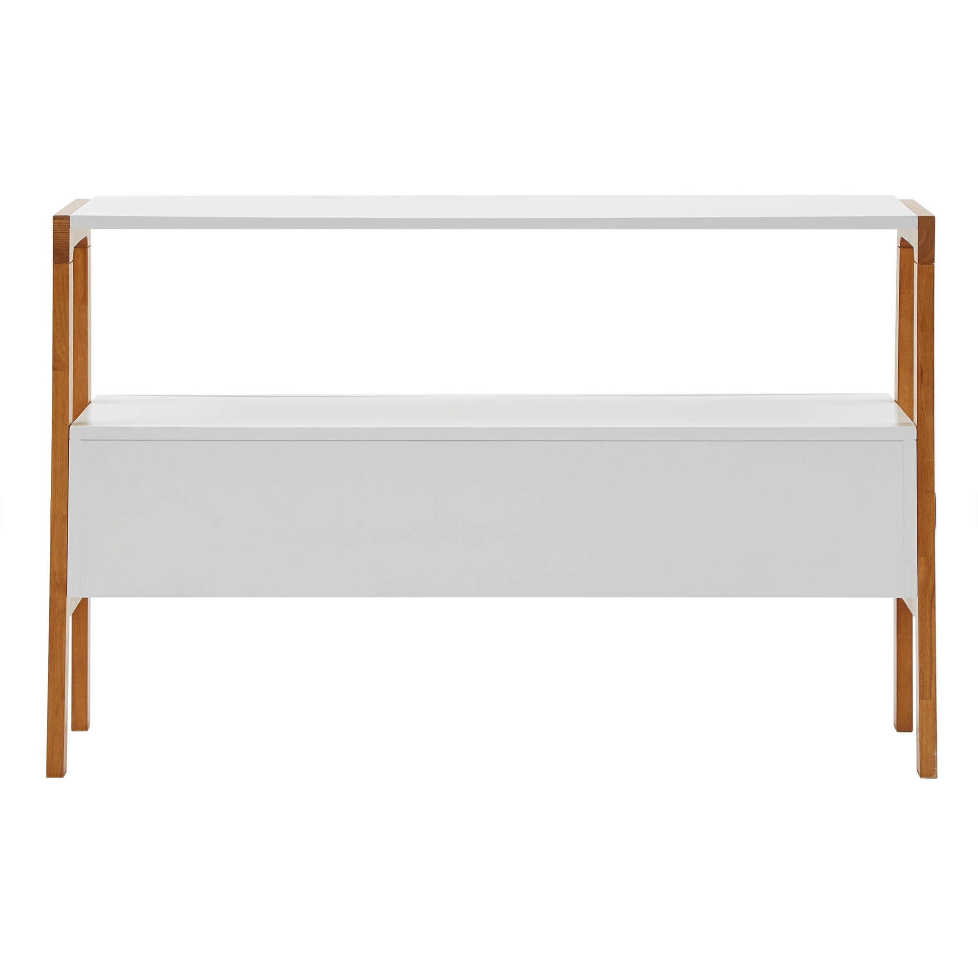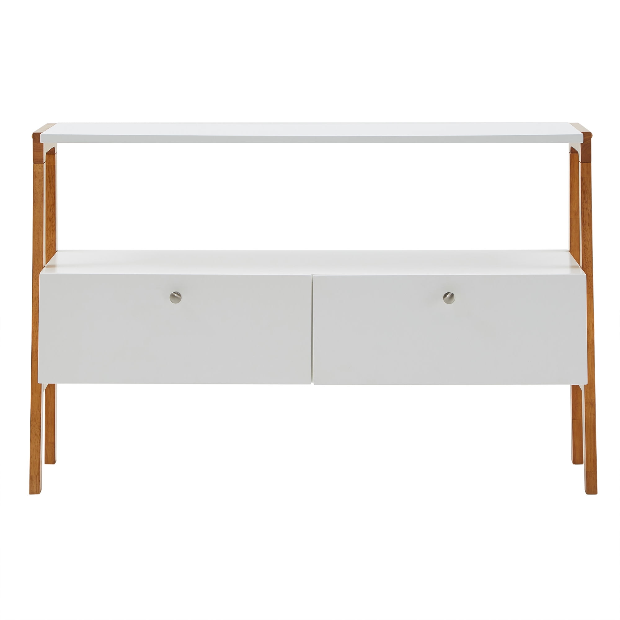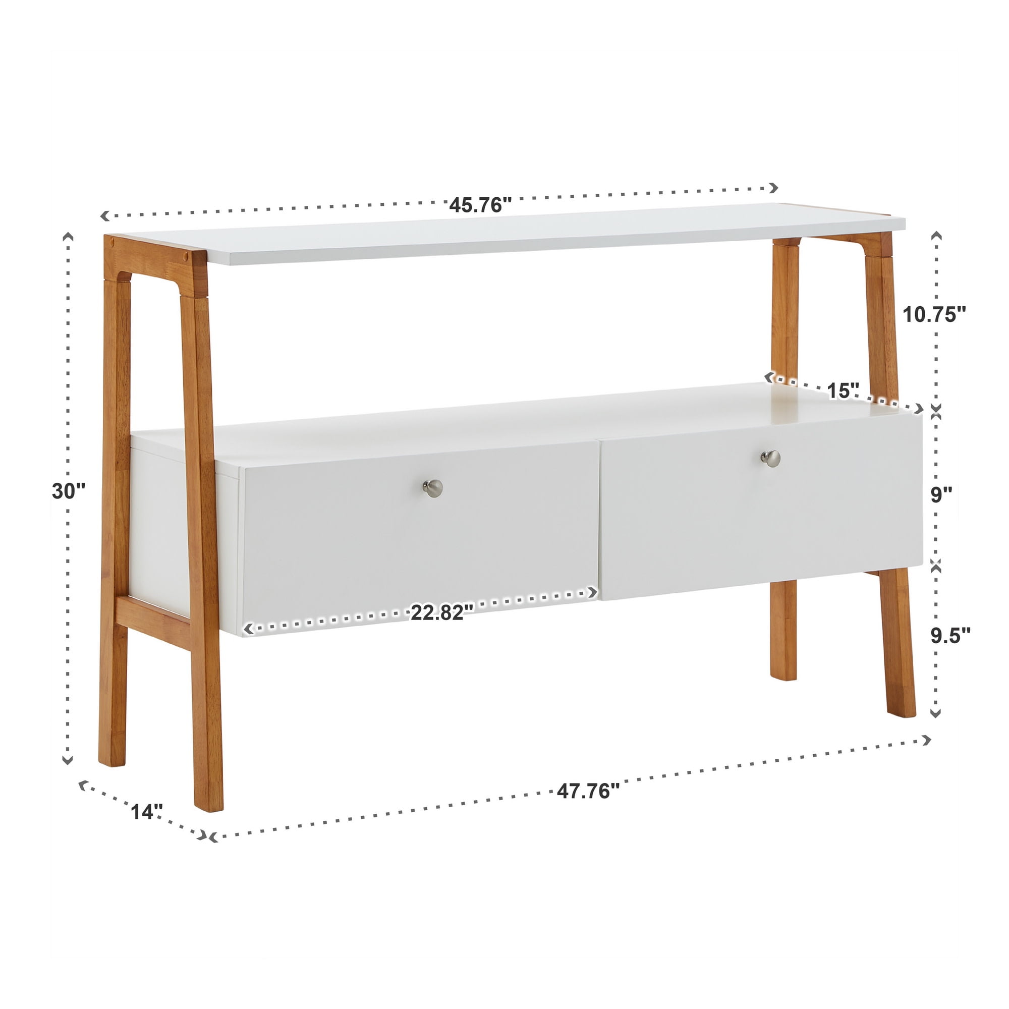 Simple, sleek and modern TV stand Urban design seamlessly blends into any room Built with a natural wood frame and open shelf Fixed shelves Ladder shape elevates the look of the room even when it’s not in use Compact footprint that easily fits into an eclectic mix of styles Ball bearing glides, soft close drawer Crafted with poplar, MDF, zinc knobs Set includes one (1) TV stand with two (2) drawers Overall dimensions: 47.76 in. width x 14 in. depth x 30 in. height Top shelf: 47.76 in. width x 14 in. depth Second shelf: 47.76 in. width x 15 in. depth Drawer inner: 20 in. width x 12.25 in. depth x 5.25 in. height Clearance: 9.5 in. height Ships in one (1) box Assembly required