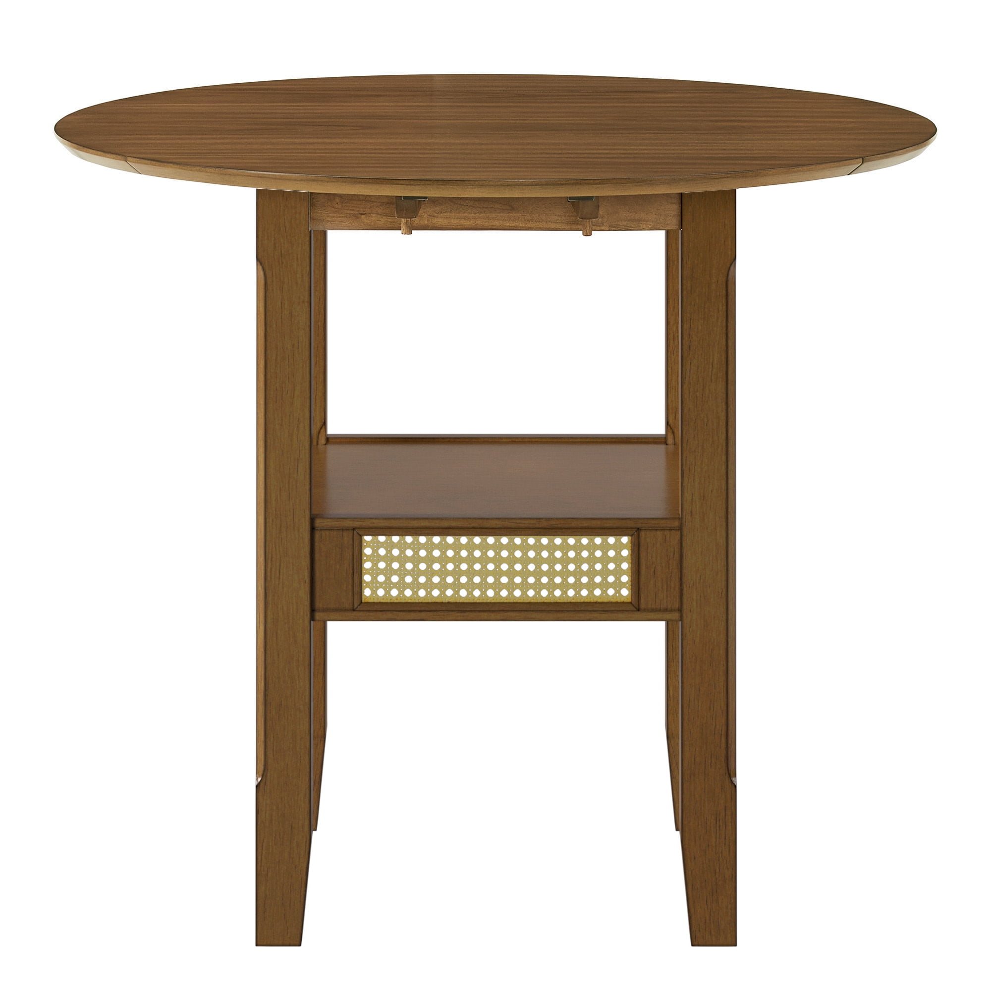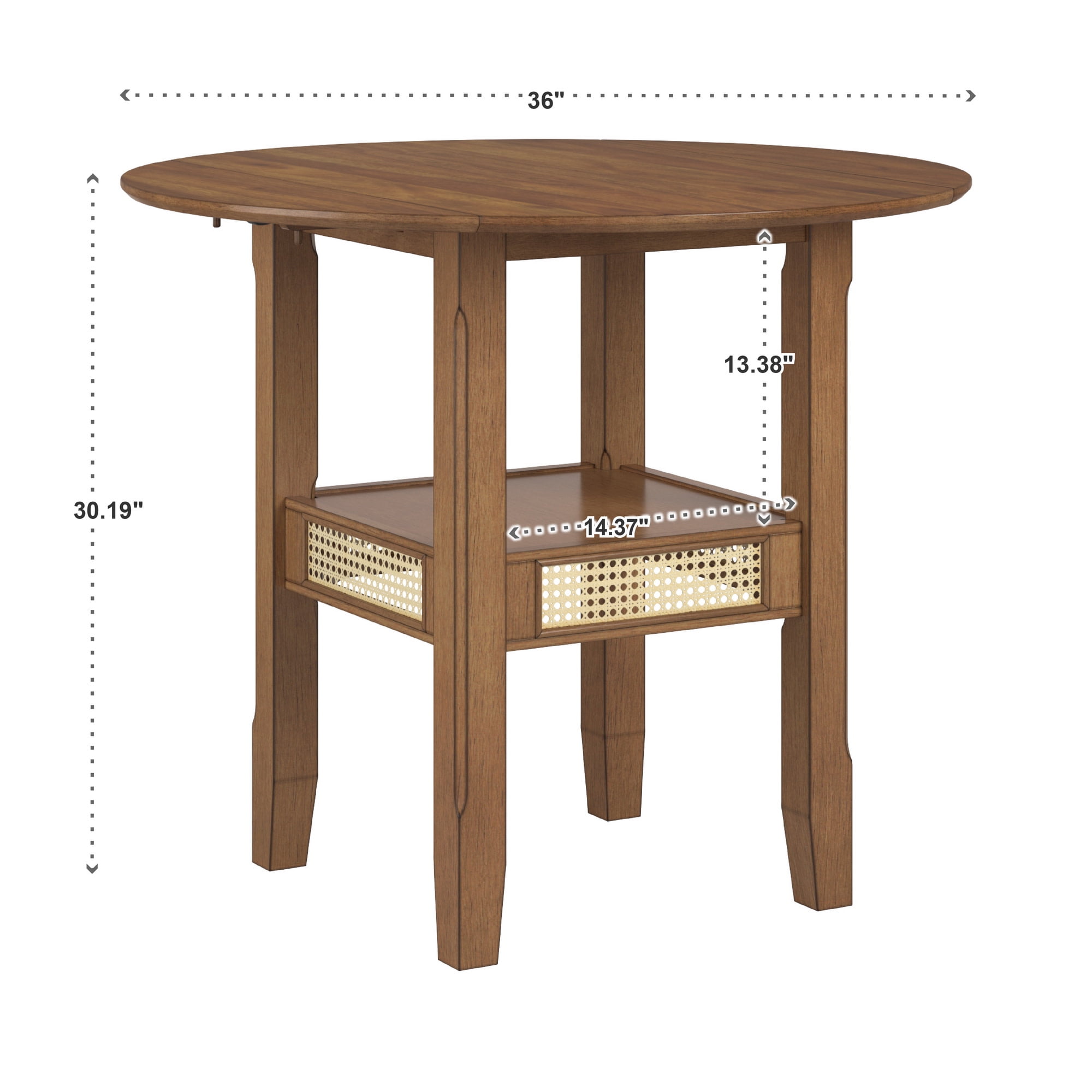 Set includes one (1) dining table Transitional style round top counter height table with 2-drop leaves Two (2) drop leaves can easily fold down to save space Open shelf for convenient storage of items such as bowls, plates, purses and backpacks Textured inlay of cane adds dimension and depth Crafted with synthetic rattan, rubberwood, acacia veneer and MDF Overall dimensions: 36 in. diameter x 30.19 in. height Drop leaf: 28.34 in. width x 6.88 in. depth Open shelf: 17.8 in. width x 17.8 in. depth x 13.38 in. height Under shelf height: 12.18 in.