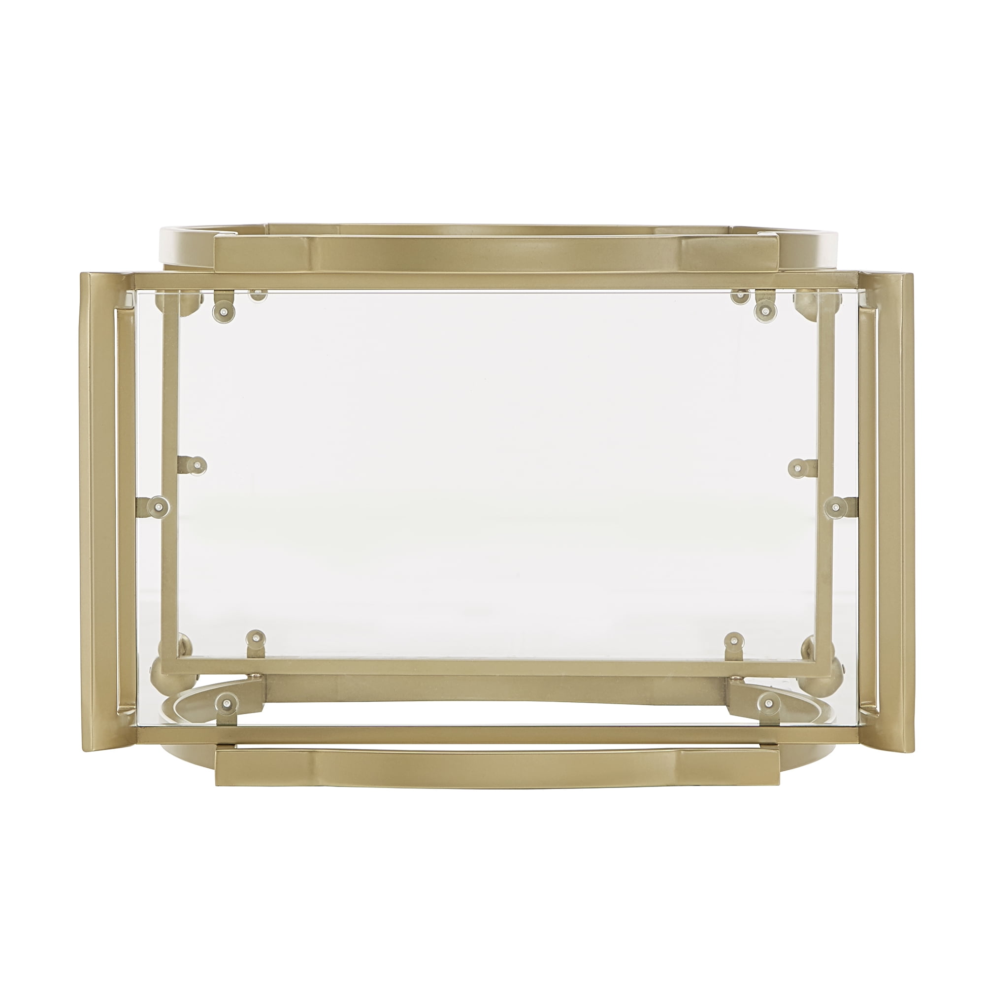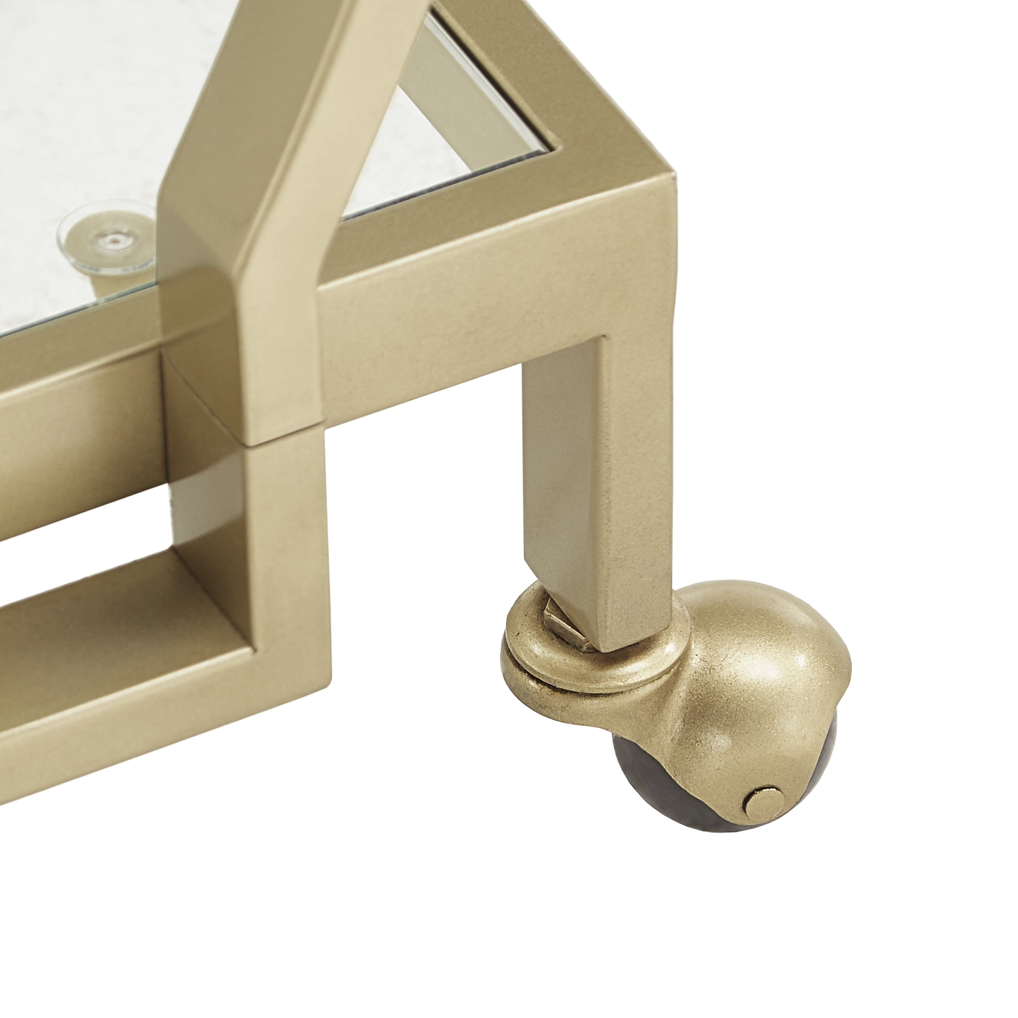 Includes: Two (2) glass sheets, One (1) top frame, One (1) bottom frame, and Two (2) stretchers Mirrored shelves add a distinctive glam style Extravagant gold finished metal frame Materials: Iron Tube, Glass Shelves Overall dimensions: 26W x 17.32D x 33.86”H Shelves: 14.96″W x 22.76″D Assembly required Ships in one (1) box