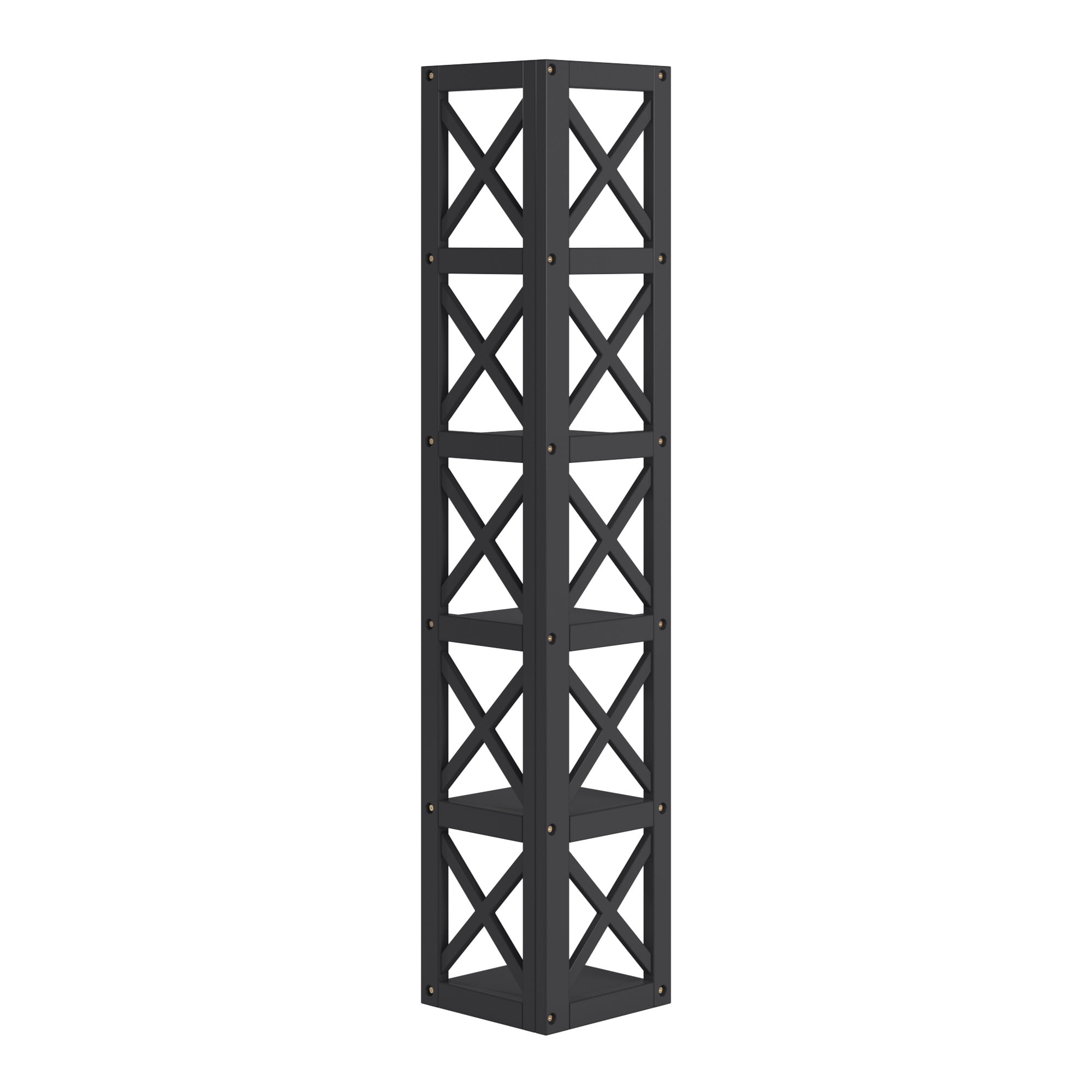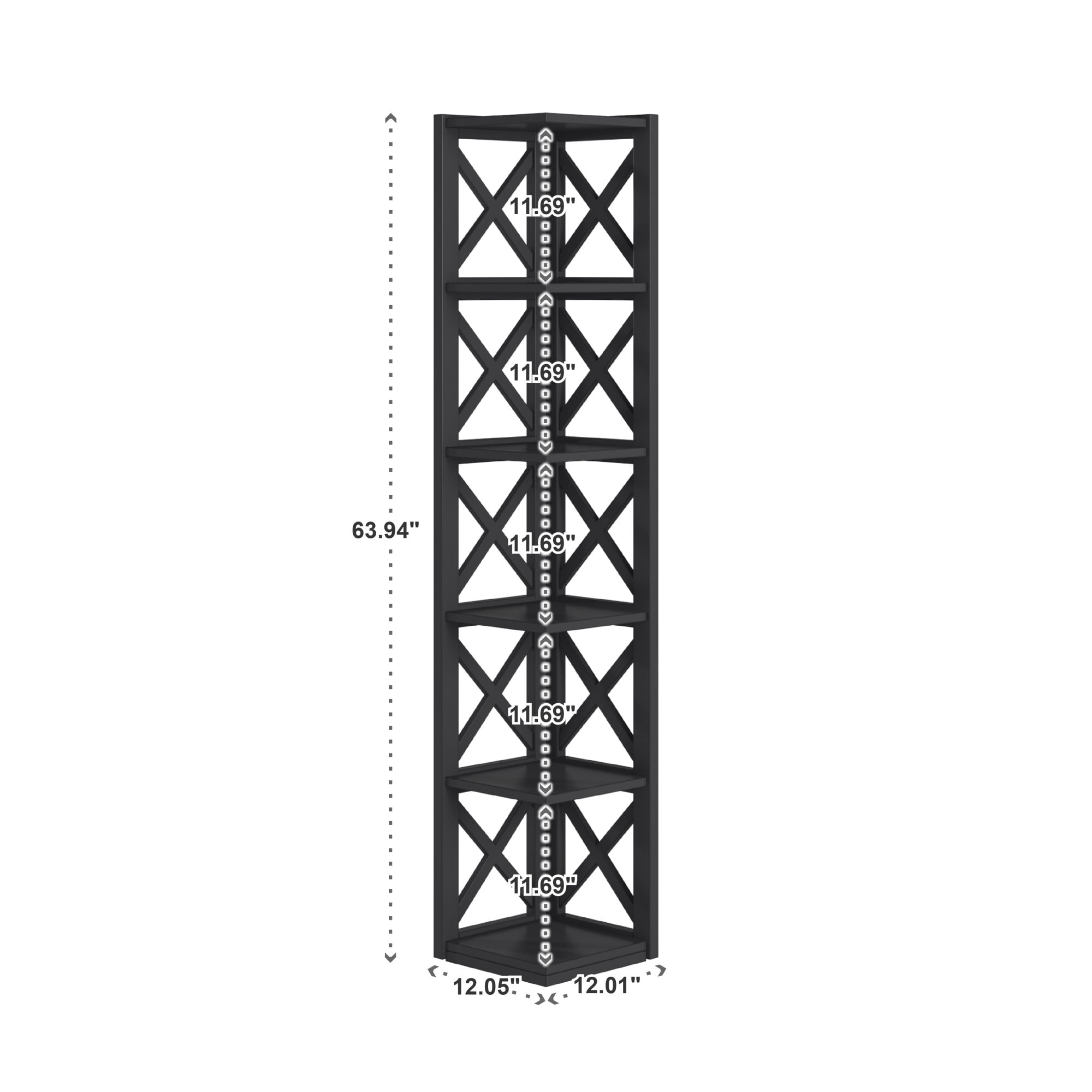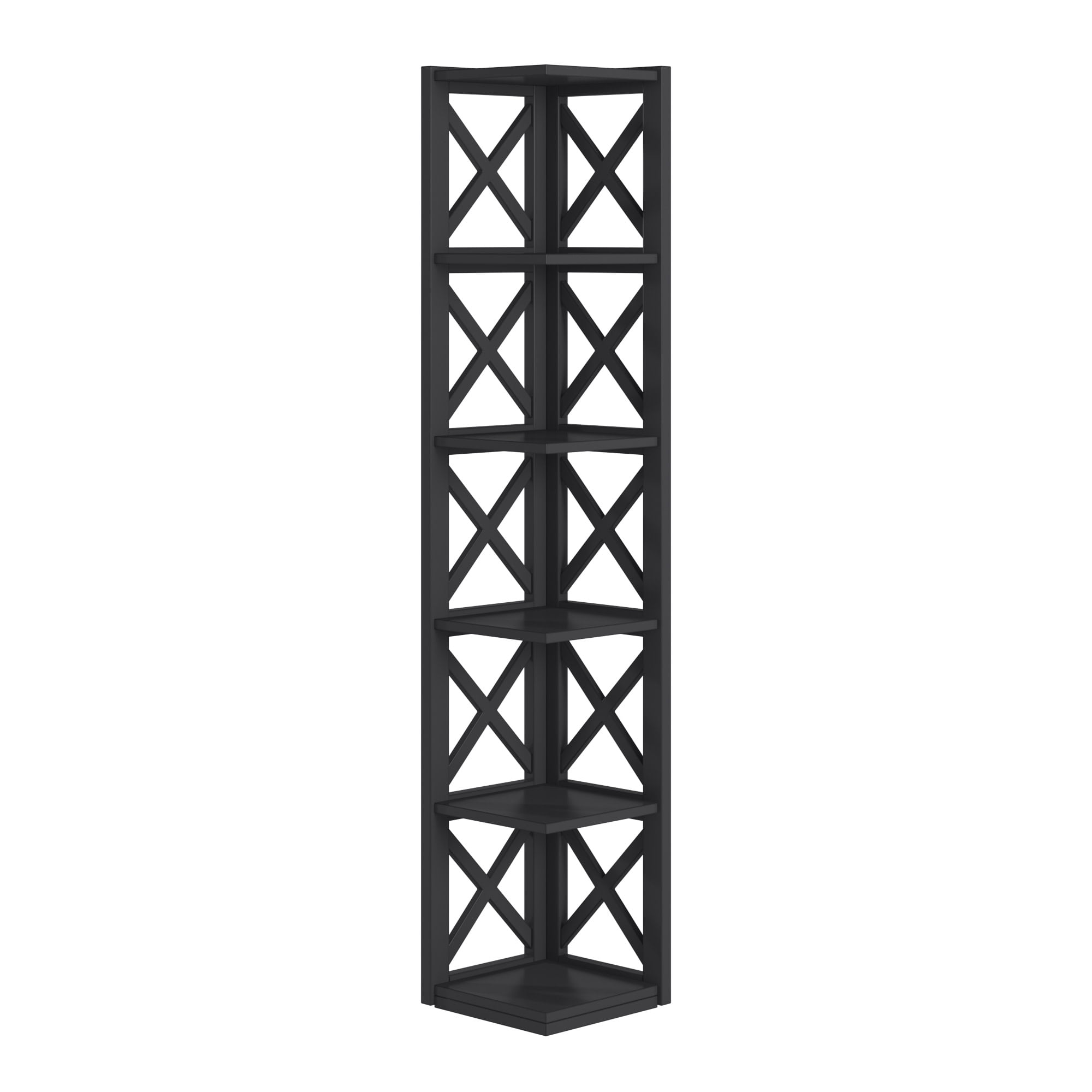 Includes one (1) corner bookcase Five (5) fixed shelves X-cross styled frame Crafted with solid wood and rubberwood Overall dimensions: 12.05 in. width x 12.01 in. depth x 63.94 in. height Height between shelves: 11.69 in. Assembly required Ships in one (1) box