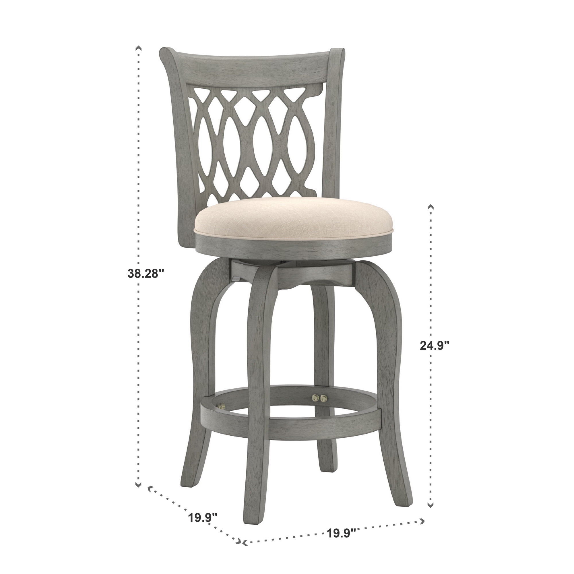 Includes one (1) counter height stool Ring footrest for added comfort Wood finished frame Foam-padded, linen or faux leather upholstered seat Elegant scroll back design 360-degree swivel seat Made with rubberwood, linen, and foam Overall Dimension: 19 in. width x 19 in. depth x 38.28 in. height Seat Width: 16.5″ Seat Depth: 16.5″ Seat Height: 24.9″