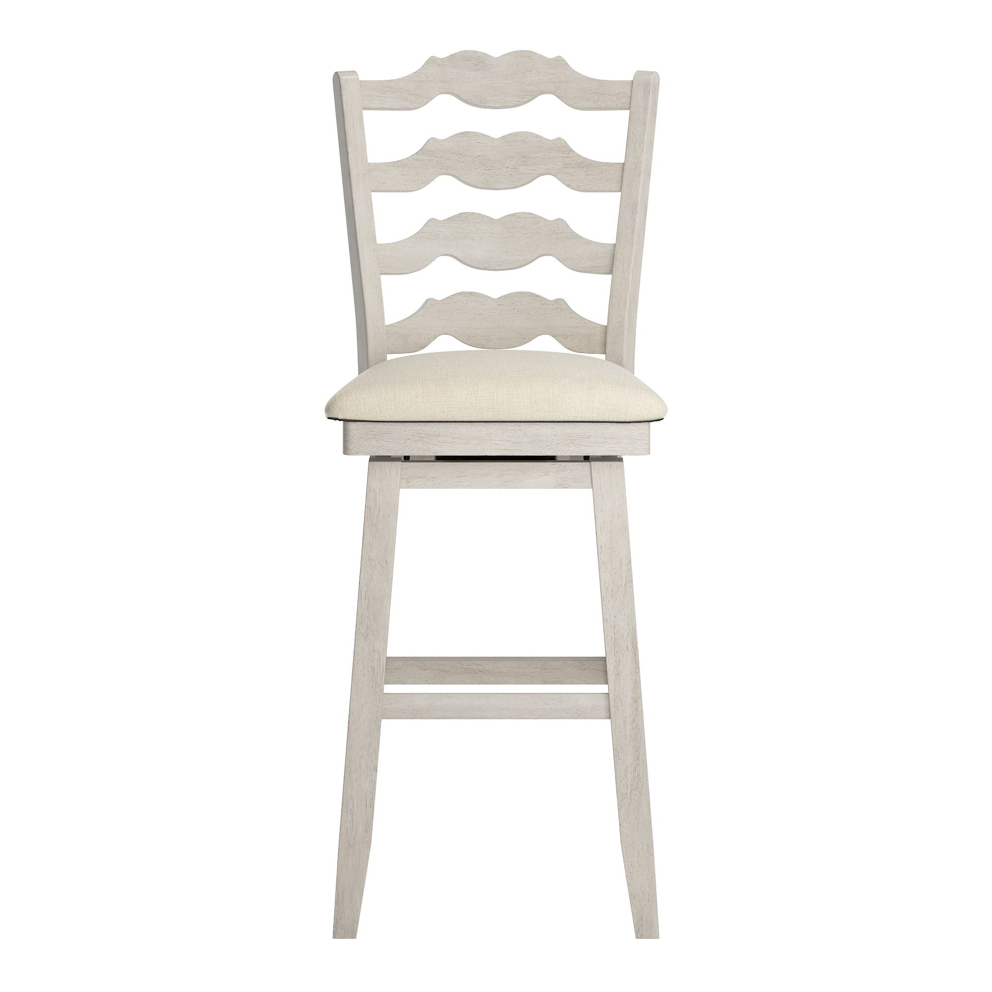 Includes one (1) chair Rubberwood, plywood, and fabric construction French ladder back detail Features a padded seat and footrest for added comfort Swivel design Seat dimensions: 18.7 inches wide x 16.73 inches deep Overall: 20.1 inches wide x 21.7 inches deep x 47 inches high Assembly required Each product ships in one (1) box 90 days limited amanufacturer`s warranty