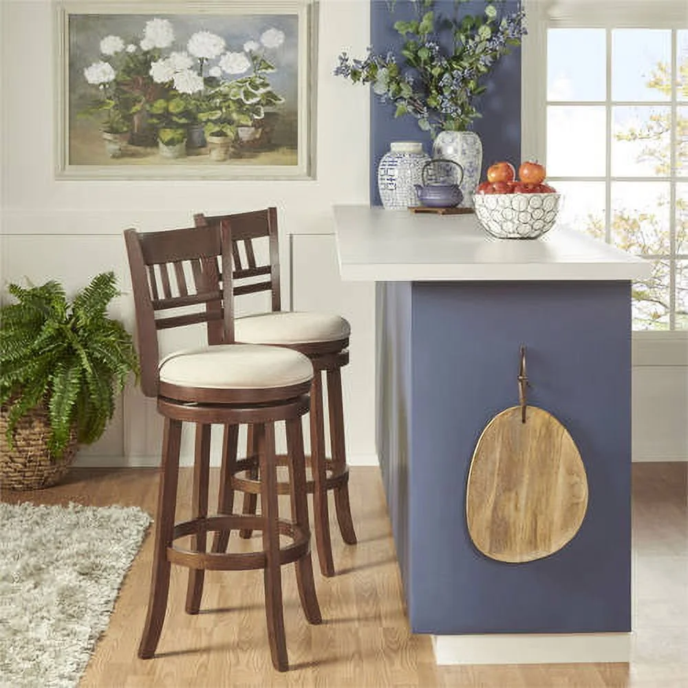 Weston Home Vertical Design Swivel Dark Cherry Finish Wood Bar Height Stool, Beige Linen