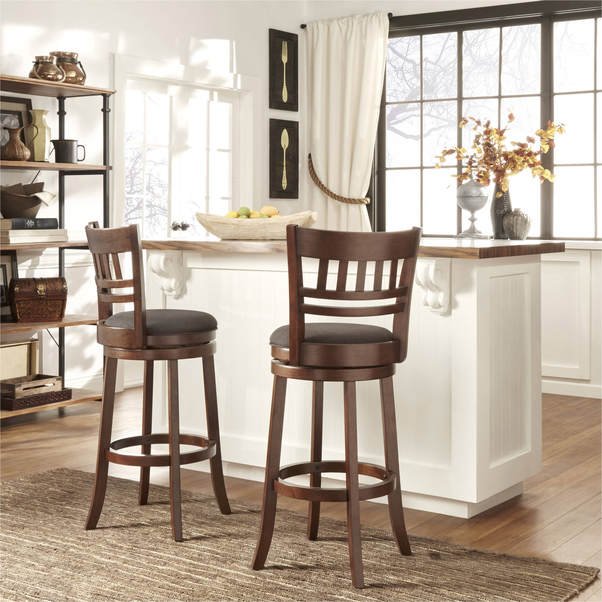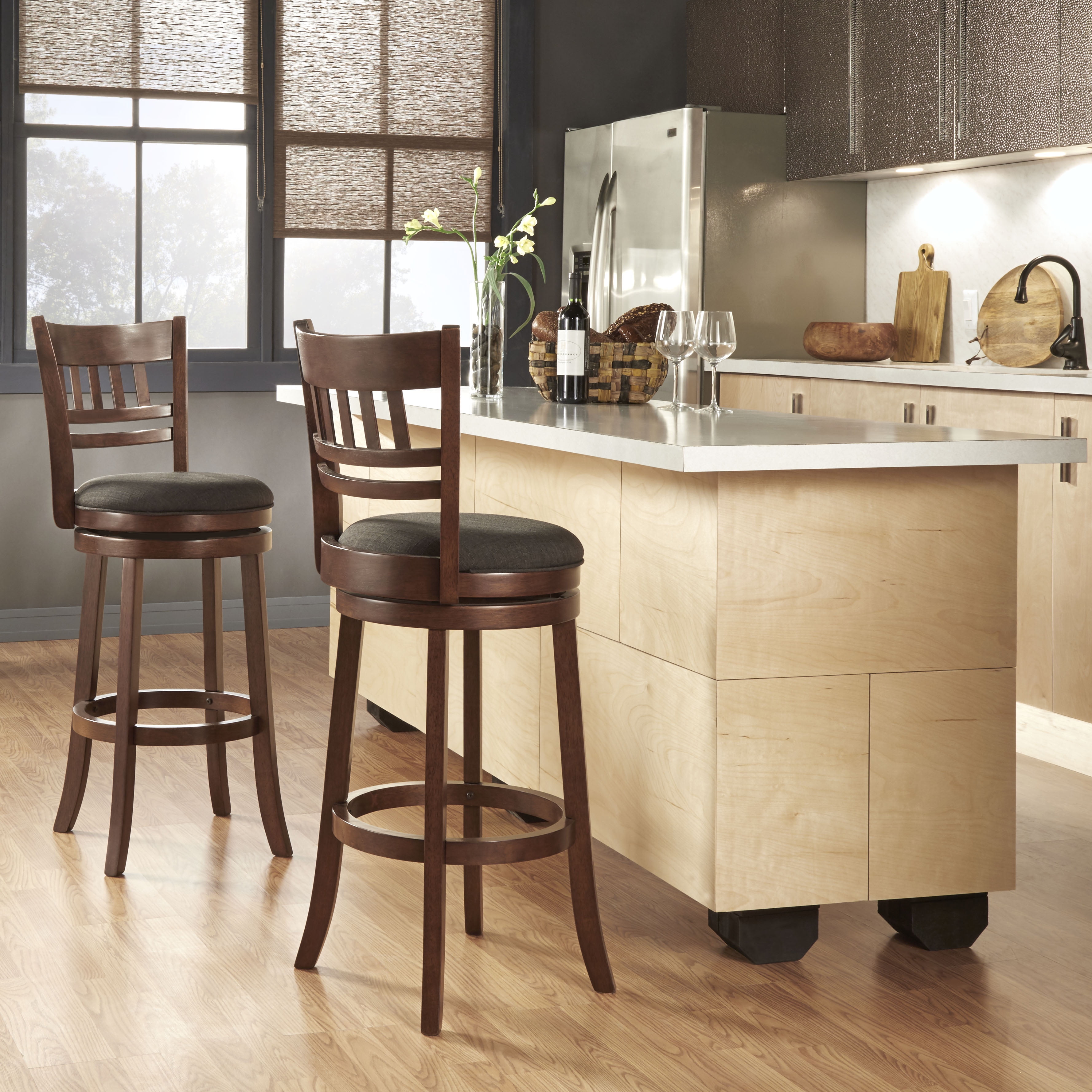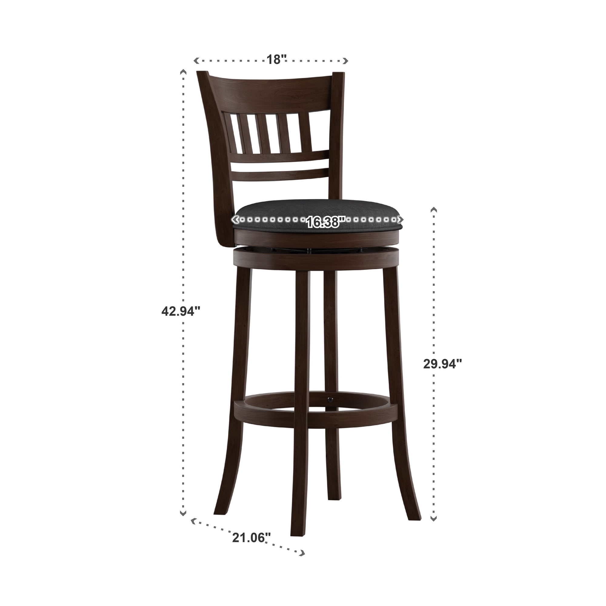 Weston Home Vertical Design Swivel Dark Cherry Finish Wood Bar Height Stool, Dark Gray Linen
