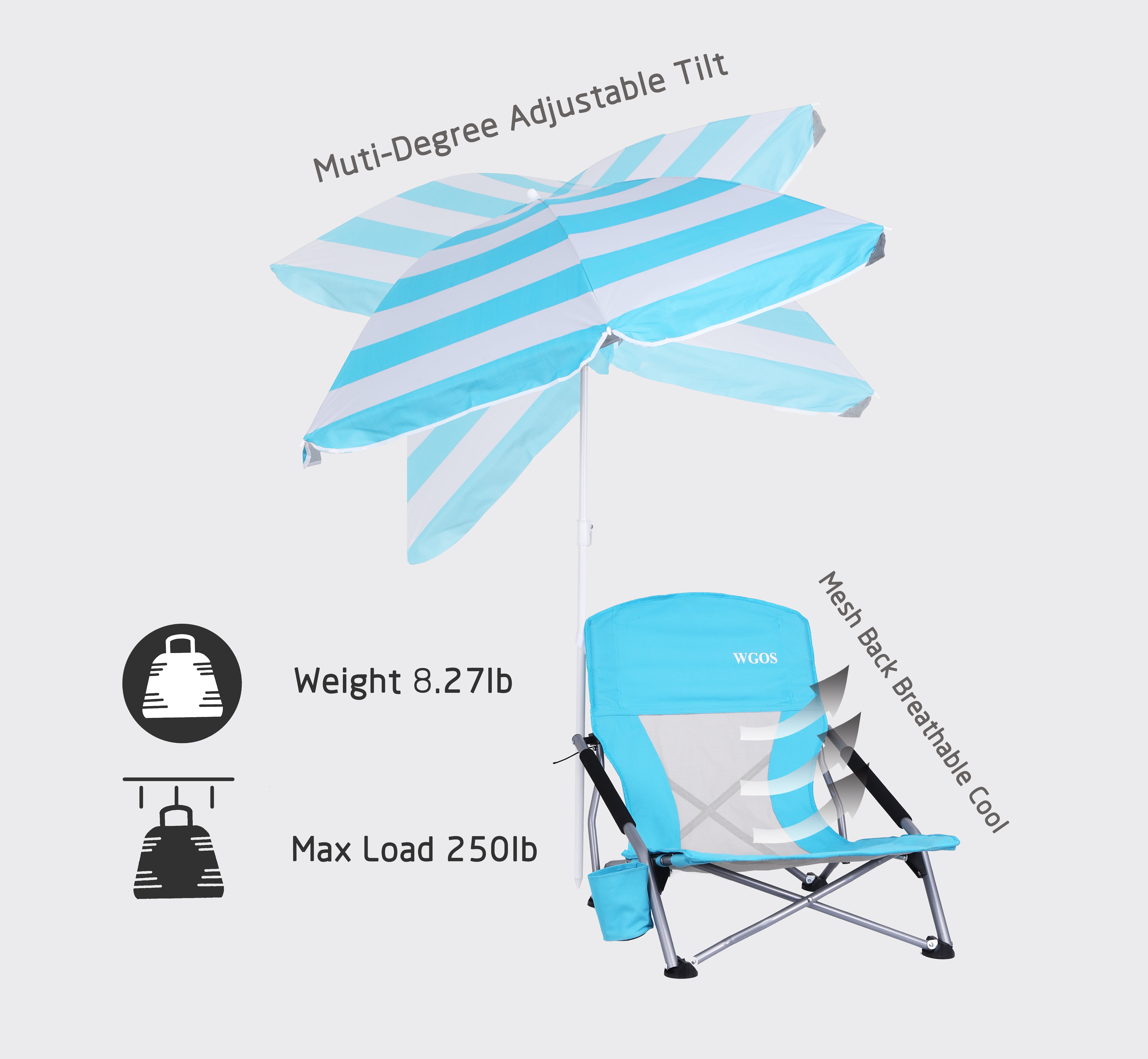 WGOS Portable Low Beach Chair with Detachable Umbrella and Cup Holder, Blue Upgrade design with a collapsible tilted umbrella for enhanced sun protection Chair dimensions 22.6 x 24.4 x 23.6 L x W x H umbrella dimensions 52.4 x 56.7 W x H Breathable mesh back fabric keeps you cool and comfortable UPF 50+ umbrella protects your skin from harmful UV rays Padded armrests for added comfort during use Includes a cup holder on the right side for convenient drink placement Portable design with a carry bag for easy transport bag dimensions 30.7 x 7.5 H x W Made with industrial-grade Oxford 600D polyester fabric and heavy-duty steel frame for durability Weight capacity of 250 lbs folding size 7.5 x 5.9 x 30.7 L x W x H