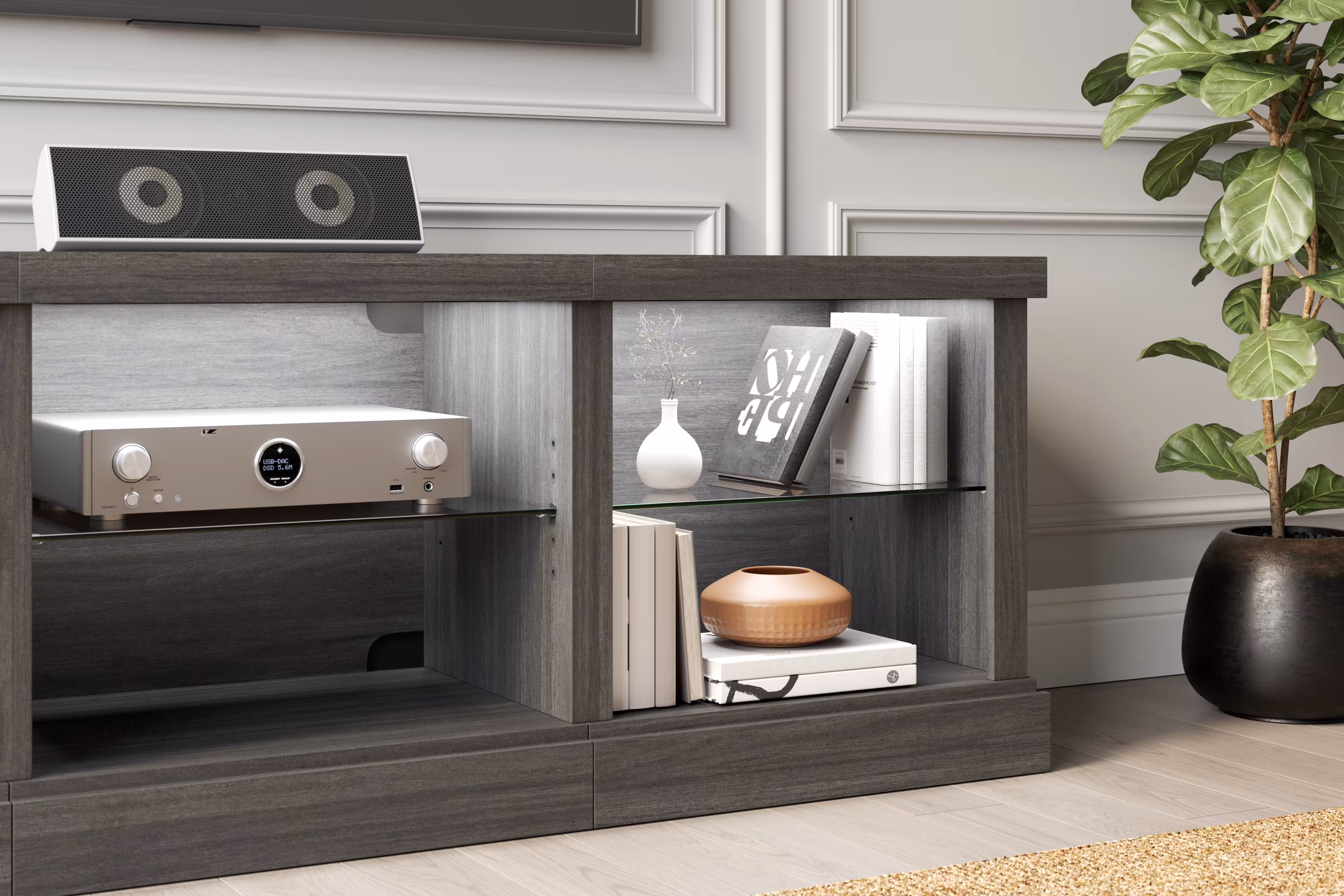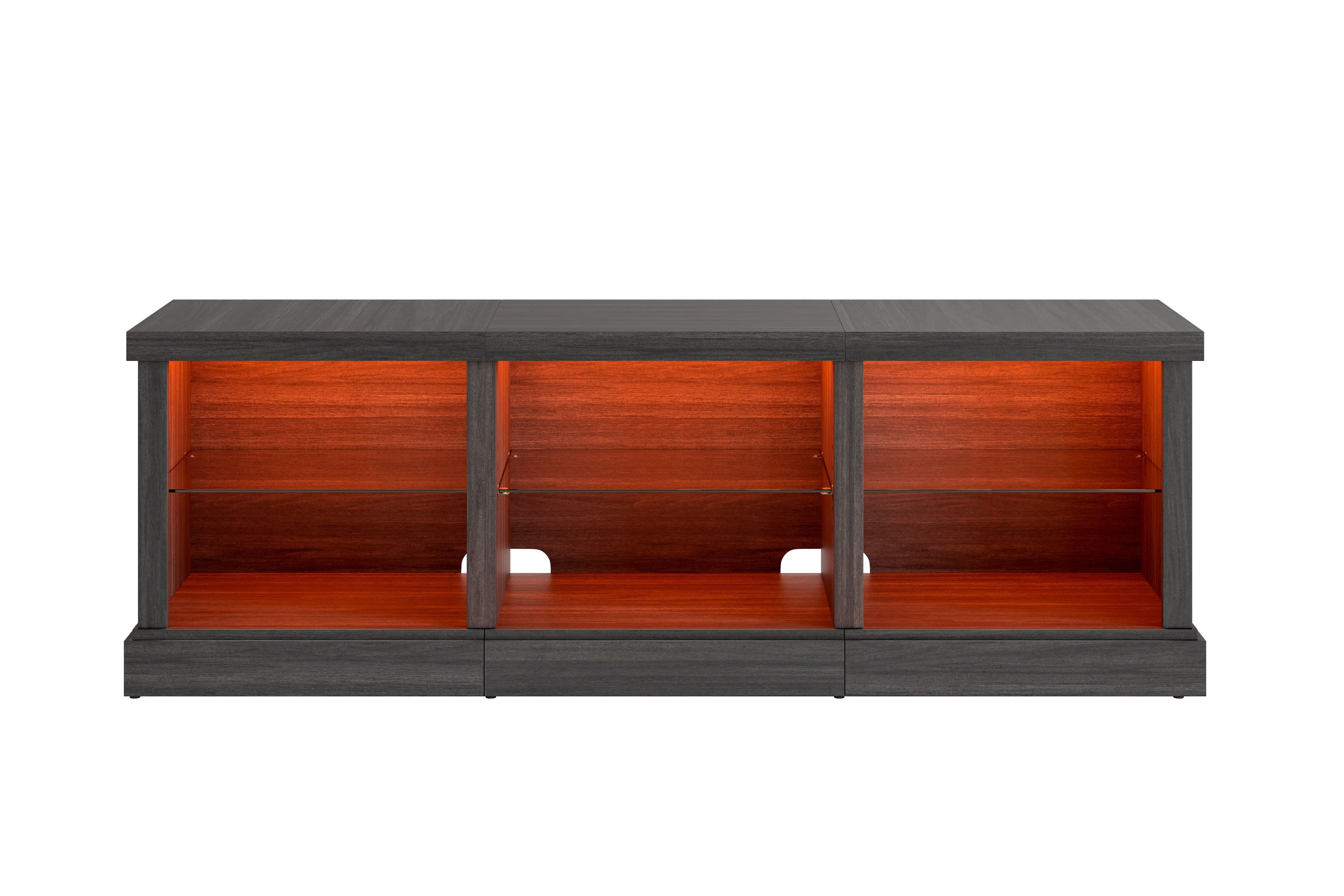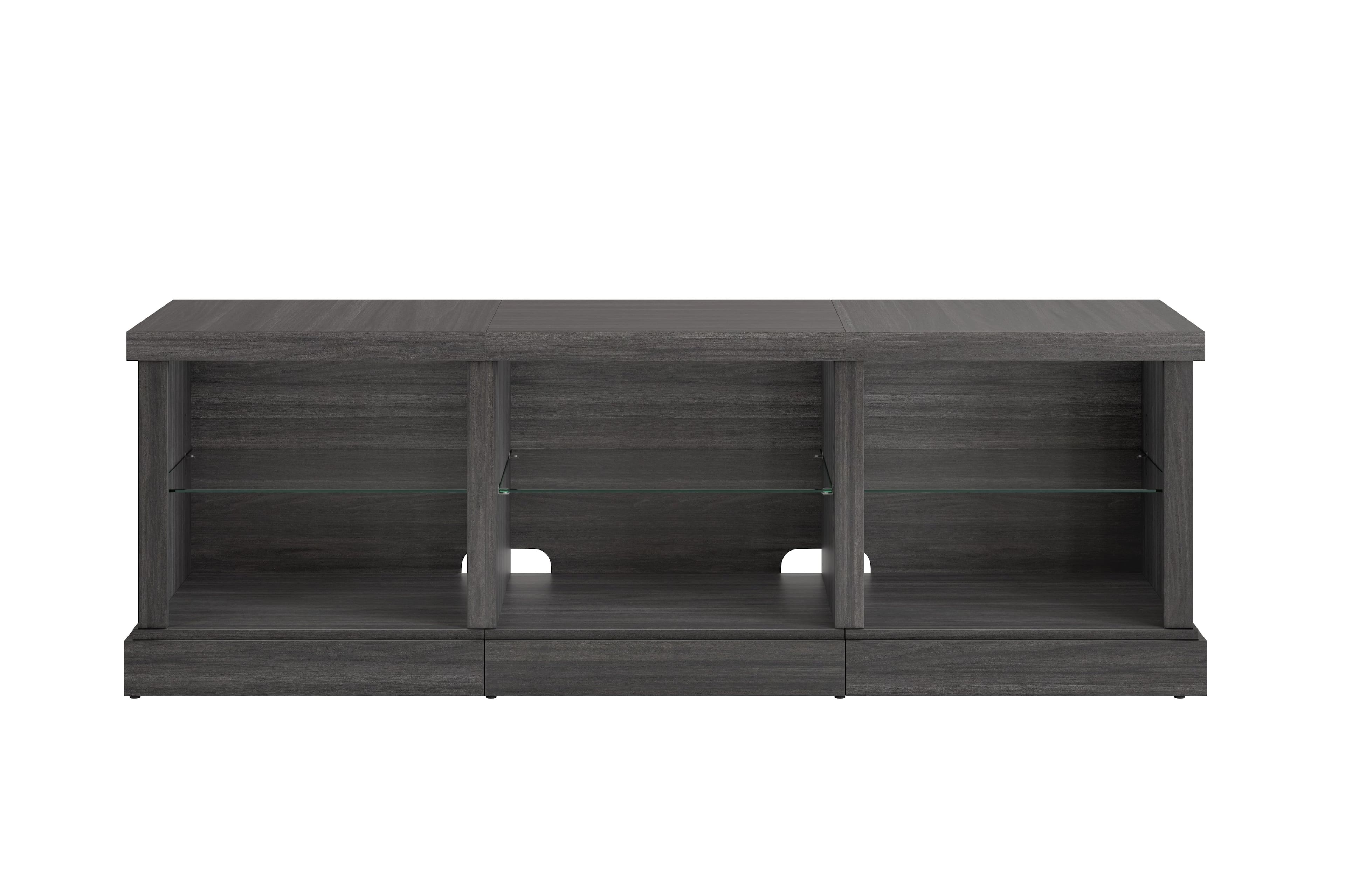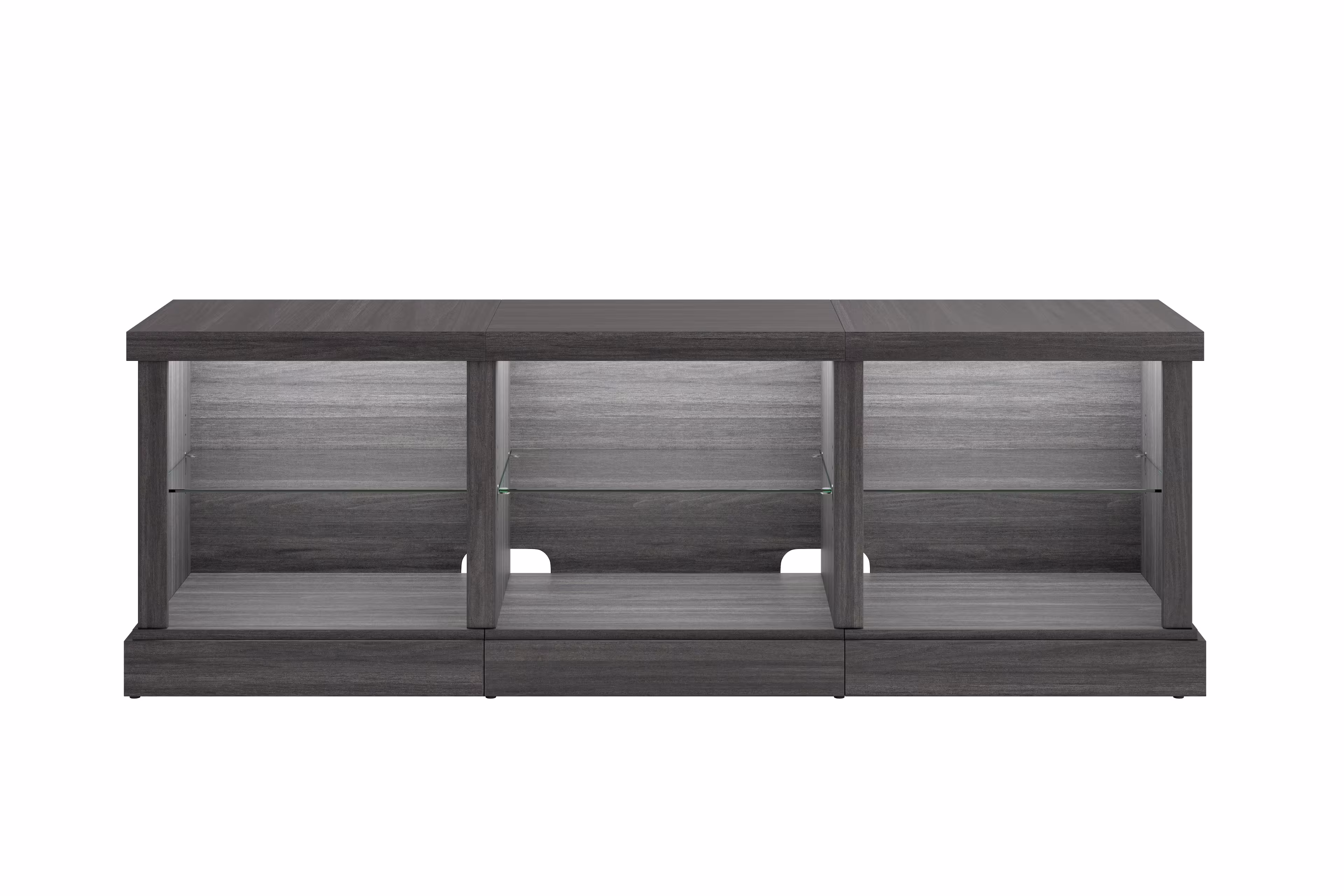 Create an atmosphere for entertainment that feels sleek and modern with the Ligero 65in Steel Gray TV Console. This versatile piece allows you to set the mood of your space or bring attention to your favorite collectibles. For a more personalized look, the console is enhanced with different lighting options that are great for creating a more personalized ambience in your space. It was constructed to accommodate a variety of different-sized audio and video devices with its open and customizable shelving, in addition to being durably made to sustain the weight of most flat-panel TVs up to 75”.