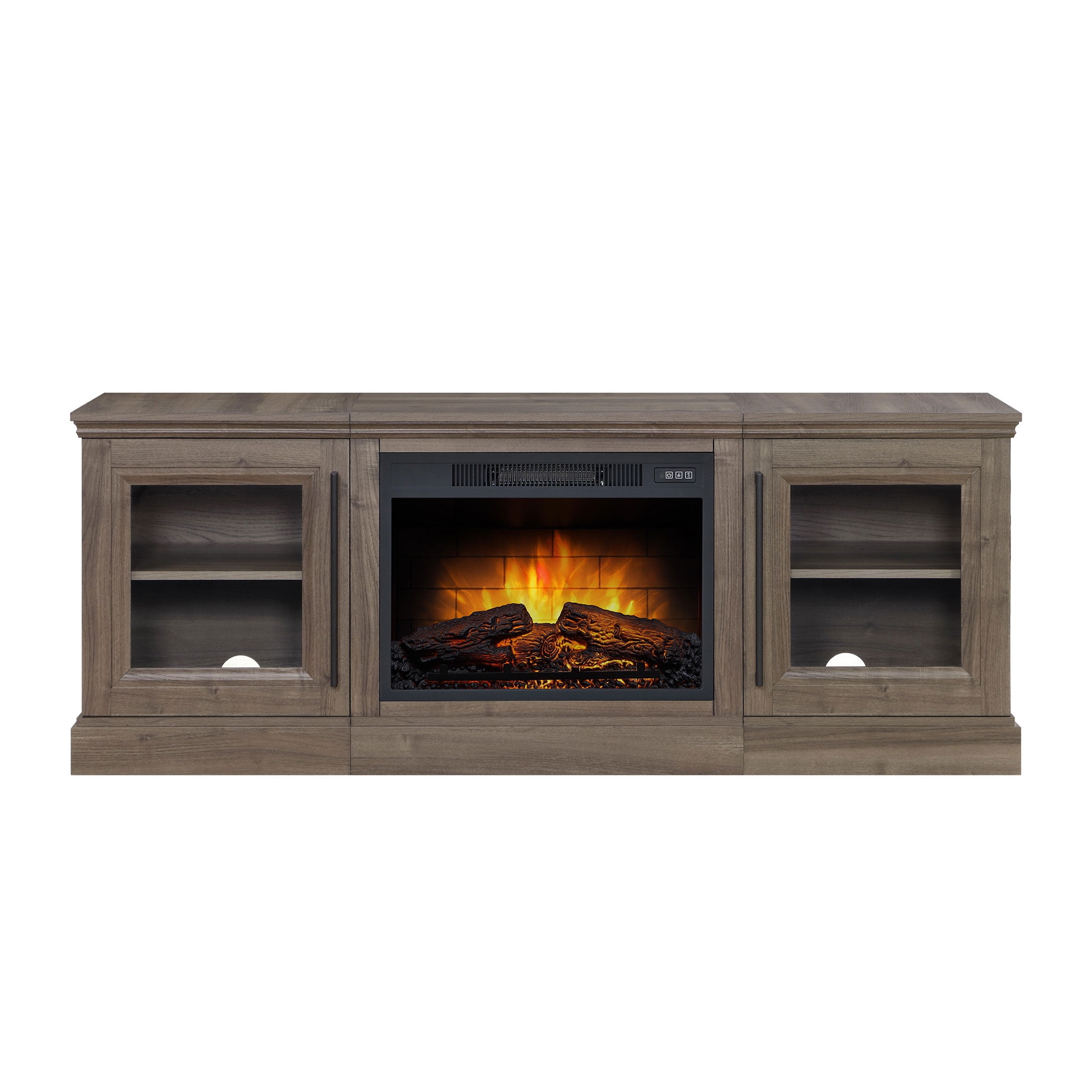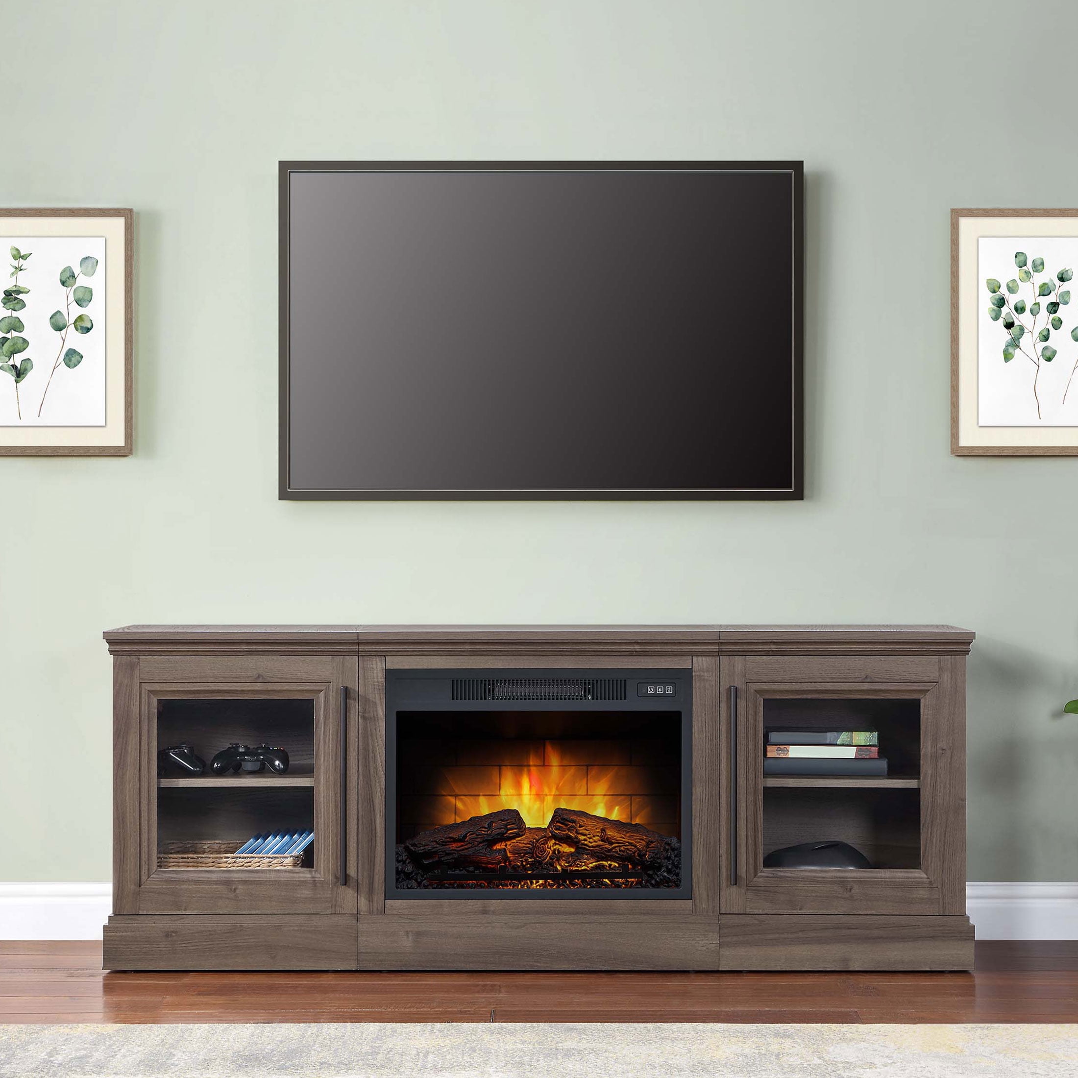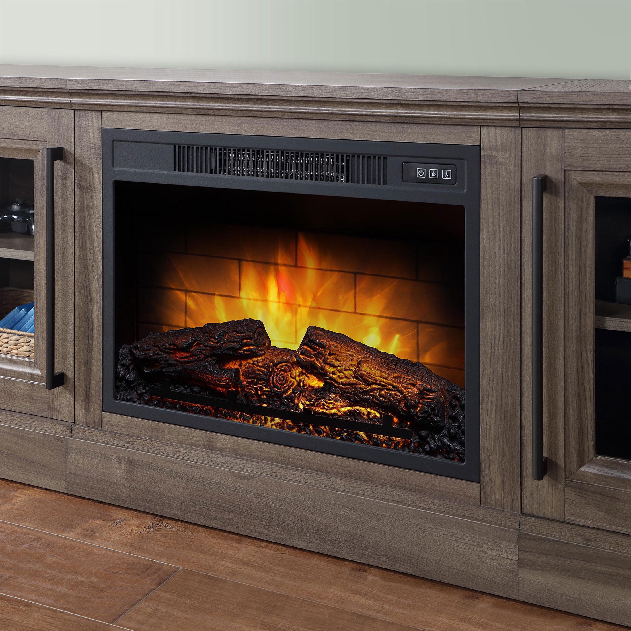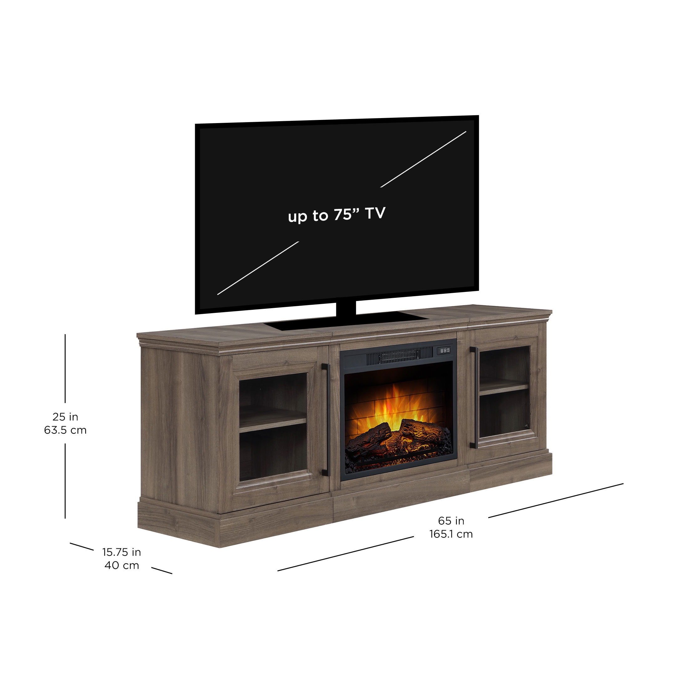 For 75″ Flat Panel Televisions TV weight capacity: 100 lbs (45.4 kgs) – Not for use with CRT TVs Spacious side cabinets with adjustable shelves Fireplace insert heats up to 400 square feet Dynamic ember effect Easy-to-use remote control Available in multiple finishes: Brown Ash & Walnut Brown Independent flame and heat control Plugs into standard electrical outlet