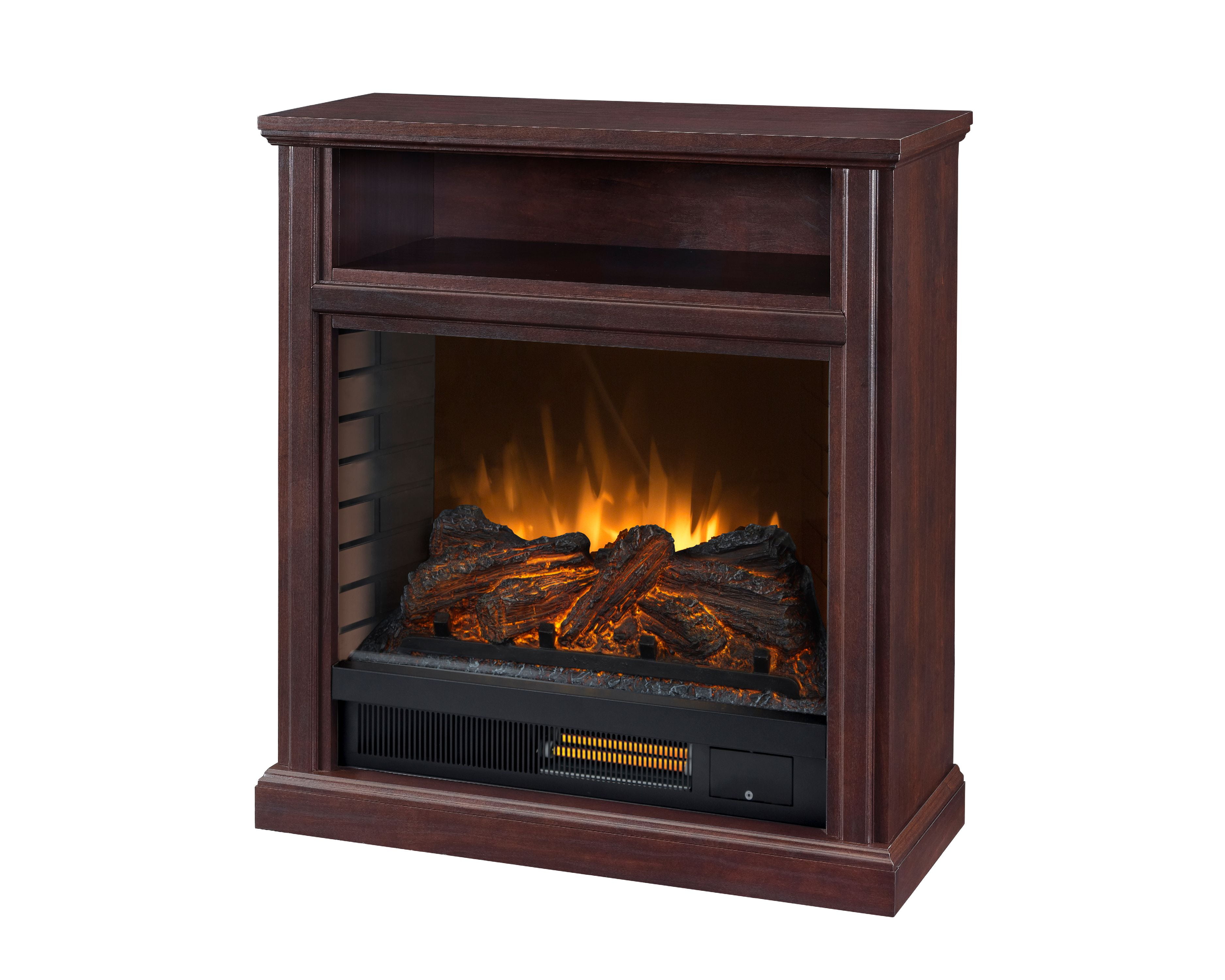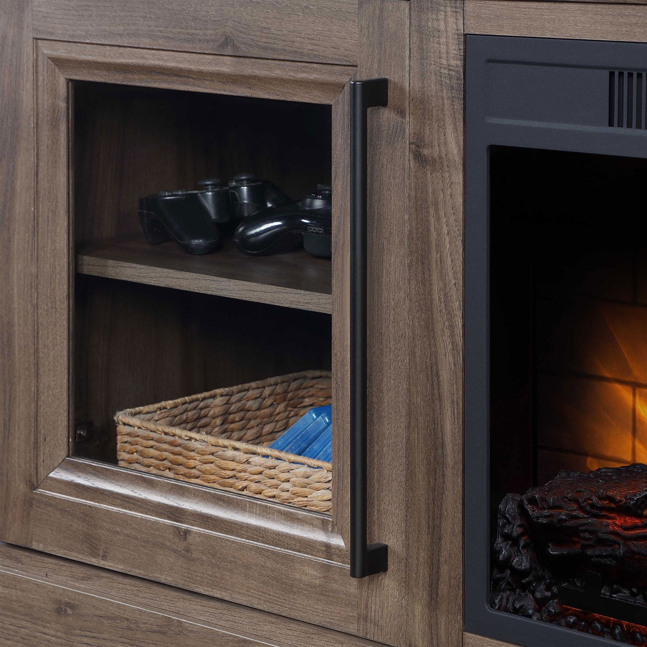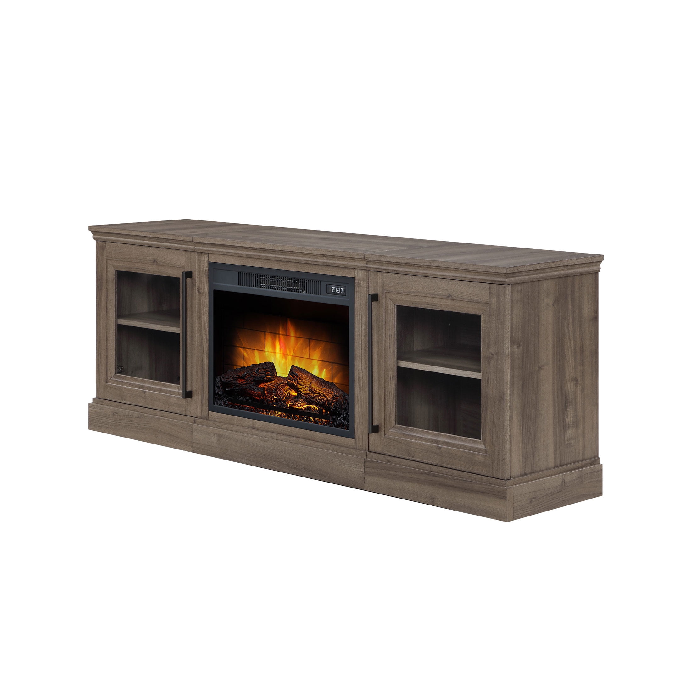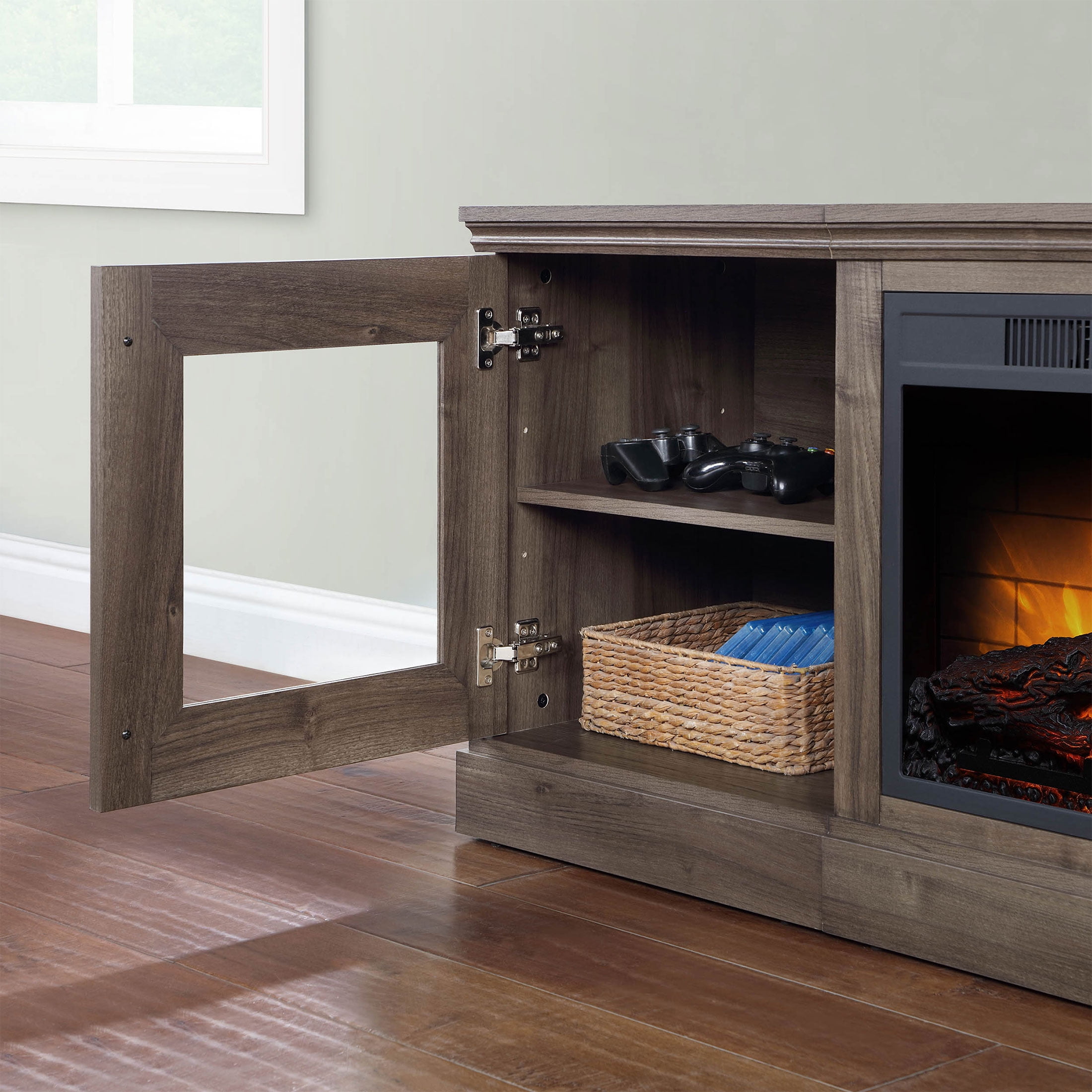 For 75″ Flat Panel Televisions TV weight capacity: 100 lbs (45.4 kgs) – Not for use with CRT TVs Spacious side cabinets with adjustable shelves Fireplace insert heats up to 400 square feet Dynamic ember effect Easy-to-use remote control Available in multiple finishes: Brown Ash & Walnut Brown Independent flame and heat control Plugs into standard electrical outlet