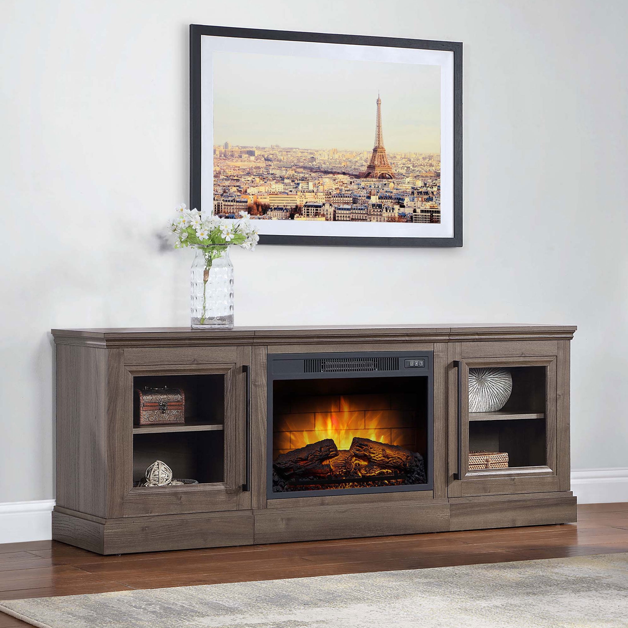This Media Fireplace Console seamlessly merges functional design with aesthetic appeal, offering an ideal solution for both home entertainment and interior decor. Featuring two spacious cabinets, each equipped with adjustable shelves, the console provides ample storage space for media components, game consoles, and other essentials. The cabinet doors feature tempered glass door fronts adding to the appeal of the console. Available in two attractive laminate finish options, brown ash and walnut brown, the console seamlessly integrates into a variety of interior design styles. The gray finish emanates a contemporary and sleek vibe, while the brown finish exudes warmth and a classic charm. The electric fireplace insert is capable of warming spaces up to 400 square feet. Its dynamic ember effect creates a lifelike ambiance, resembling the charm of a traditional fireplace. Complete with a convenient remote control, this insert offers seamless control over its features. Notably versatile, it allows independent use of the heat and flame effect, granting users the freedom to enjoy the soothing visual allure even without the heat. With its efficient heating and captivating visuals, this electric fireplace insert redefines comfort and style in any living space.