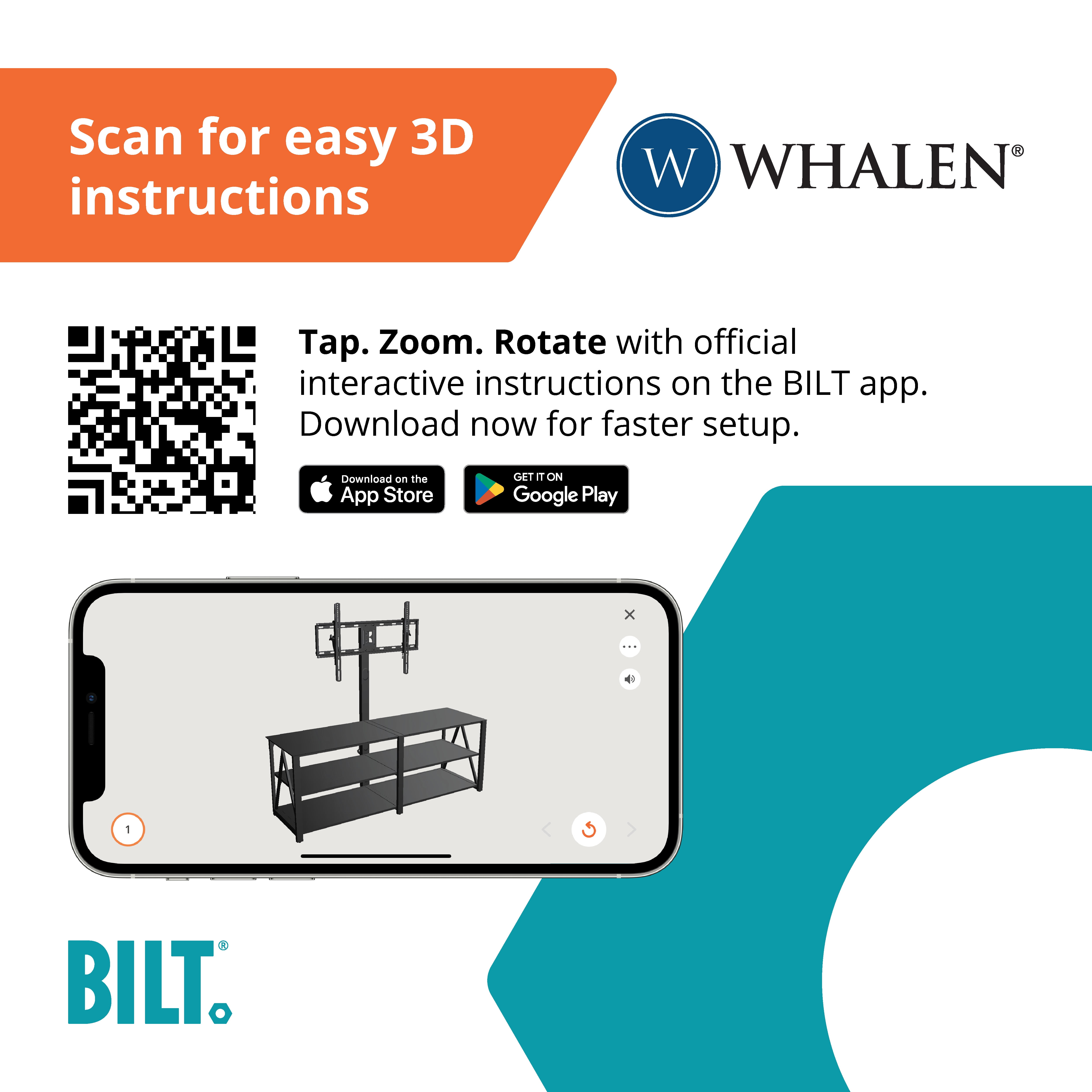 The patented 3-in-1 display system gives you three different options for displaying your TV Swivel, wall-mounted or table-top display options give you the optimal viewing experience Swivel and wall mount fits most TVs up to 82″ and 135 lbs Tabletop fits most TVs up to 70″ and 80 lbs Swivel mount pans 45 degrees left or right Wall mount tilts 11˚/-5˚ for optimum viewing Tempered black glass top shelf with matte black or brown lower shelves Durable steel frame with gunmetal finish Storage for media and components Cable management wheels Available in multiple finish options: Black and Brown All mounting hardware included Floor leveling system Assembly Required 3D interactive assembly guide available through free BILT app (Download from the app store or Google Play) Dimensions: 60in W x 20.5 in D x 22.25 – 55.75in H (152.4 cm x 52.1 cm x 56.5-141.6 cm) Product Weight: 76.28 lb Packaging DImensions: 35.25 in W x 23.5 in D x 9.75 in H Packaging Weight: (87.9 lb) 39.9 kg Model# XL-45BK-EC, XL-45BR-EC