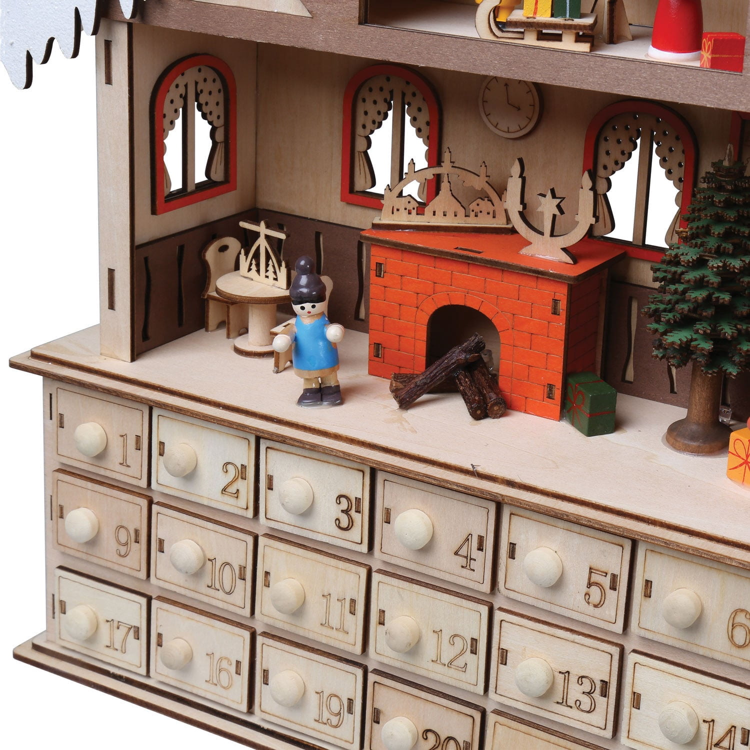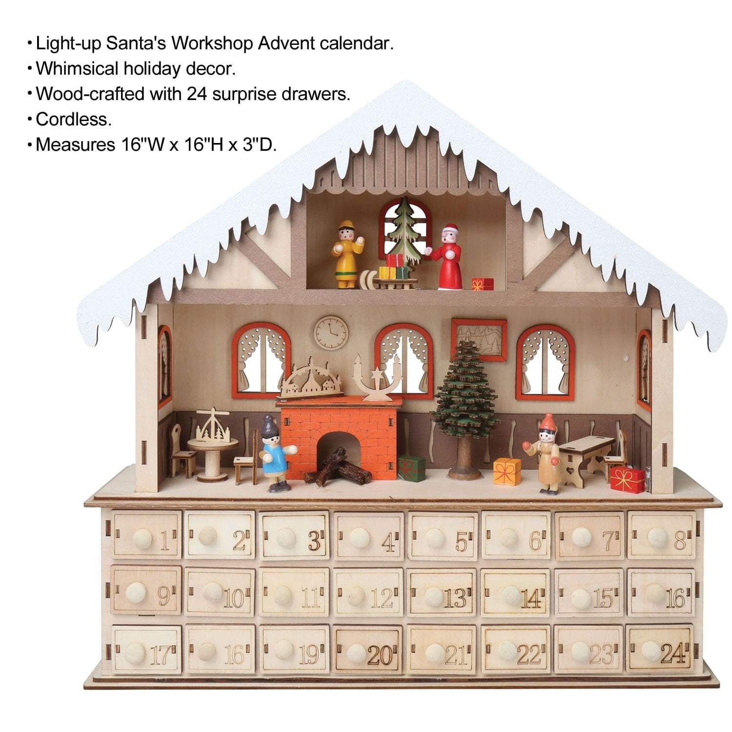 CHARMING WOODEN CHRISTMAS DECOR – Start a new holiday tradition with this enchanting wooden advent calendar. Sure to be an heirloom for years to come, this Santa’s Workshop December calendar countdown will bring Christmas cheer to any room. MAGICAL YULE-TIDE SCENE – Whimsical wooden advent calendar with drawers features Santa in his workshop, surrounded by his sleigh, elves, presents, and more. Children will love flipping the switch on this advent calendar with lights, watching the rooms illuminate. REUSABLE ADVENT CALENDAR WITH DRAWERS – The perfect kids advent calendar, fill each of the 24 drawers with treats, small gifts, money, and more. Kids will delight in opening one wooden drawer each day, leading up to Christmas Day. UNIQUE CHOICE OF ADVENT CALENDAR GIFTS – Empty advent calendar makes a creative, heart-warming birthday or holiday present. Christmas calendar is a wonderful family advent calendar keepsake. COMPLETELY CORDLESS – Wooden calendar advent countdown workshop runs on 2 AA batteries (not included), so it can be displayed on a mantle, dining table, nightstand, and more with ease. Measures 16″W x 16″H x 3″D.