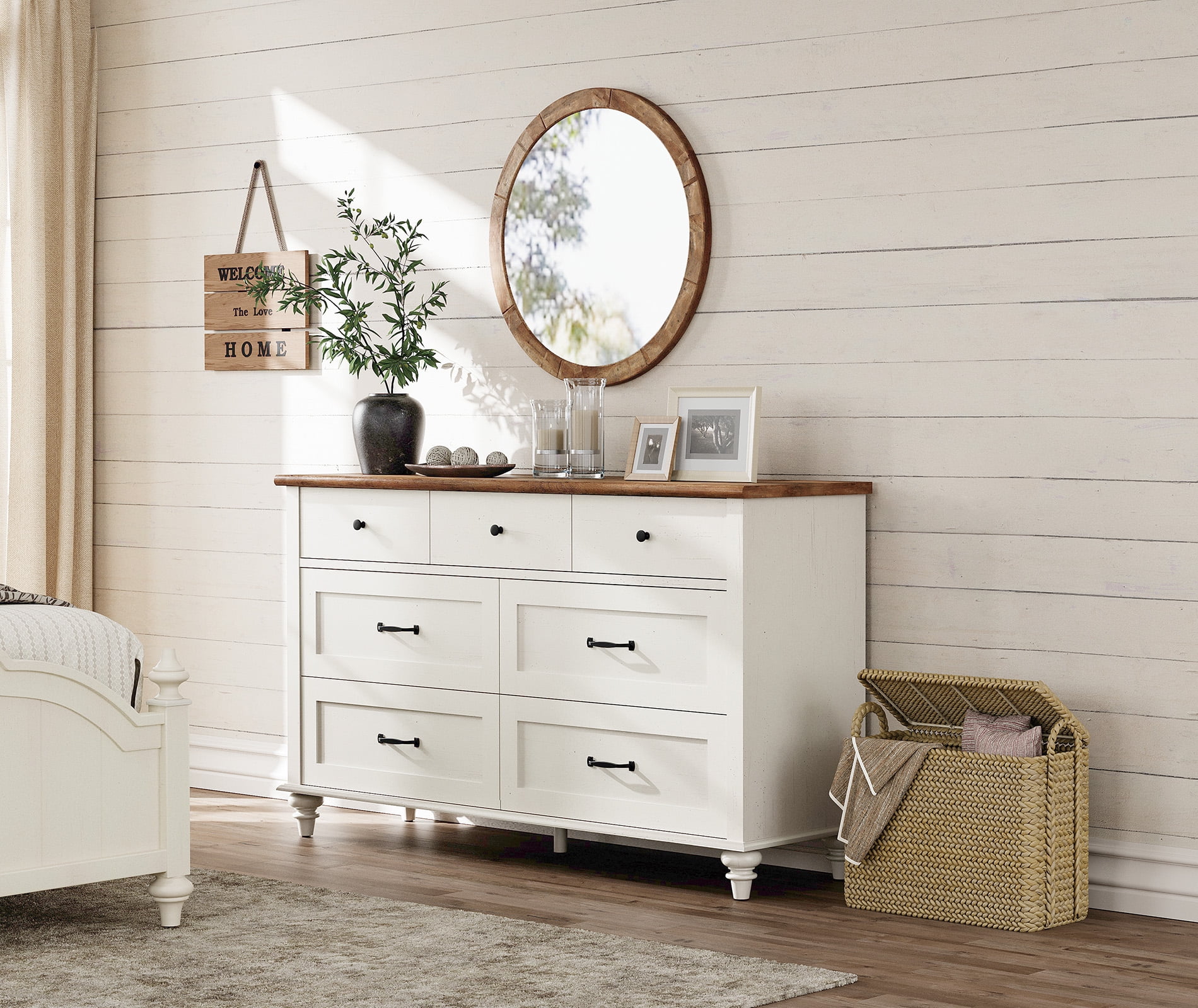 This white dresser is a striking blend of simplicity and functionality. The dresser comes with 7 drawers, offering ample storage space for various items. It is built on solid wood legs that not only add to its aesthetic appeal but also ensure its stability and sturdiness. To enhance safety, the dresser is equipped with an anti-tip device at the back, providing extra support and preventing any potential tipping over. Its white color gives it a clean, sleek look, making it a versatile piece that can blend effortlessly with any room decor.