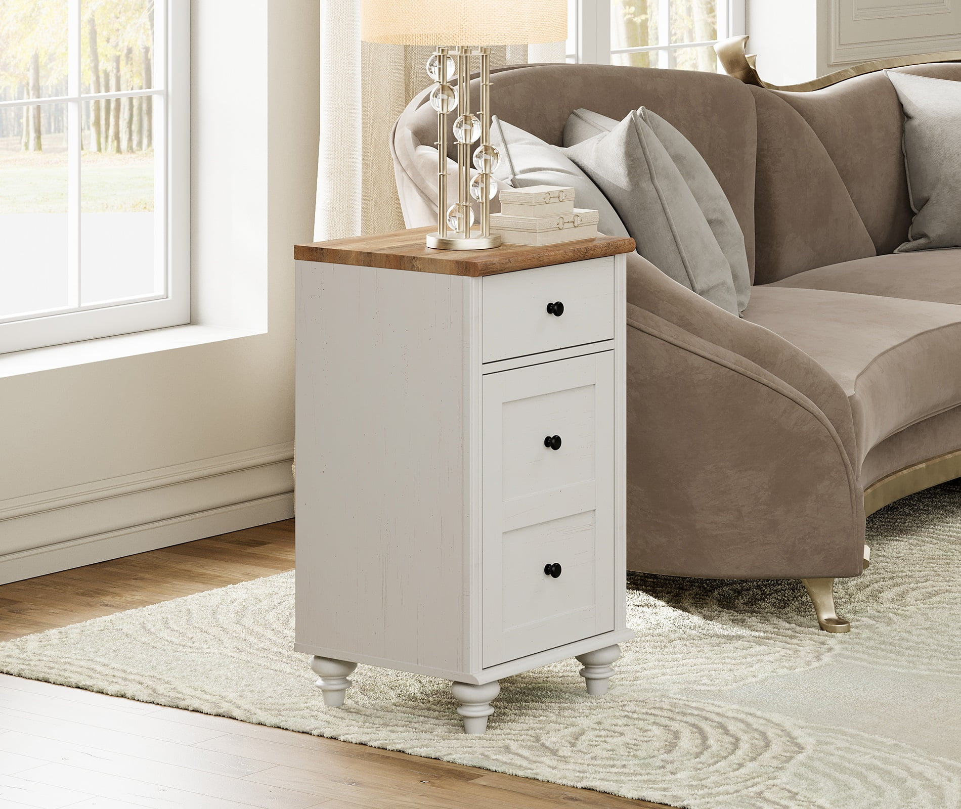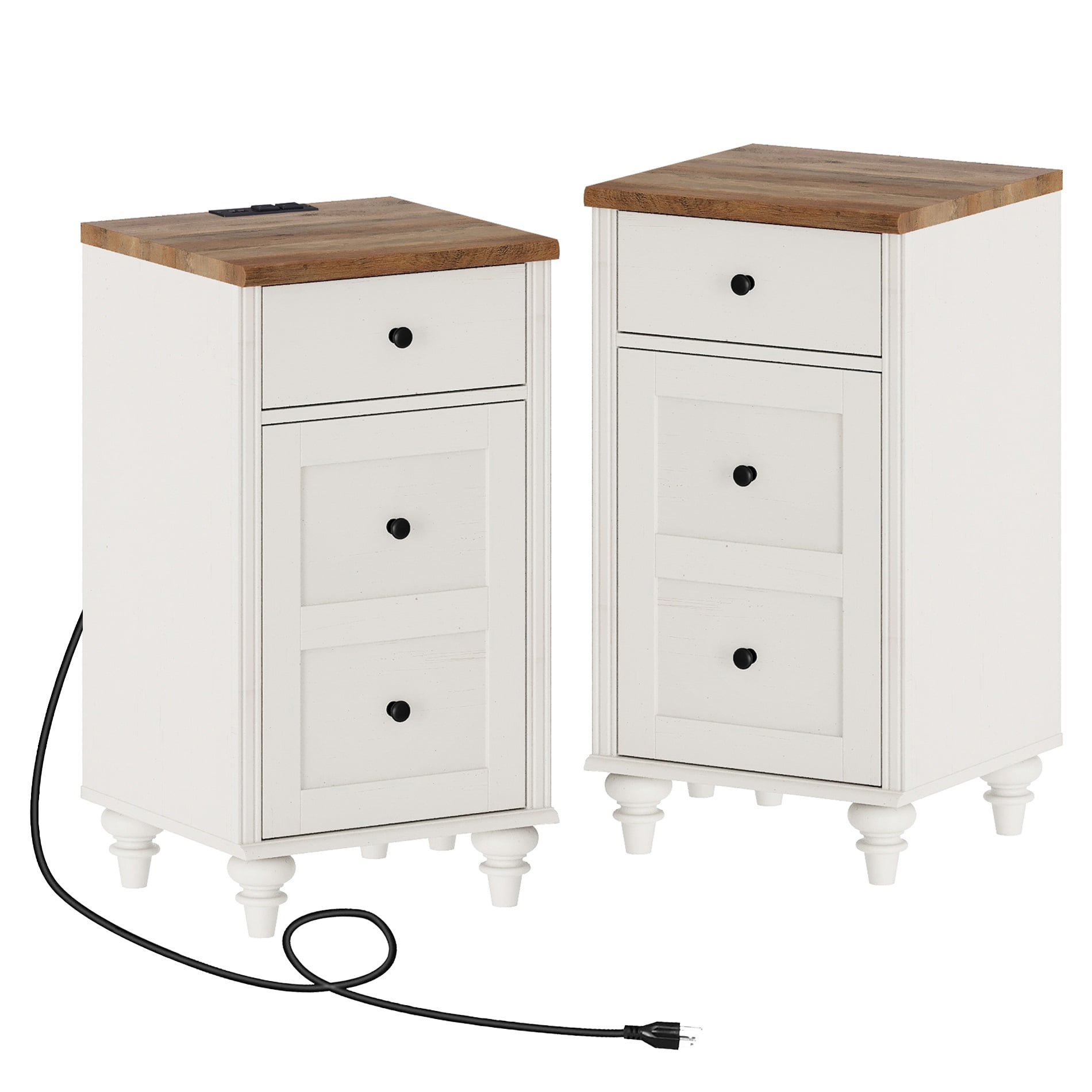 FITUEYES Indoor Farmhouse Medium Density Fiberboard Rectangle End Table, White (Set of 2) Charging Function One of the nightstands is equipped with a charging station featuring 2 standard AC outlets and 2 USB ports allowing you to conveniently charge your mobile phone table lamp and other devices Power cable length 6.5 ft Multi-Purpose The off-white distressed wood surface and round gourd furniture legs add elegance to any room Overall dimensions 16.5L × 15.7W × 30.9H Ample Storage Space Features one drawer with smooth metal slides for easy opening and closing plus a storage cabinet with a height-adjustable shelf perfect for organizing books glasses and personal belongings Premium Material Made from thickened premium MDF board that is safe and environmentally friendly The high-quality waterproof surface is easy to clean and maintain ensuring durability and excellent wear resistance Easy to Assemble The nightstand comes with detailed instructions for effortless assembly Its surface can be easily cleaned with a soft damp cloth