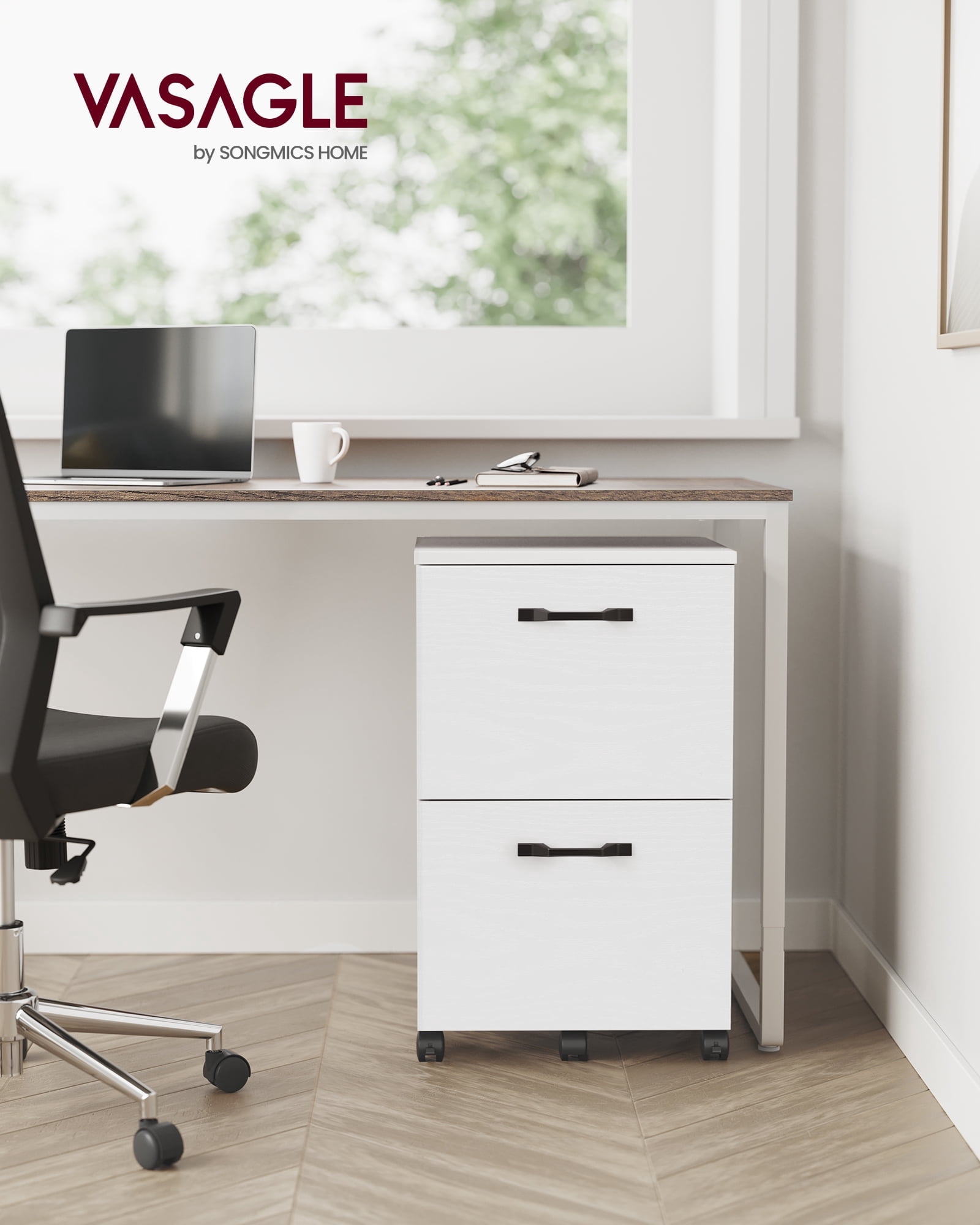 Our file cabinet features a smart, efficient design and fits under most work surfaces or desks. 2 drawer vertical file cabinet is designed for office or home office use. This cabinet is equipped with five 360° smooth-rolling wheels for quiet and easy movement, 2 of which are lockable for extra stability. Simple assembly is required. Each drawer features high-sides to accommodate letter-sized hanging files. Your supplies and files will always be organized and within reach.
