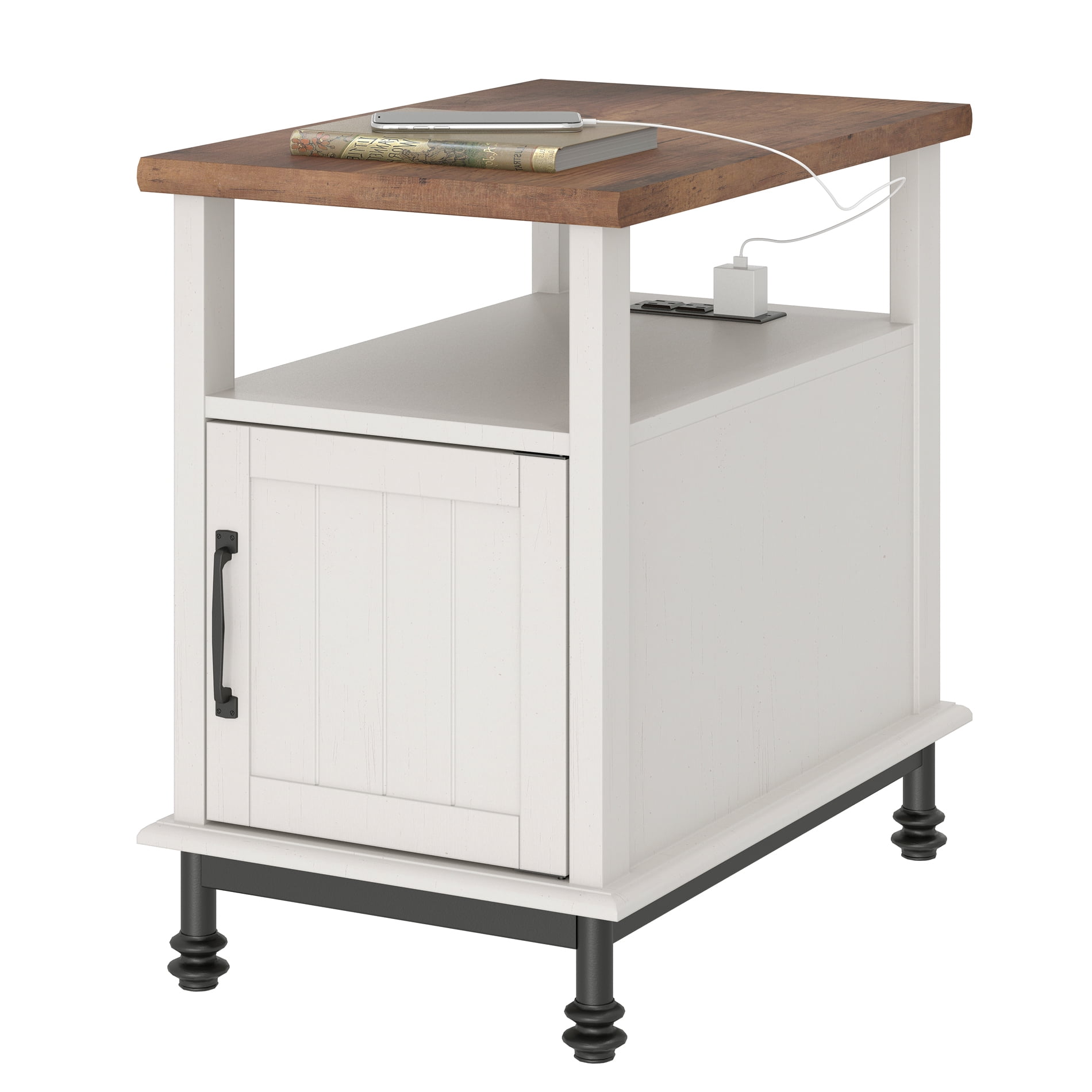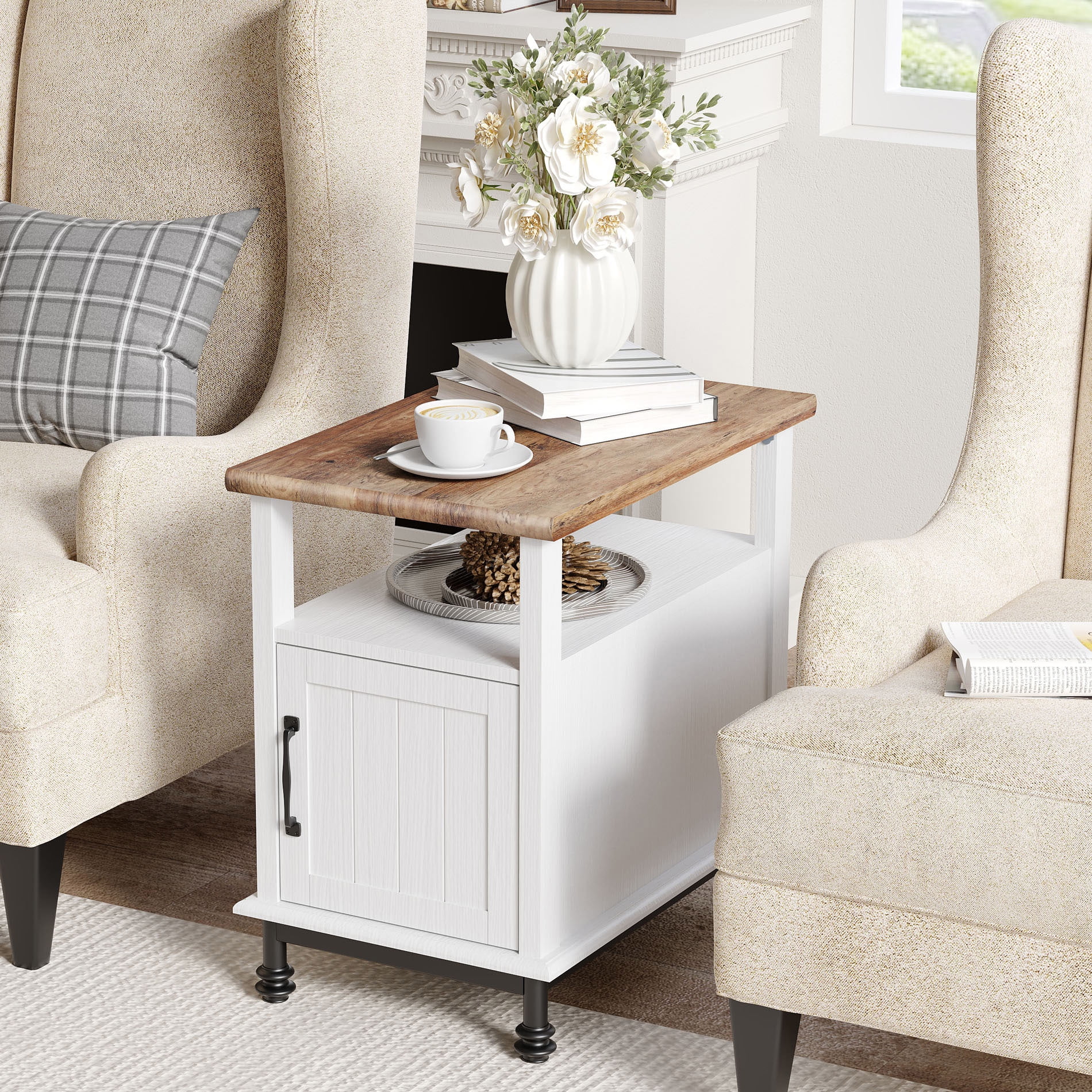 【Farmhouse Style】With its classic colors, this white side table with charging station blends perfectly into any decor and easily creates a stylish vibe in your home. 【Easy-Charging】This small end table has 2 AC outlets and 2 USB ports. The spacing is sufficient, which satisfies you to use multiple plugs simultaneously, keeping power at your fingertips and never worrying about charging when you use your electronic devices on the couch. 【Spacious Storage】Combining open-space storage and hidden storage, the tabletop and middle space are more convenient for placing and accessing items; the hidden storage space with cabinet doors can hold large items and make the room look tidy while preventing dust. 【Premium Material】Crafted from thickened premium MDF board that is safe and environmentally friendly, which will allow you sleep peacefully. High quality waterproof surface treatment, easy to clean and maintain, durable. And the metal legs will offer more stability. 【Super Space-Saving】This narrow bedside table is 14.9″L×23.6″W×22.9″H. The slender shape allows it to fit easily between sofas and beside beds, making the most of small spaces.