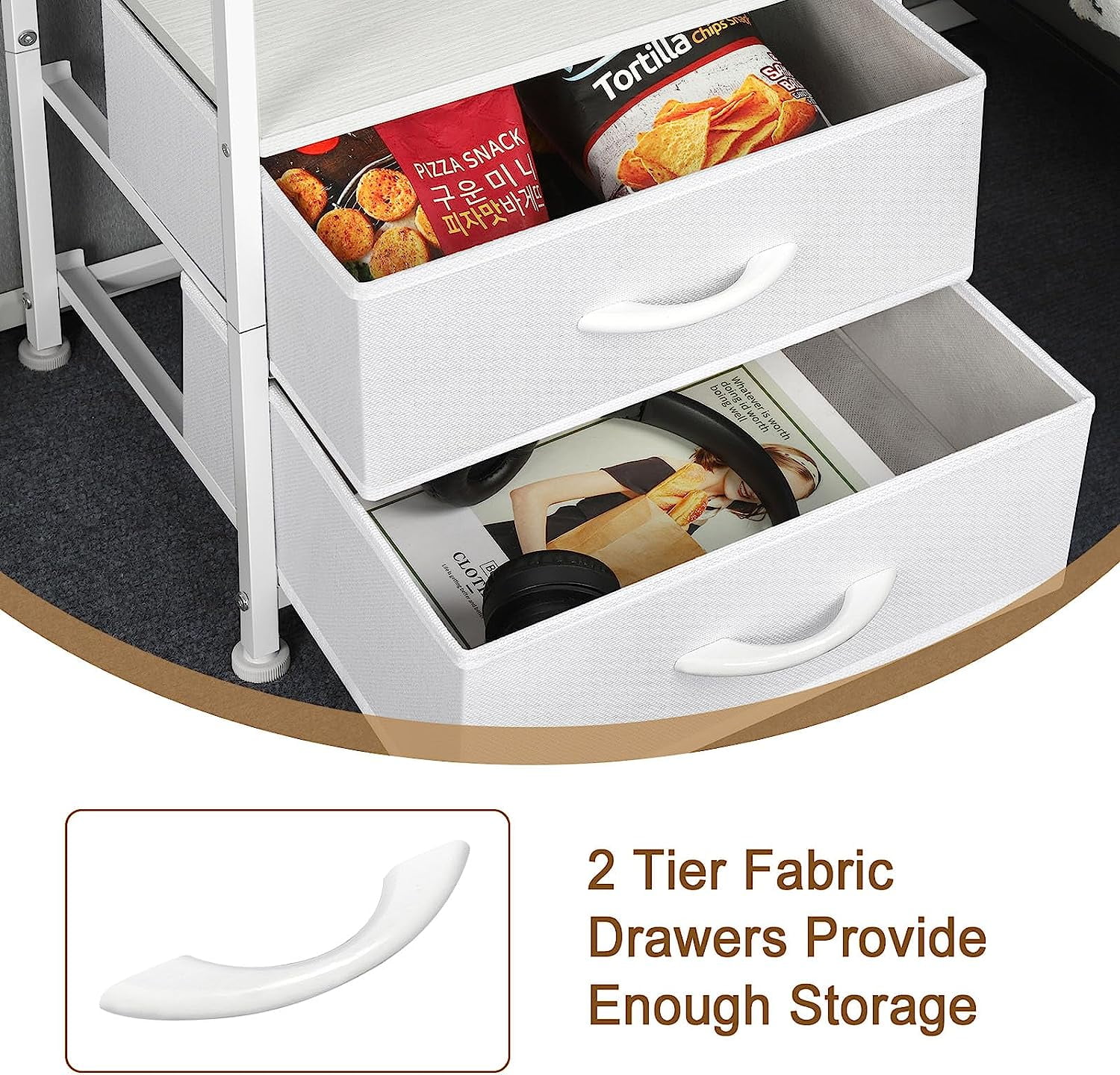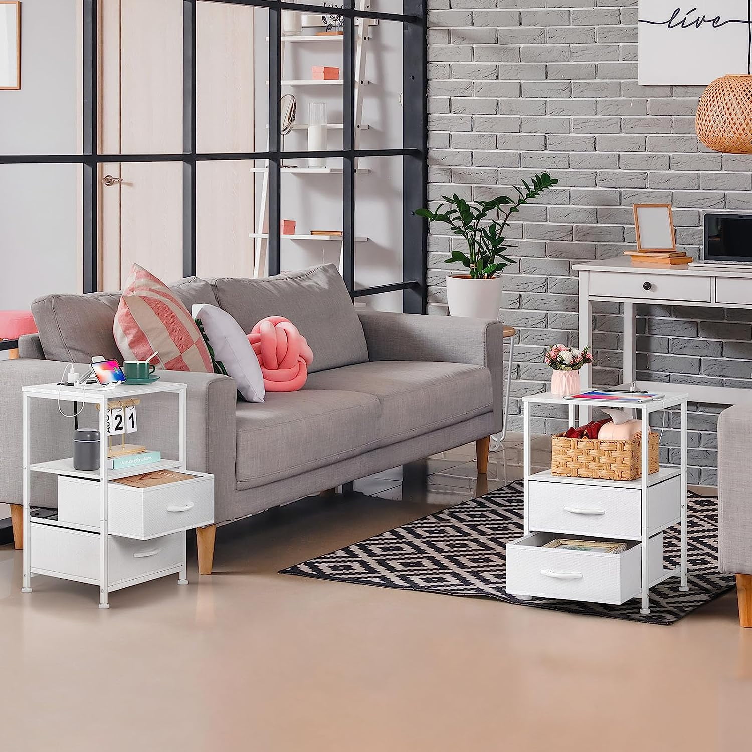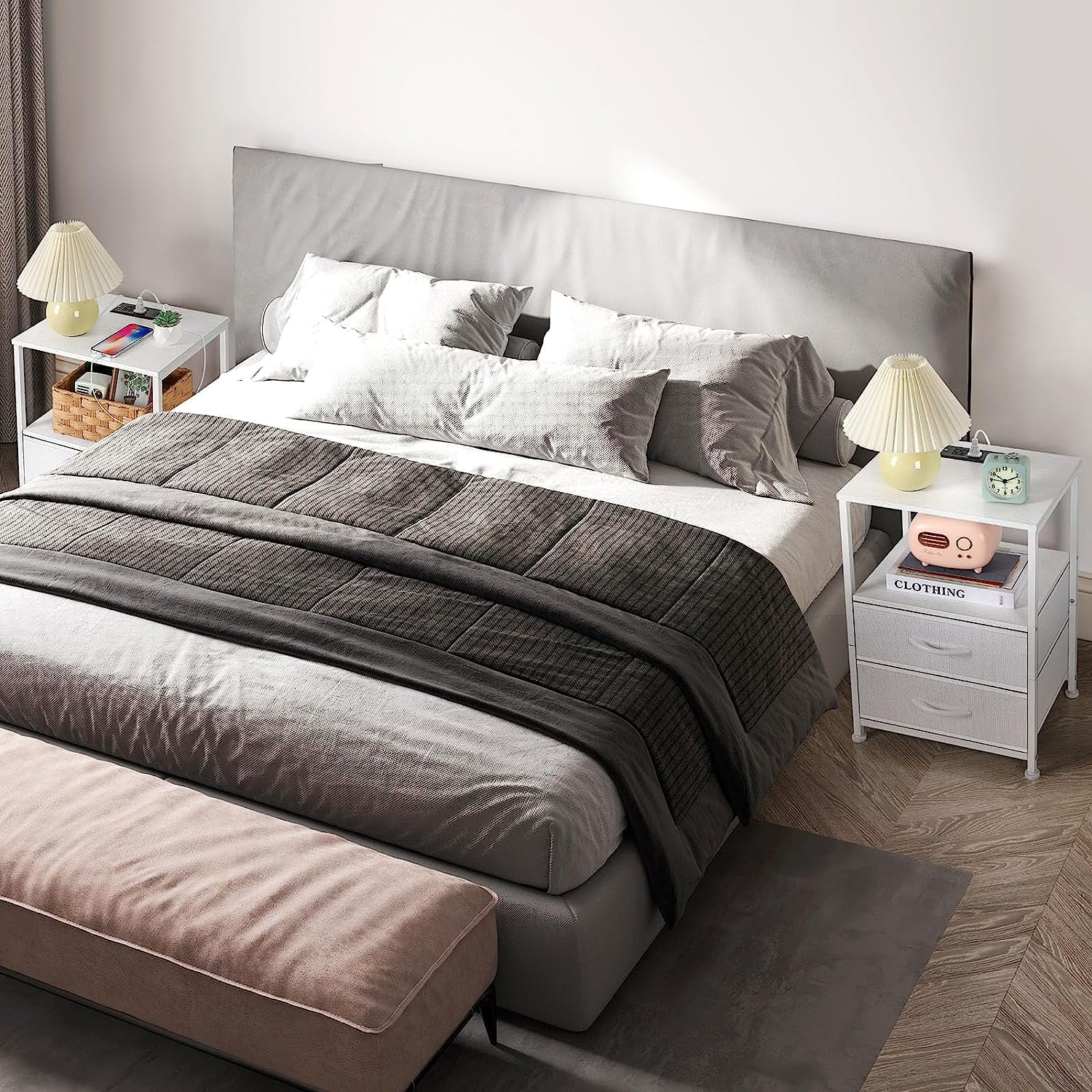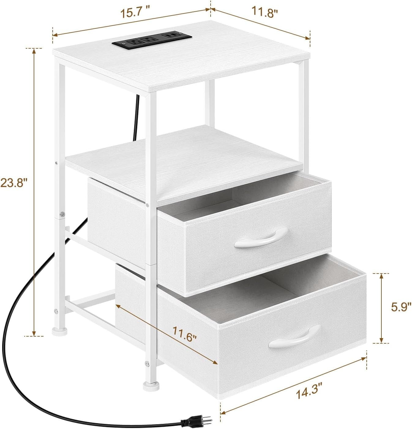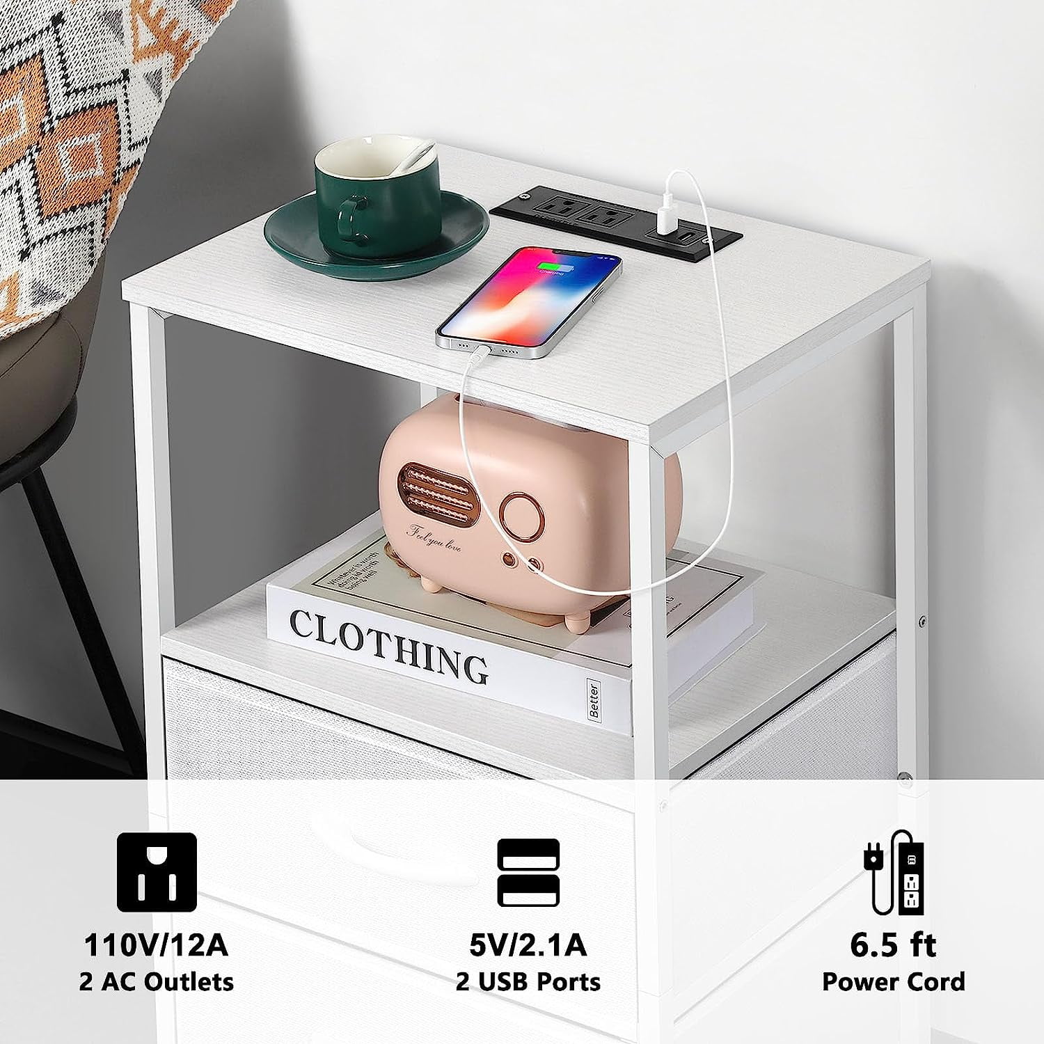 [Fabric Drawers] The nightstand with charging station has 2 fabric drawers and 2 tiers MDF storage. The 2 drawers with smooth glides provide hidden storage for your items and are quiet when you pull the drawers. 2-tier MDF storage provides enough space for a lamp, phone, books and other items. [End Table with Charging Station] The white nightstand set of 2 each has 2 AC outlets and 2 USB ports. Whether you are sitting on the sofa or lying in bed, you can easily charge your mobile phone, iPad, Mac and other e-devices without looking for a socket on wall. [Compact Storage] The total size of bedside table set of 2 is 15.7″ x 11.8″ x 23.8″, which is not too large but can provide good storage space. Each layer of MDF planks has a max weight limit of 20 lbs, and each layer of drawers bears 10 lbs. [White Modern Style] Nightstand with drawers has a white metal frame, white MDF and white fabric drawers. Simple and modern details create an elegant look. You can place side table with storage in a modern or classic room and it will be a perfect furniture. [Adjustable Foot Pads] If your floor is uneven or this table wobbles, you can stabilize the small end table by adjusting the tightness of the foot pads. If you have any question, please feel free to email us, we will solve it according to your idea.