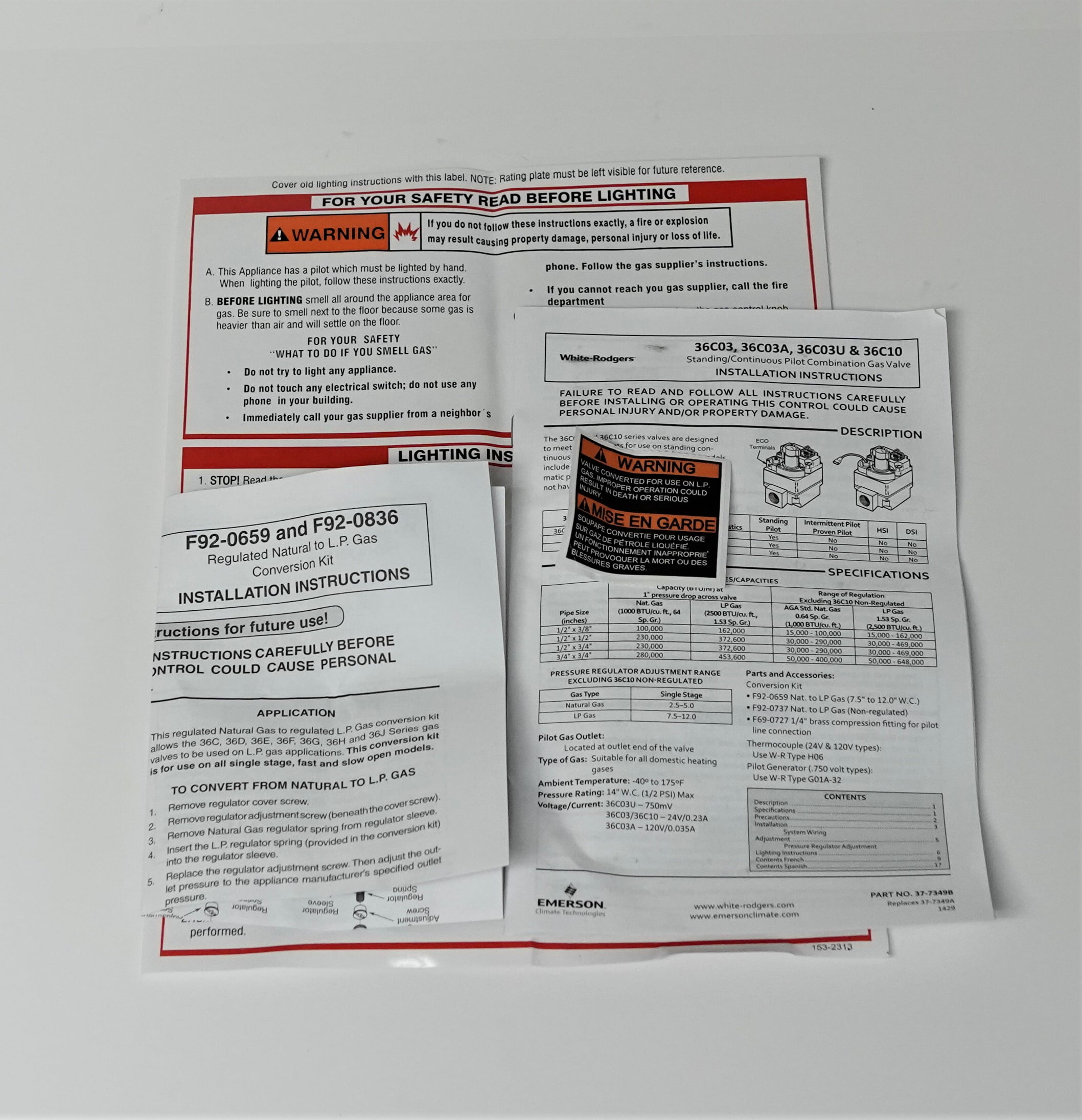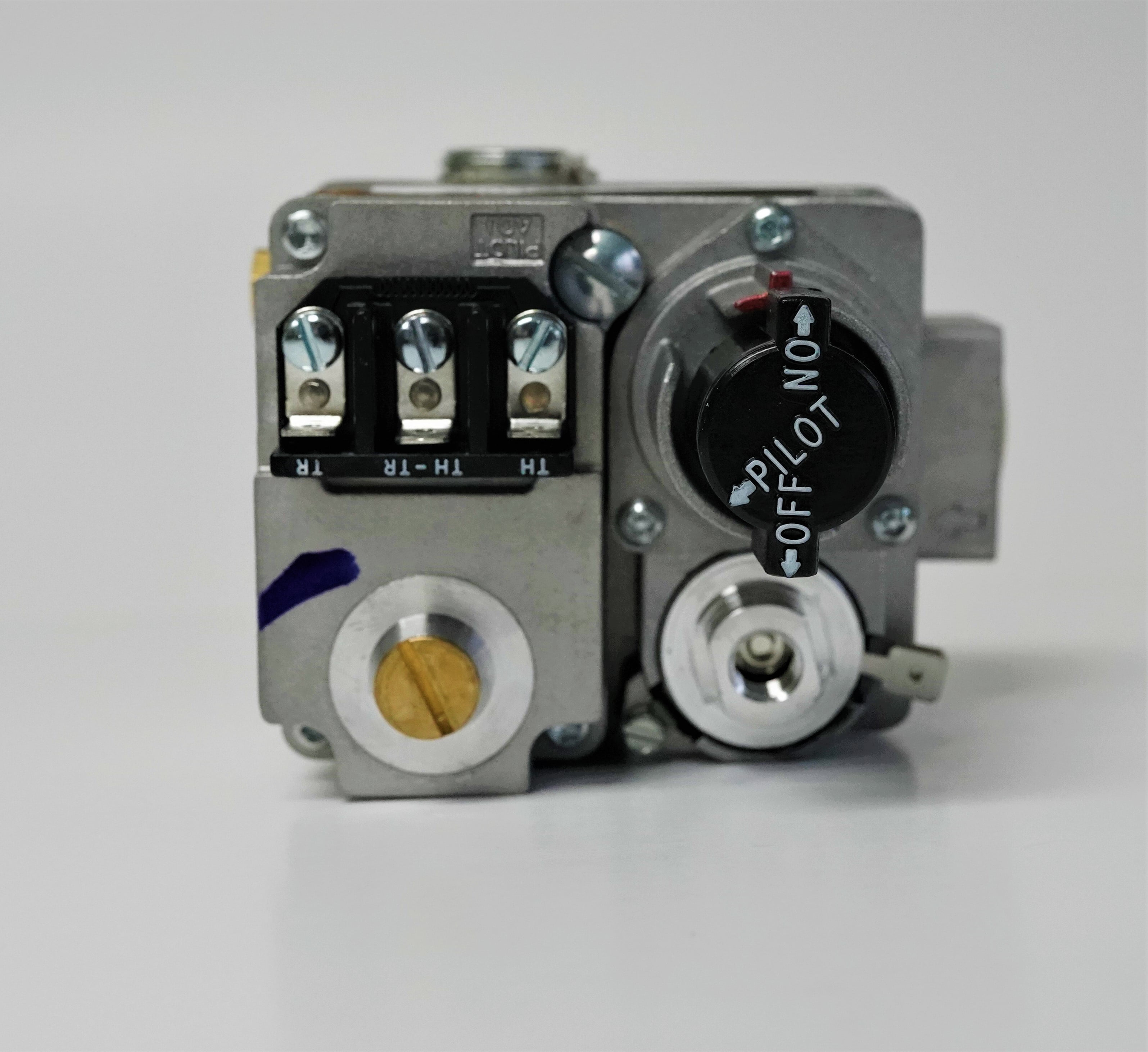 Universal standing pilot gas valve, 24 VAC, straight thru, 1/2″ x 3/4″ NPT, two reducer bushings 3/4″ to 1/2″ and 1/2″ to 3/8″ NPT. Includes LP conversion kit, eco terminals. Can also be replaced by 36C03-333 and 36C03-433.