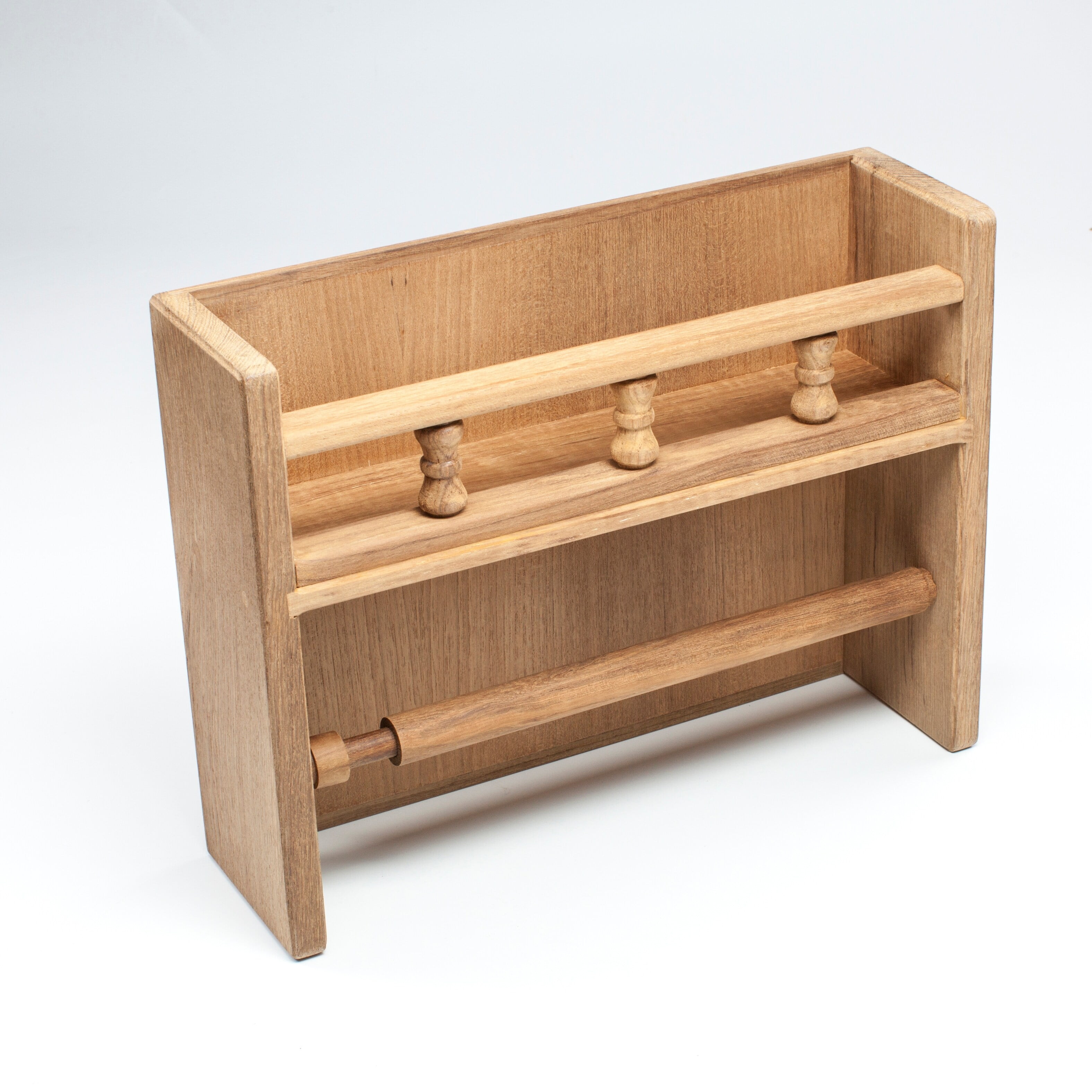 Spice Rack with Paper Towel Holder Made from solid prime aged teak, this spice rack with paper towel holder is made to last. Neatly organize your spices and have easy access to paper towels. Makes a great addition to any kitchen. Solid teak construction Holds standard paper towel roll Spring-loaded bar Natural finish Size: 13-1/16″ W x 10″ H x 3-3/4″ D