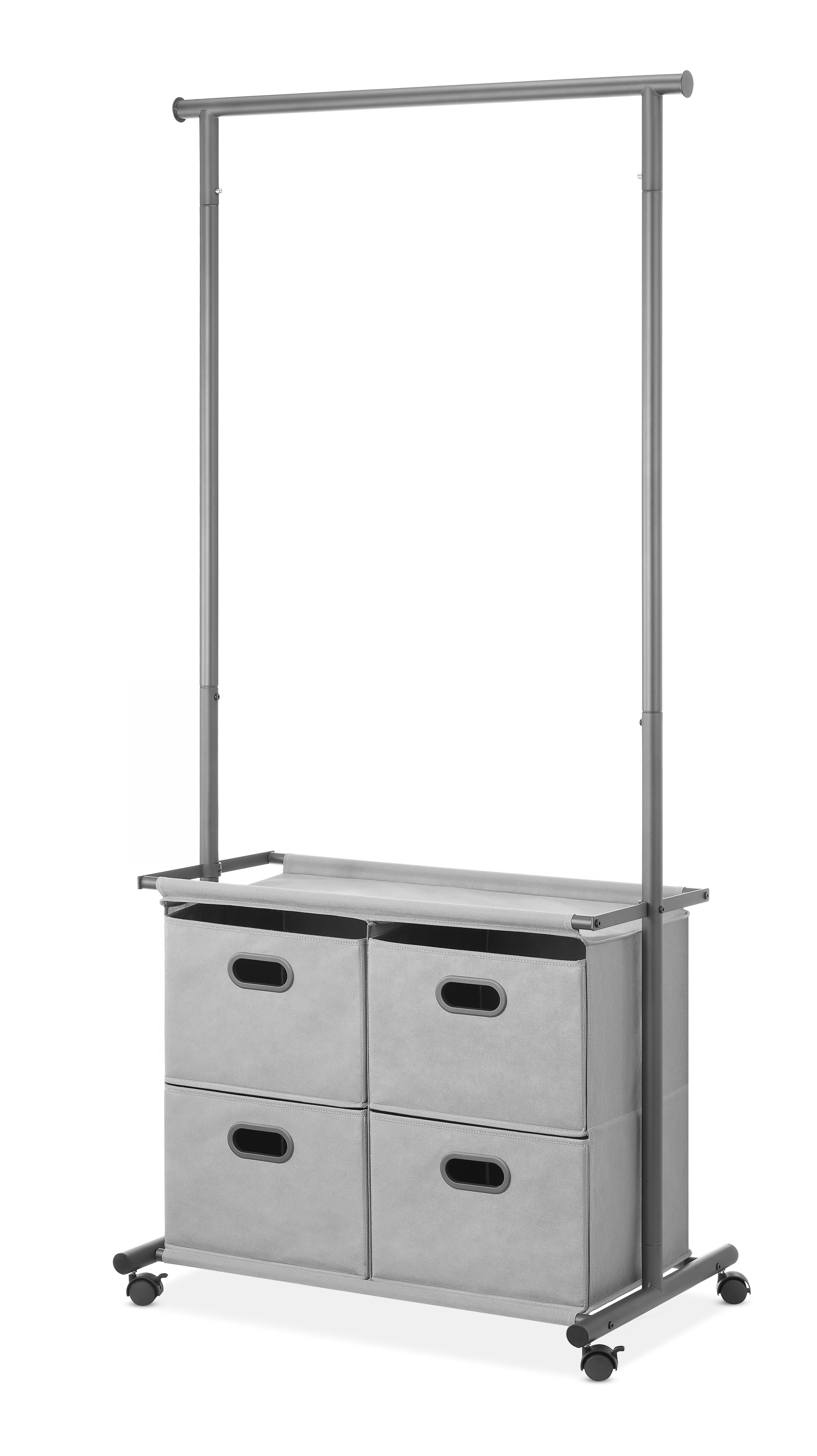 Whitmor’s 4-Drawer Garment Rack features combination storage for both hanging and folded garments. Removable fabric drawers provide concealed storage for socks, undergarments, & accessories. The unit features a durable metal rod and frame with locking wheels. The unit features easy assembly, with all tools included.. Assembled dimensions: 20.0 L x 32.88 W x 70.25 H inches. Whitmor is a 4th generation family-owned and operated business. Since 1946, Whitmor has been dedicated to bringing organization home by creating products that simplify everyday life. Ensuring that those products are built with integrity, value, and innovation is our commitment to you. Whitmor customer service is available in English and Spanish Monday through Friday from 8 am – 4: 30 pm CST. You may contact Whitmor toll-free at 1-888-944-8667 or via email at [email protected]
