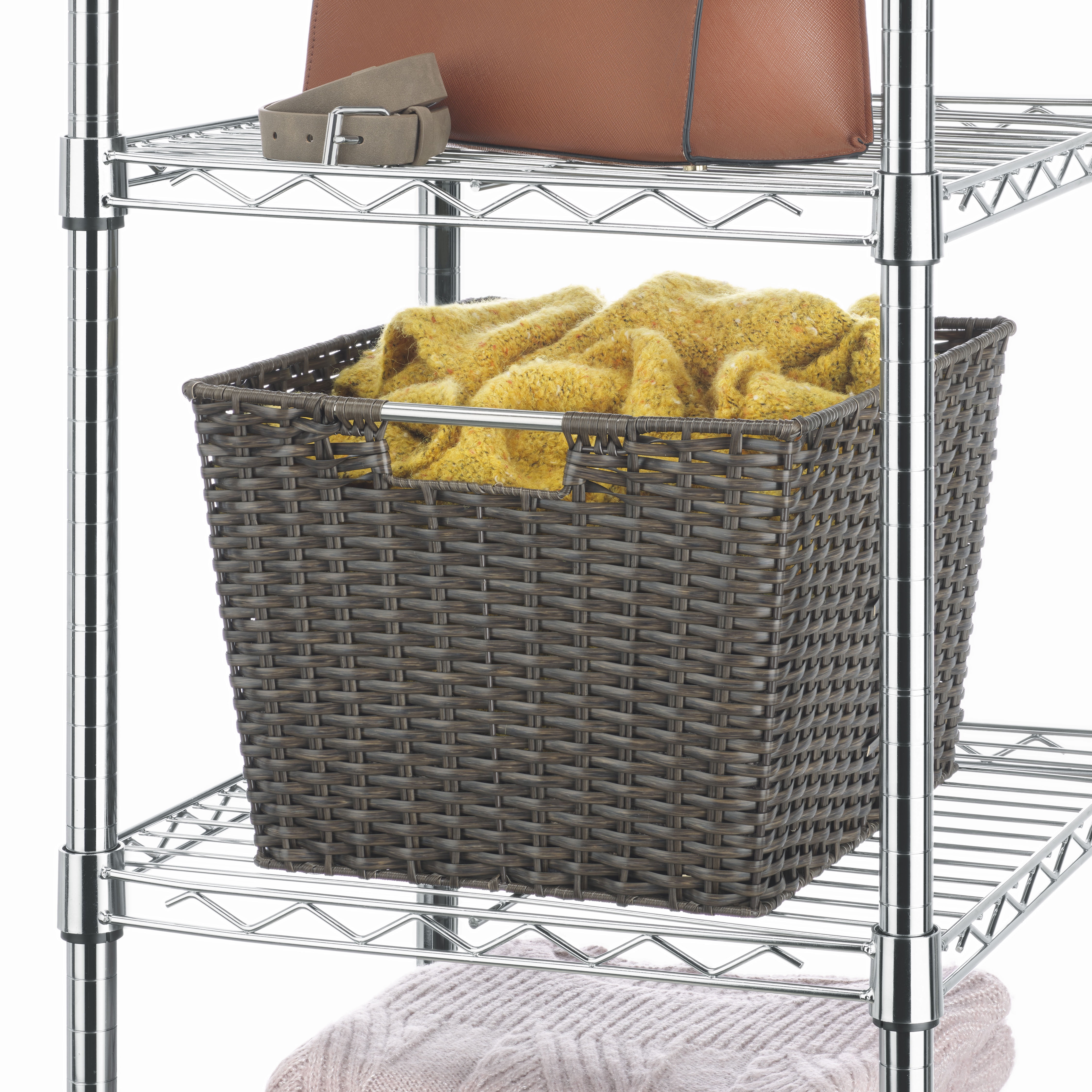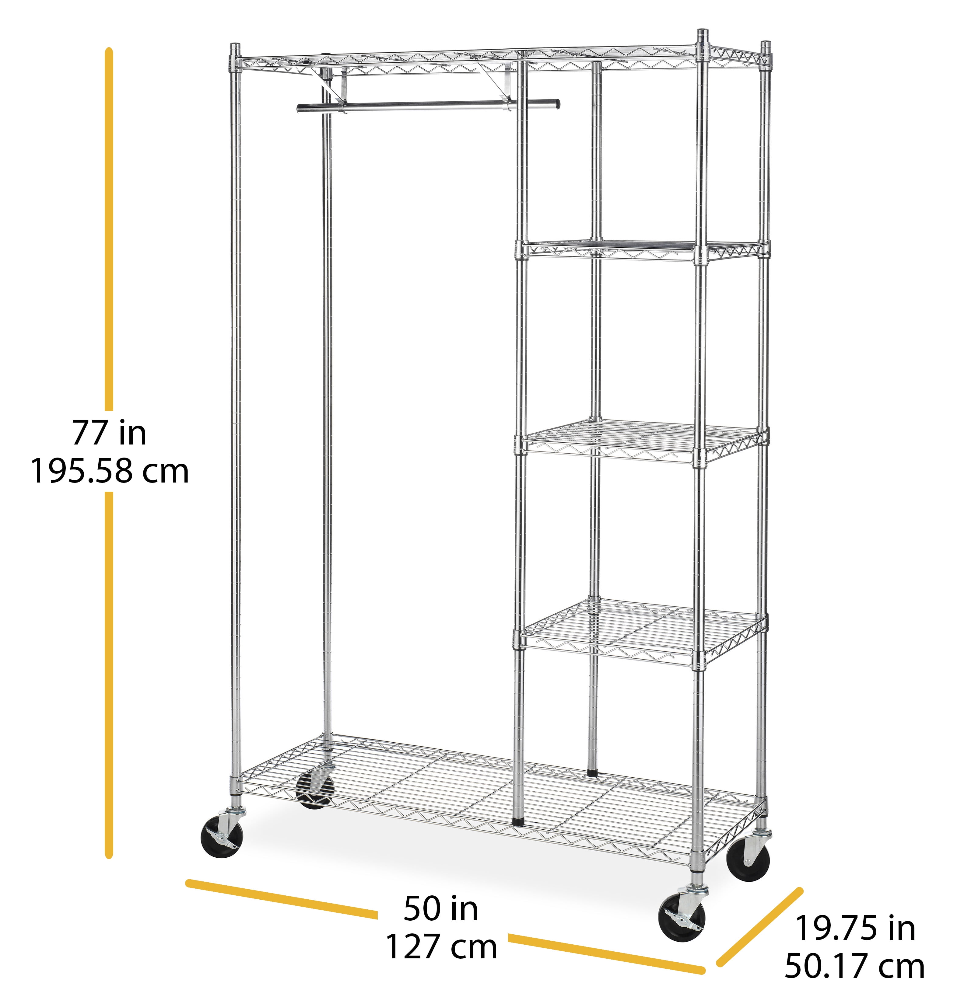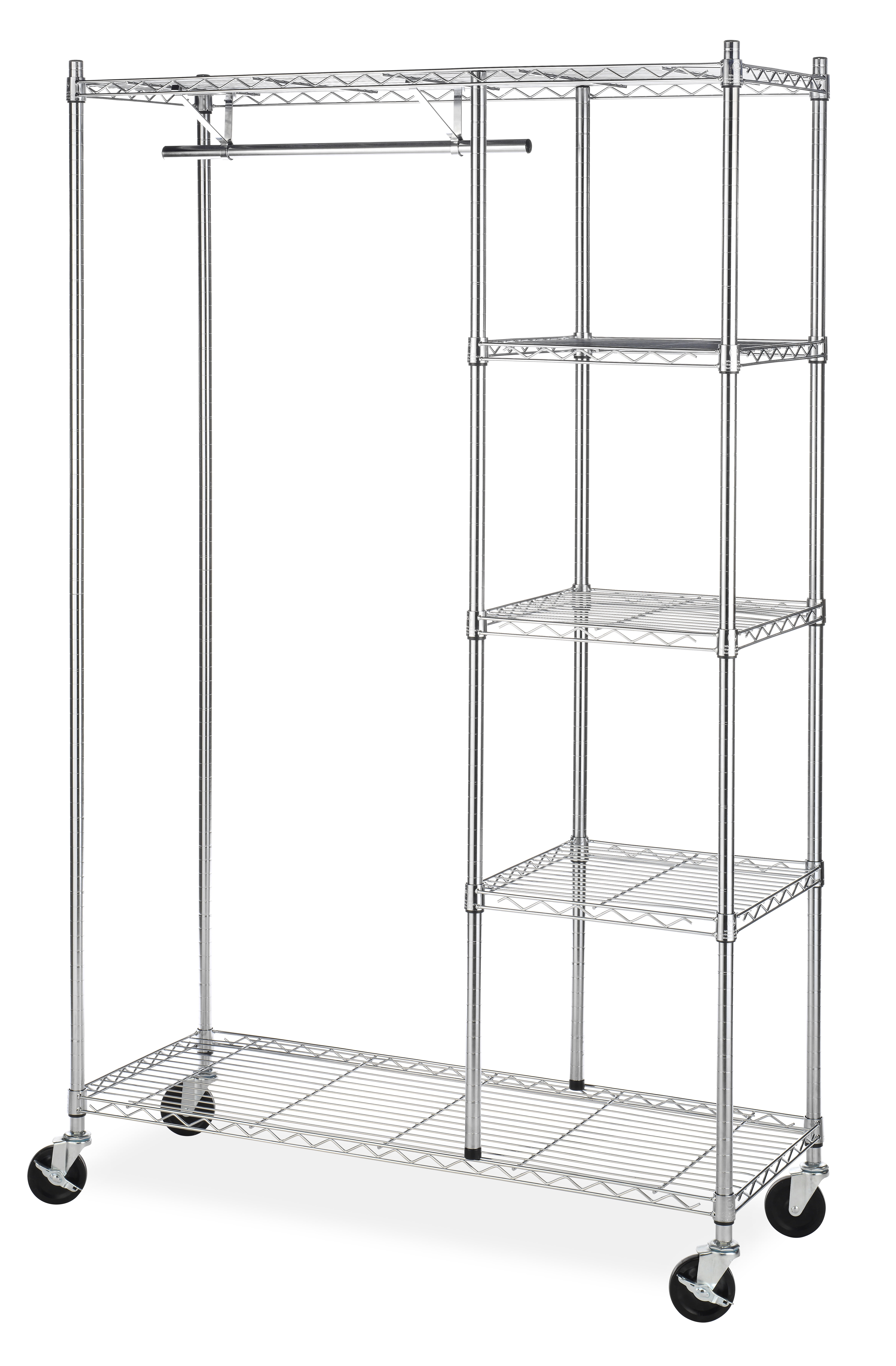 Rolling Garment Rack: No tools are required to assemble this steel double-rod garment rack by Whitmor Heavy-duty chromed steel construction has a 300 lb. capacity with wheels. Locking wheels allow you to roll this heavy-duty garment rack wherever you need it in the home Whitmor’s supreme storage rack has 5 shelves to organize garments, shoes, and accessories Perfect garment rack to organize everyday clothes or to store seasonal garments Dimensions: 19.75L x 50.0W x 77.0H inches Style # 6058-4320-BB, 4-Shelf Rolling Garment Rack, Metal, Chrome