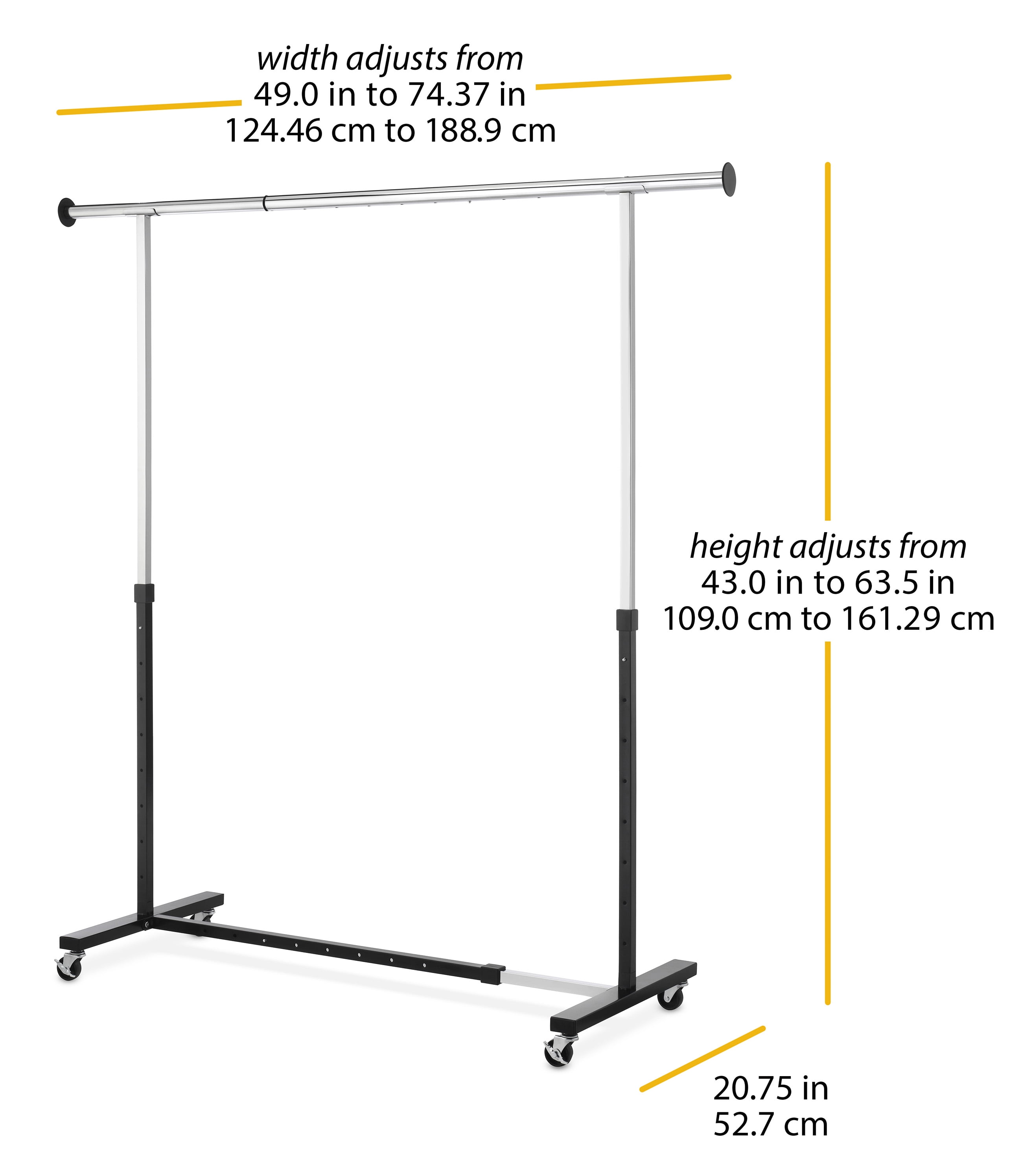 Garment Rack: Includes a 10-year limited warranty Height adjusts from 43 to 63.5 inches; Width adjusts from 49 to 74.375 inches Easy pushpin adjustability on the frame and base Assembled Dimensions: 20.75 L x 74.38 W x 63.50 H inches. Easy assembly with tools included Durable, heavy-duty all-metal construction with commercial-grade locking wheels Functional and versatile garment storage that adapts to your needs Whitmor Style# 6021-7276, Adjustable Rolling Expandable Garment Rack, Metal, Black and Chrome
