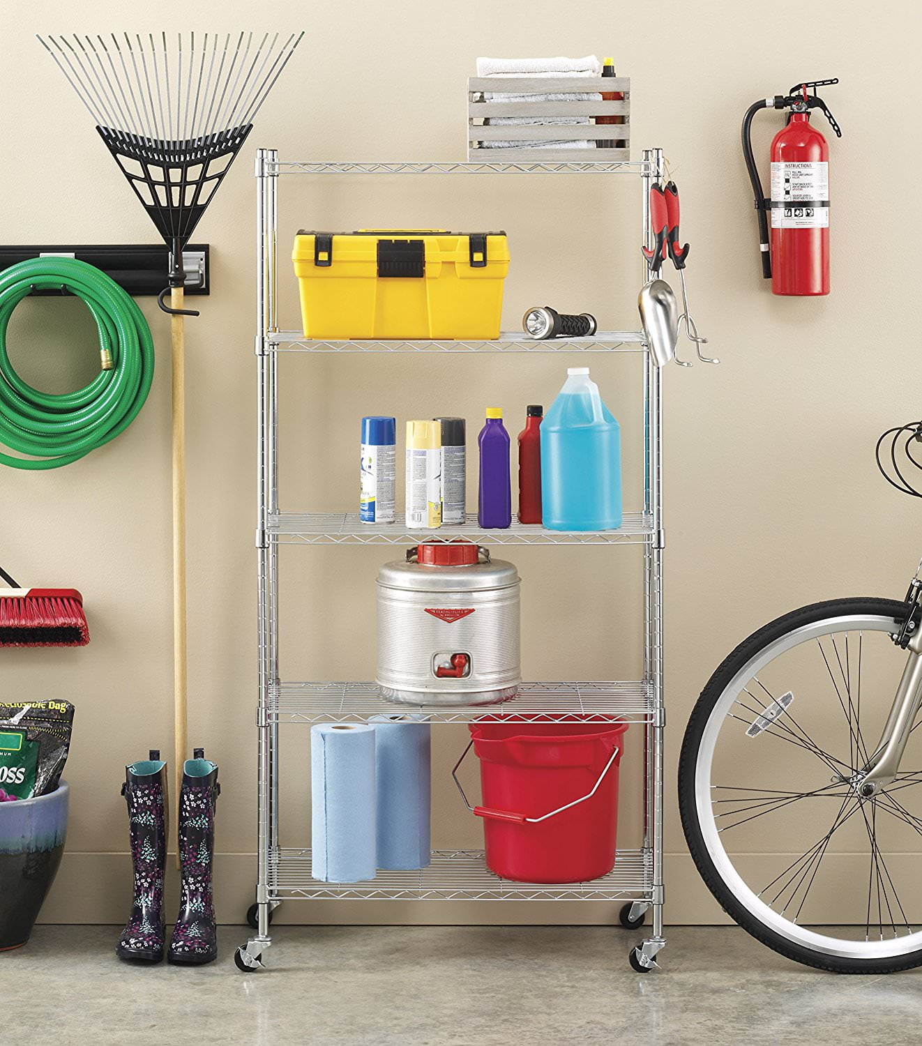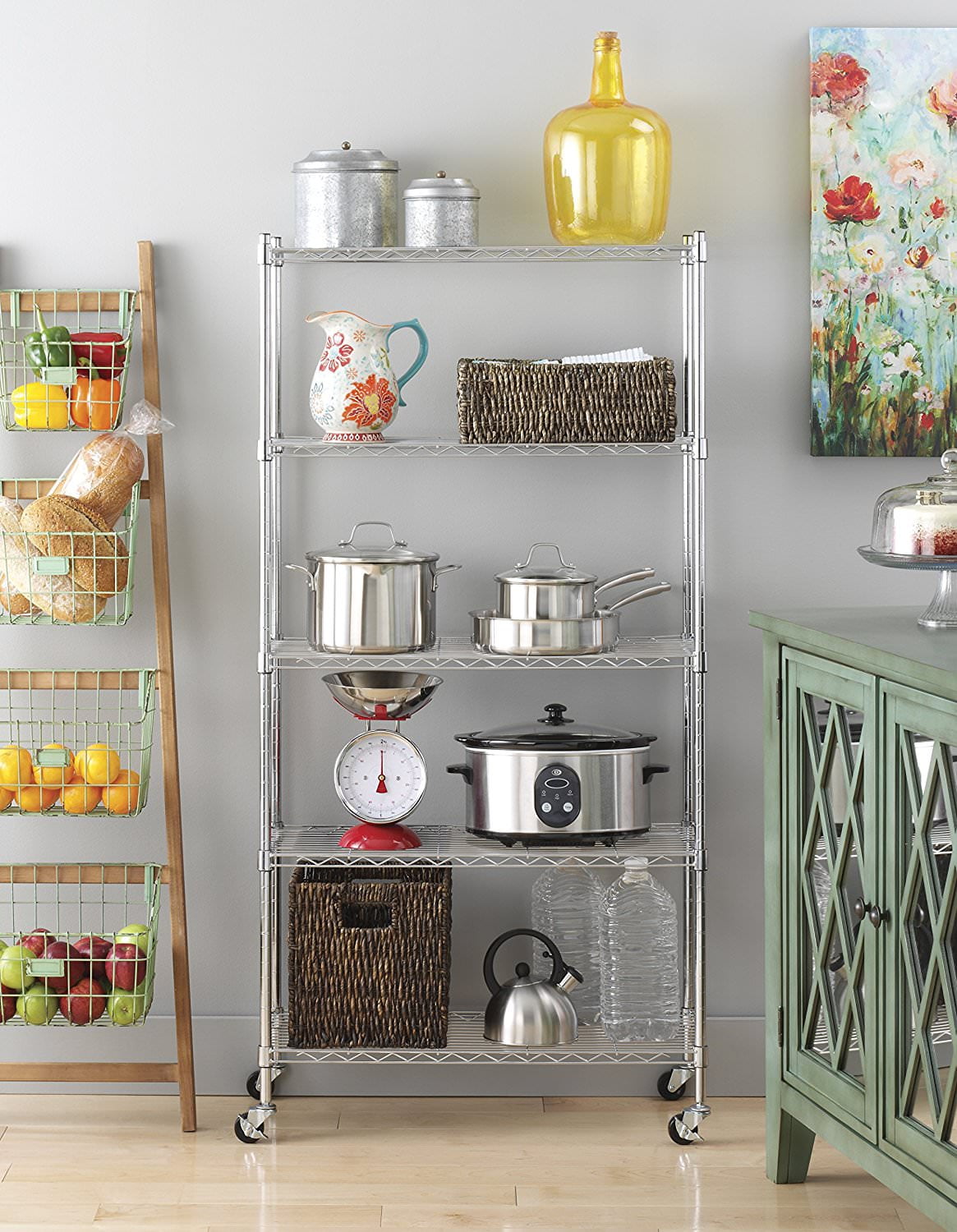 The Whitmor Supreme cart is an ideal addition to any home. This utility cart features five convenient shelves to store anything from canned goods, kitchen appliances, or tools. These shelves can also be adjusted in 1-inch increments to accommodate objects of various sizes. Each shelf can hold up to 250 lbs. each without wheels attached. With the wheels, the shelf capacity is 200 lbs. This multipurpose utility cart can be used in the kitchen, garage, or even in the laundry room. It has a chrome finish and can be wiped clean with a soft, dry cloth to maintain its original appearance for a long time.