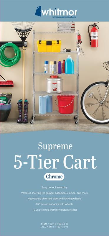 Whitmor 5-Tier Rolling Cart Steel shelves adjust in 1-inch increments to accommodate various-sized items 250 lb. per shelf weight capacity without the wheels and 200 lb. per shelf capacity, if the wheels are attached Heavy-duty steel with rolling casters and adjustable leveling feet included Assembled Dimensions: 14.25 L x 30.125 W x 60.375 H inches Easy assembly with the tools provided 5-shelf shelving unit for your kitchen, office, garage, and more Includes a 10-year limited warranty Style# 6056-3528, Supreme 5-Tier Cart – Rolling Utility Organizer – Chrome