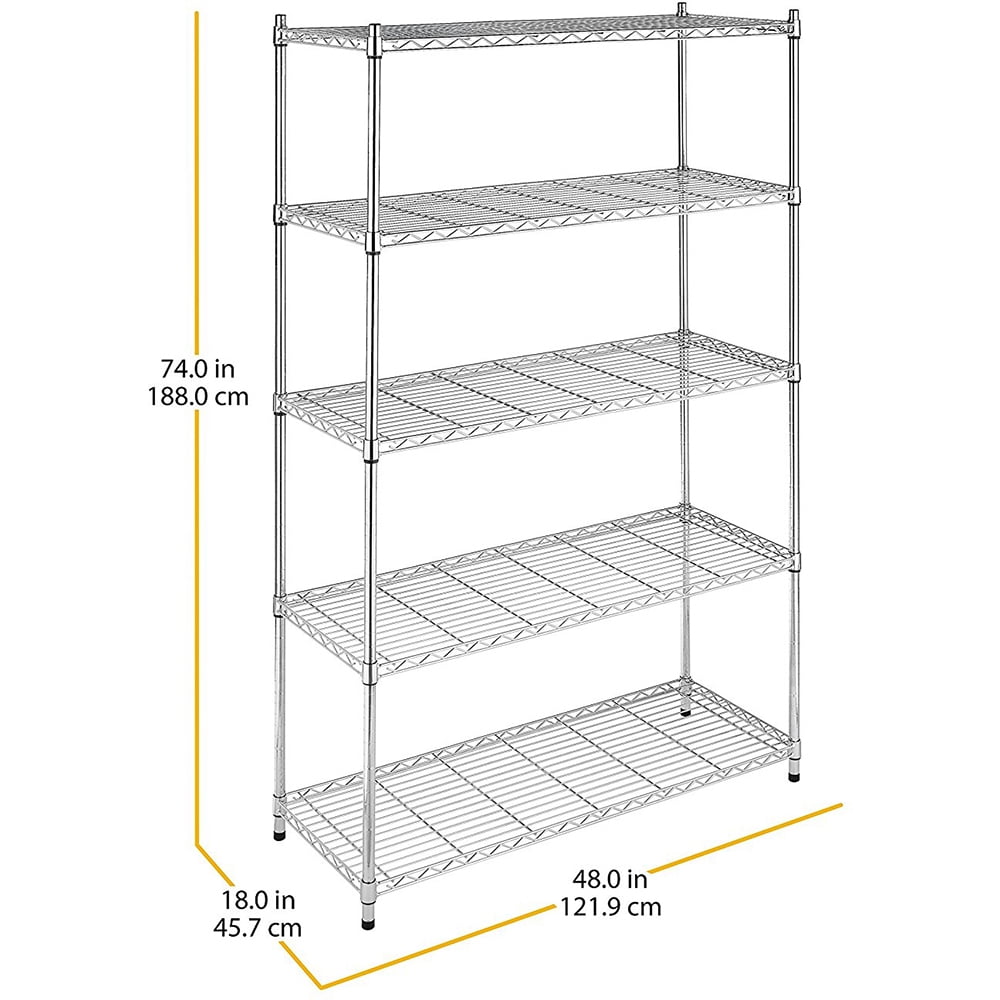Freestanding Shelves Durable steel construction with leveling feet and grid wire shelves that adjust in 1″ increments. Whitmor’s Supreme 5-Tier Storage Shelves are NSF-approved for industrial or residential use Wipe clean with a damp cloth Easy no tools required assembly Product Type: Storage Rack Color: Chrome Material: Steel Number of Tiers: 5 Assembly Required: Yes. Style # 6058-3885, Supreme Adjustable 5-Shelf Freestanding Shelves, Silver Adult use