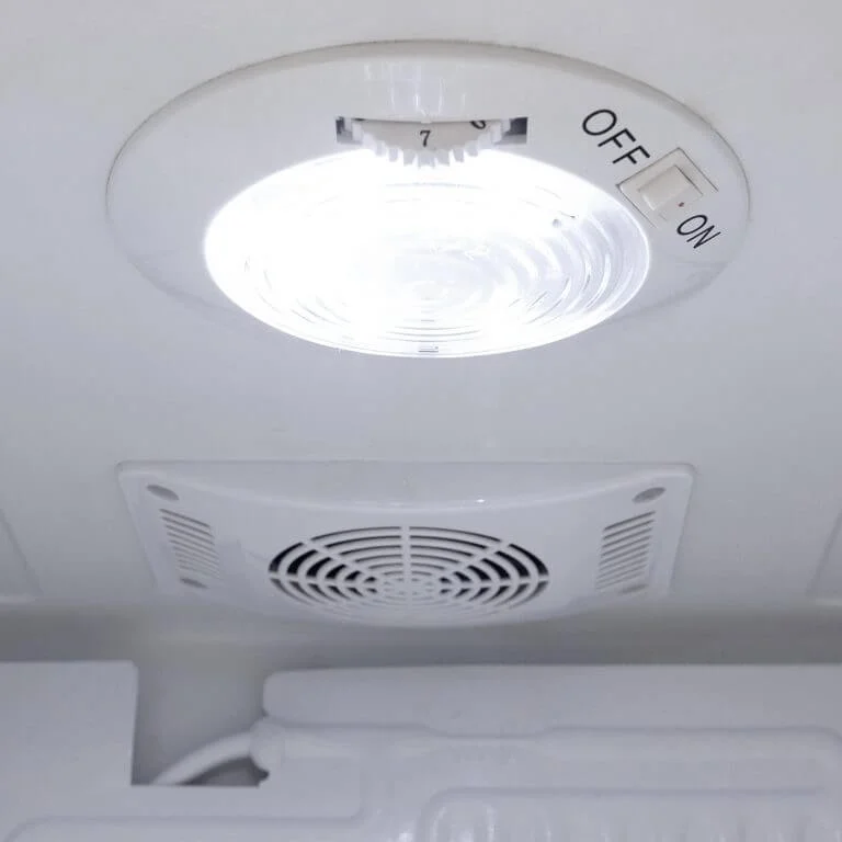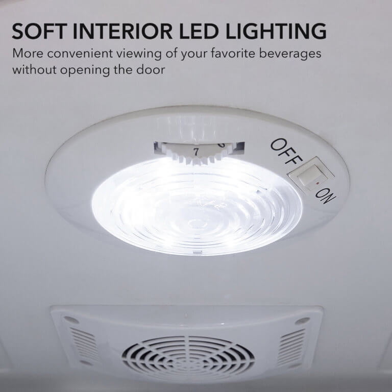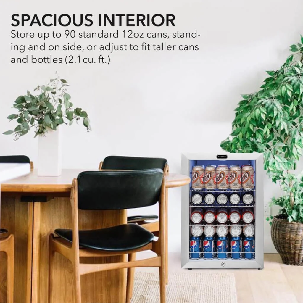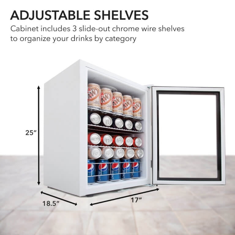 Impressive 90-can capacity Sleek and durable stainless steel housing with a white finish complements any kitchen or home decor 3 slide-out wire shelves provide flexible storage options Double-pane glass doors offer superior UV isolation and energy efficiency Powerful compressor and internal air-cooled system maintain a temperature range of 30 to 60 degrees Fahrenheit for optimal beverage chilling Internal fan-forced circulation ensures even temperature distribution throughout the refrigerator Key locking reversible door allows you to customize the door swing direction to suit your space Soft interior LED light with on/off switch illuminates the contents for easy viewing Quiet operation at 44 dBA or less, making it ideal for any room in your home Operates on 115V/85 Watts power for efficient and reliable performance Durable stainless steel construction for long-lasting use Compact dimensions of 17.5” D x 17” W x 25” H and a weight of 49 pounds make it easy to place in your desired location Backed by a 1-year manufacturer’s warranty