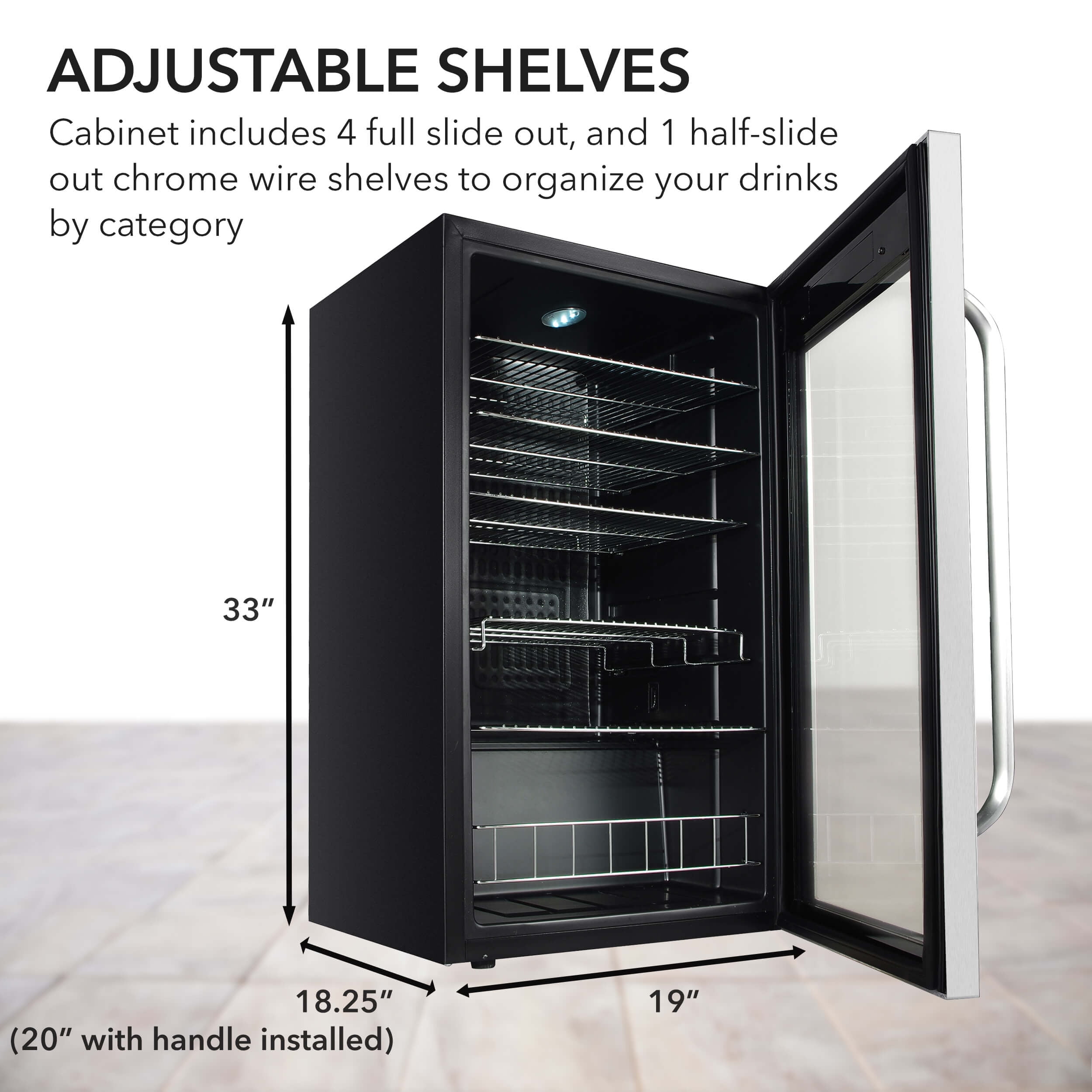 Efficiently store all your beverages in 1 sleek and convenient appliance with the Whynter Freestanding Beverage Refrigerator Designed with a high profile fan-forced flush back, allowing it to fit cleanly against the wall or into a corner Holding 121 cans, the cabinet includes 4 full slide-out shelves and 1 half-slide out chrome wire shelf to organize your drinks by category Features fan-forced circulation to maintain an evenly-cooled space and consistent temperatures The Cylinder Lock provides protection and additional security from unauthorized access to your beverage refrigerator Material: Metal, glass Color: Silver Dimensions (L x W x H): 18.25 x 19.00 x 33.00 inches Weight: 61.00 pounds Manufacturer warranty: 1 year