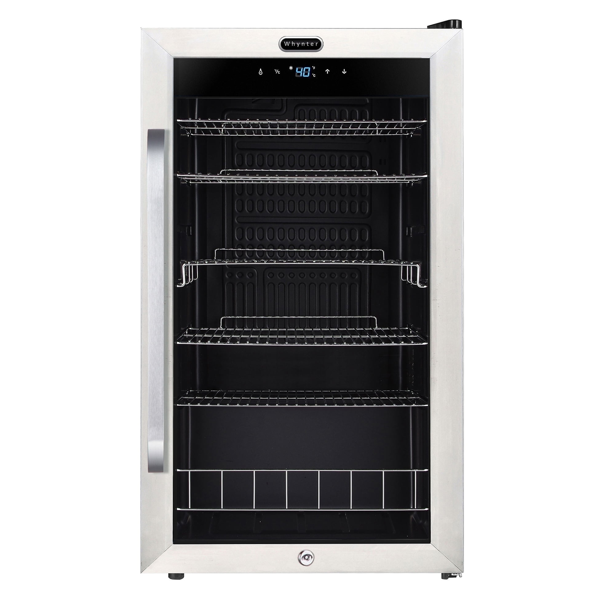 Efficiently store all your favorite beverages in a single sleek and convenient appliance with the Whynter Freestanding Beverage Refrigerator. This elegant and freestanding unit will hold, refrigerate, and display up to 121 standard 12-ounce cans. Keep your drinks fresh with this refrigerator’s intuitive touch screen temperature control, which allows for temperatures ranging from 34 – 43º Fahrenheit. Featuring fan-forced circulation, the unit works to maintain an evenly-cooled space and consistent temperatures. Secure your drinks with the built-in door lock and two keys. The Cylinder Lock provides protection and additional security from unauthorized access to your beverage refrigerator. You and your guests will appreciate the stainless steel trimmed glass door, and sleek black cabinet. The tempered double pane glass offers UV protection and lets you easily check your drink inventory. In addition, soft interior LED lighting can be set at the flip of a switch. The cabinet includes 4 full slide-out shelves and 1 half-slide-out chrome wire shelf to organize your drinks by category. Enjoy convenience and sleek style with the Freestanding Beverage Refrigerator from Whynter.