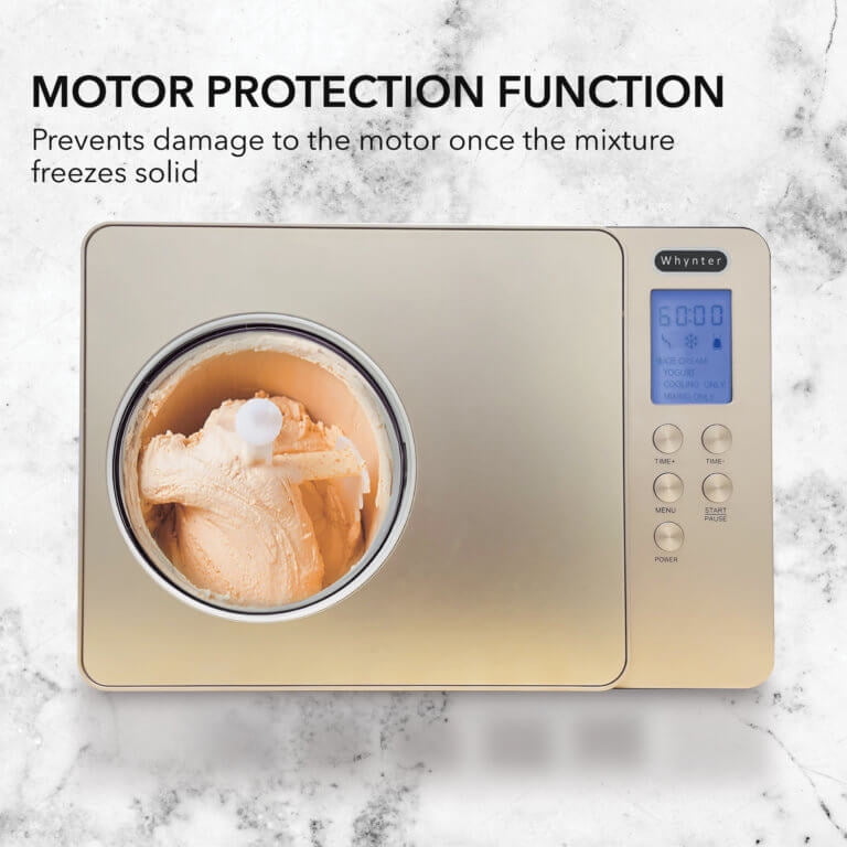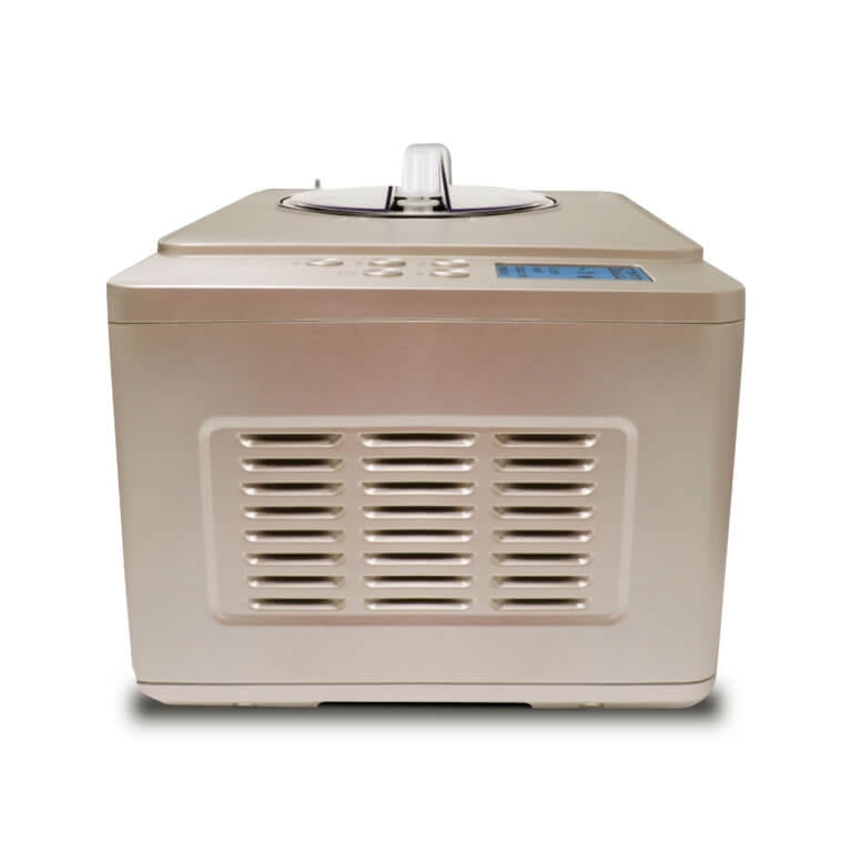 Champagne gold color stainless steel housing for a luxurious look and feel Self-contained frozen dessert maker that does not require pre-freezing the bowl, allowing for continuous use Yogurt Incubator function to make fresh and healthy all-natural yogurt, from traditional to Greek styles Removable stainless steel bowl and BPA-free churn blade for effortless cleaning Reliable built-in audible timer to ensure your frozen treats are ready at the perfect time Motor Protection Function that automatically shuts off the machine to prevent damage if the mixture freezes solid LCD timer control for easy monitoring and adjustments 2-quart capacity to make up to two quarts of your favorite frozen dessert or yogurt in a single batch High efficiency CFC-free compressor for efficient and eco-friendly operation Cooling temperature range of -0.4ºF to -31ºF for the ice cream function and heating temperature range of 104ºF to 110ºF for the yogurt function ETL certified for safety and quality assurance Product dimensions: 16.75″W x 11.25″D x 10.25″H