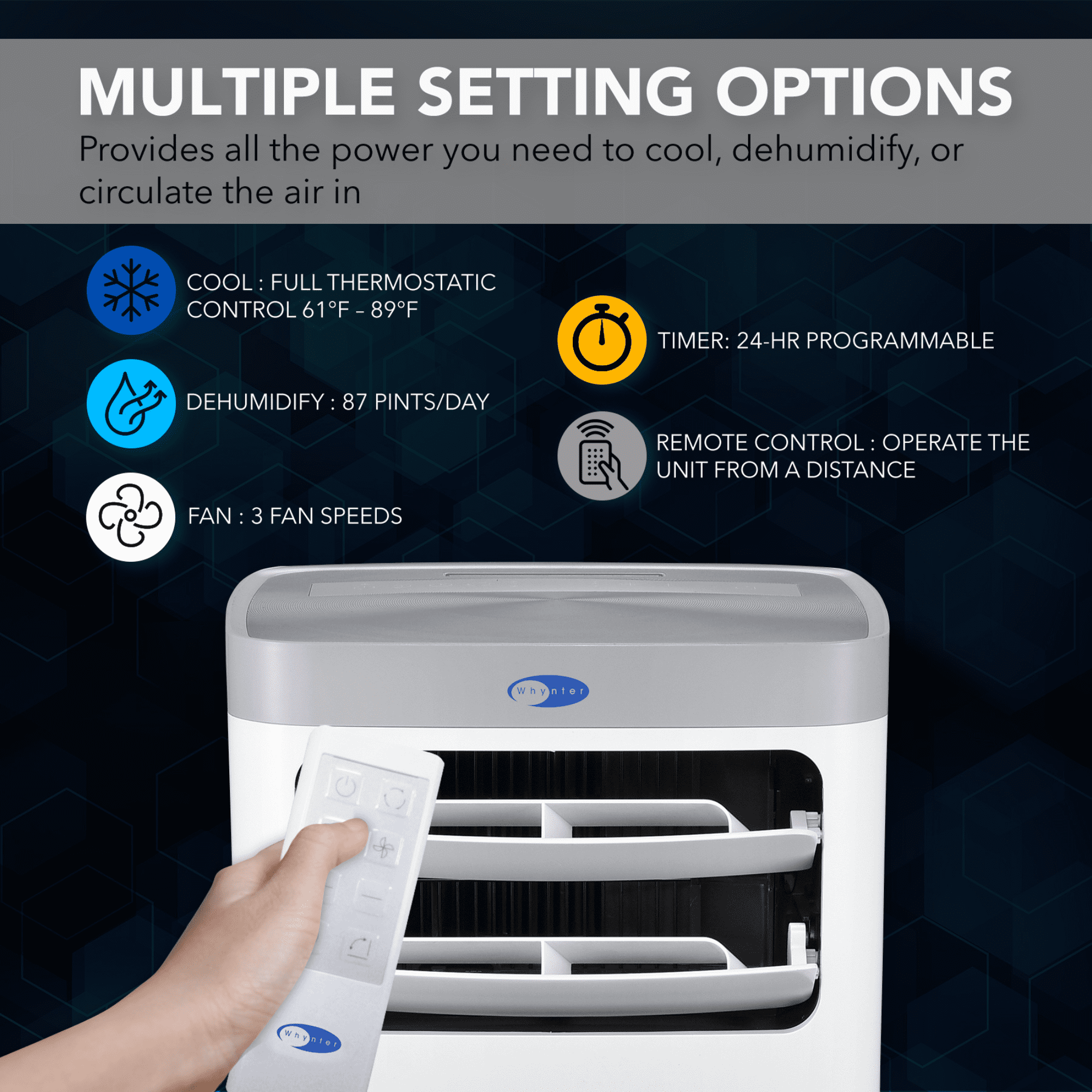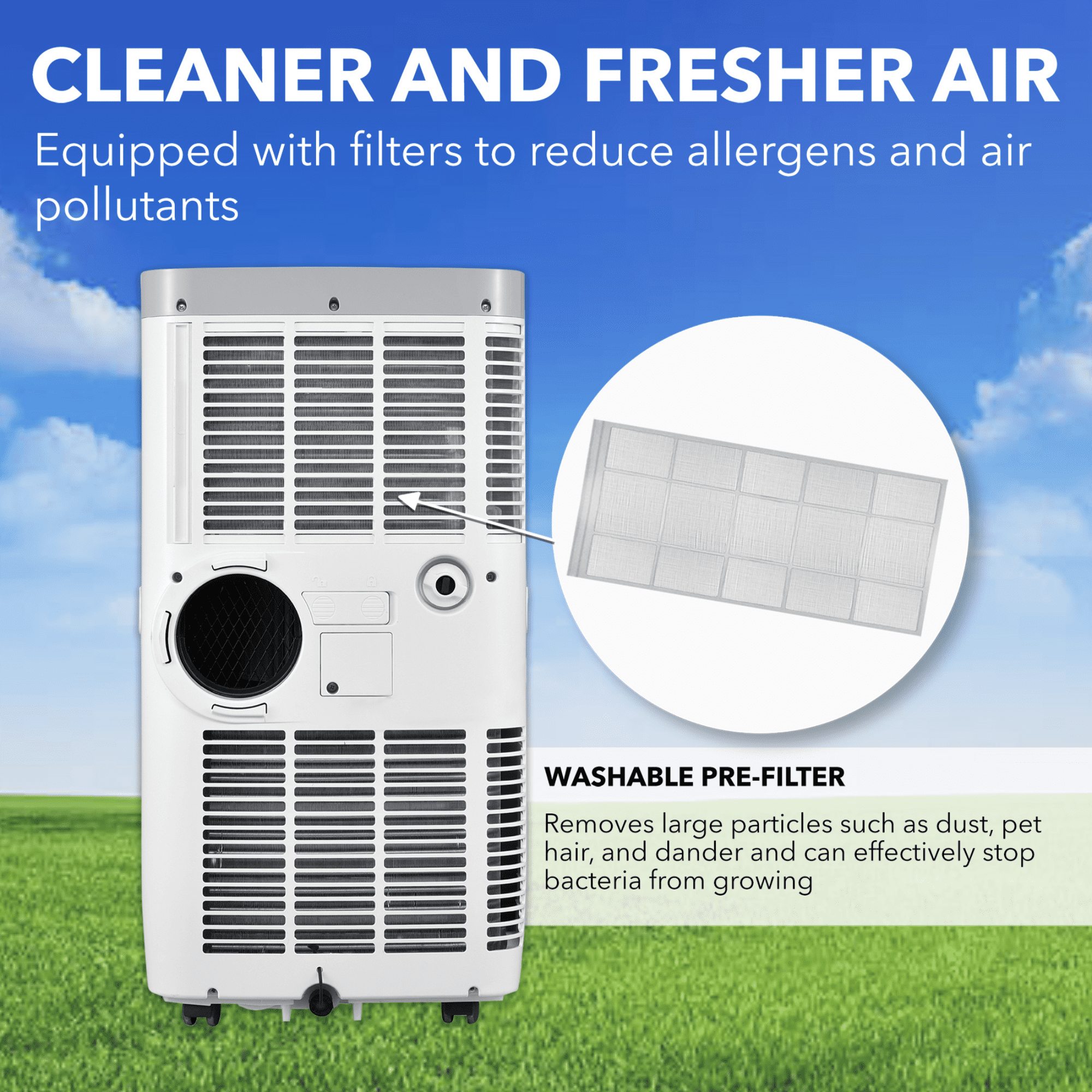 Delivers powerful 11,000 BTU cooling power and 6,800 BTU SACC to efficiently cool spaces up to 400 square feet Features a patented auto drain function that fully exhausts all condensate automatically in most environments Offers three operational modes – Cool, Dehumidify, and Fan – to provide versatile climate control Removes up to 87 pints of excess moisture per day, improving air comfort Designed to provide quiet and efficient cooling with no permanent installation required Includes three fan speeds (Low, Medium, High) to customize airflow Provides full thermostatic control with a temperature range of 61°F to 89°F Automatically restarts after a power outage, maintaining your selected settings R32 refrigerant for more efficiently conveys heat and reduce electricity consumption