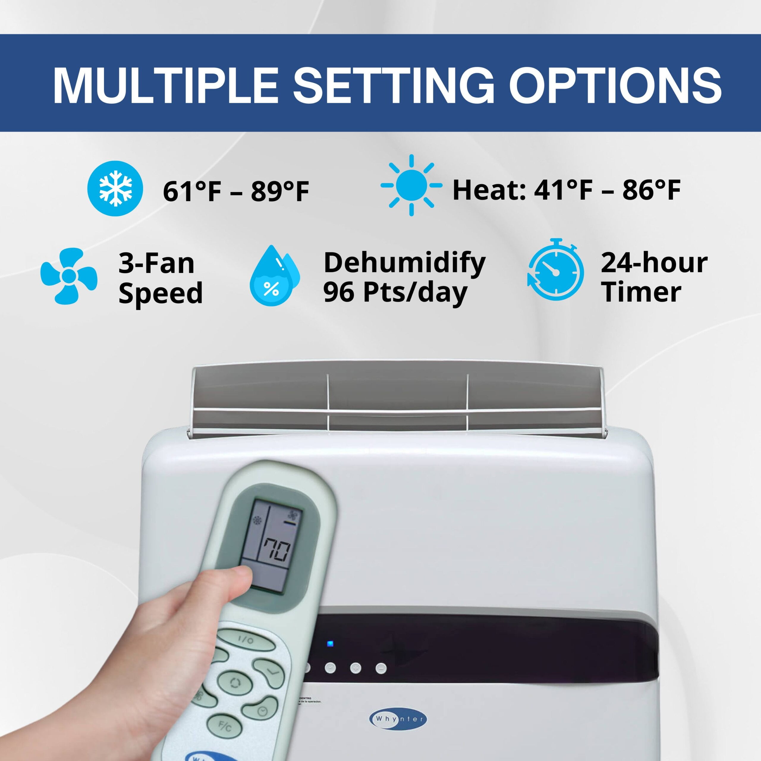 Dual hose operation for fast and efficient cooling Digital and remote control for easy temperature, fan speed, and mode adjustments Sleek Frost White color to complement any room decor Versatile unit with multiple operating modes including fan, dehumidifier, heater, and air conditioner Lowest temperature setting of 61 Fahrenheit to keep you comfortable Covers up to 400 sq. ft. of space for efficient cooling Powerful 12,000 BTU cooling capacity for effective climate control 9,500 BTU Heating Efficiency Compact design with overall dimensions of 34″ H x 20″ W x 16.5″ D and a weight of 95 lbs for easy portability Certified for both commercial and residential use Eco-friendly CFC-free R-410A refrigerant for a greener footprint